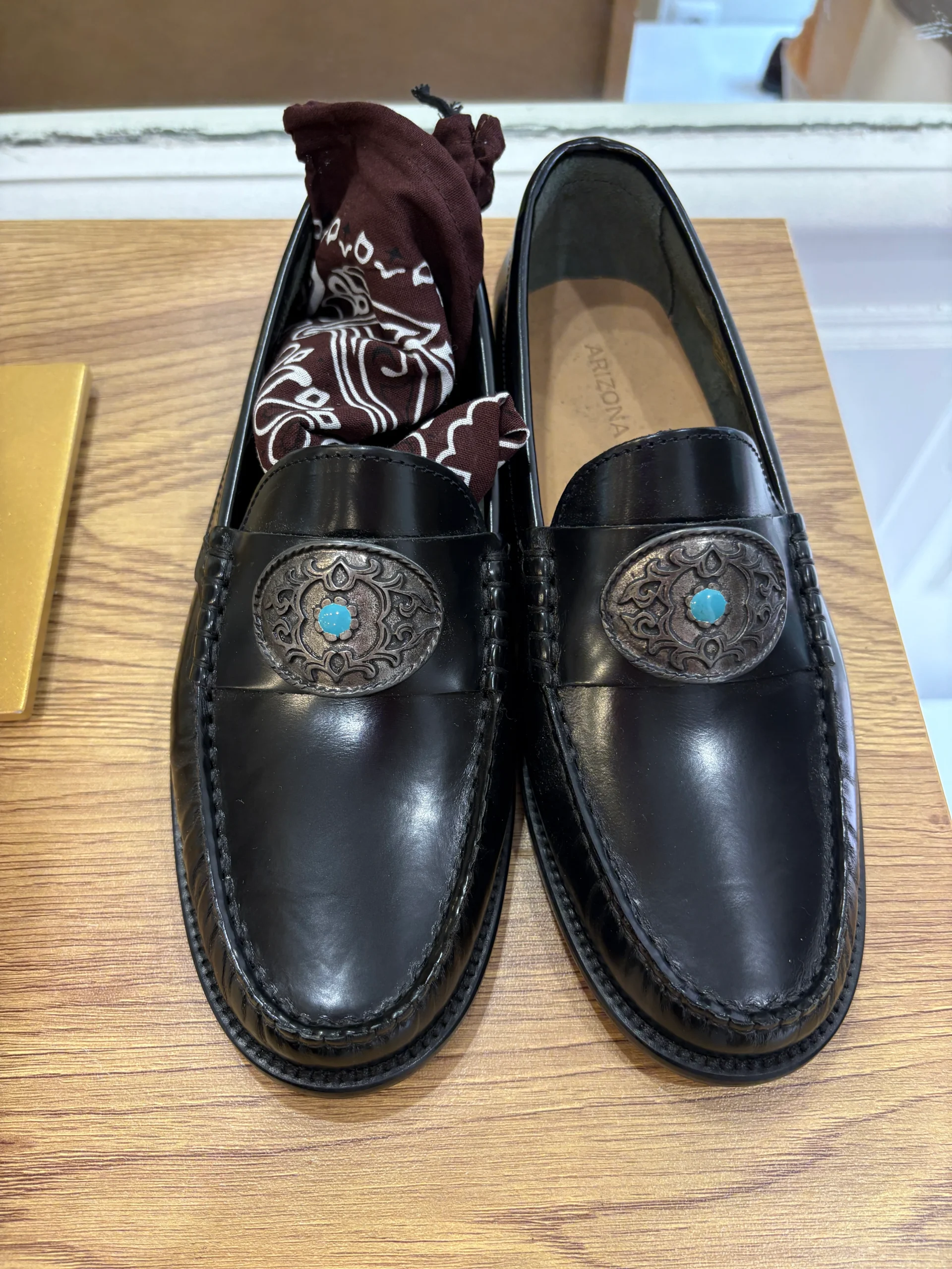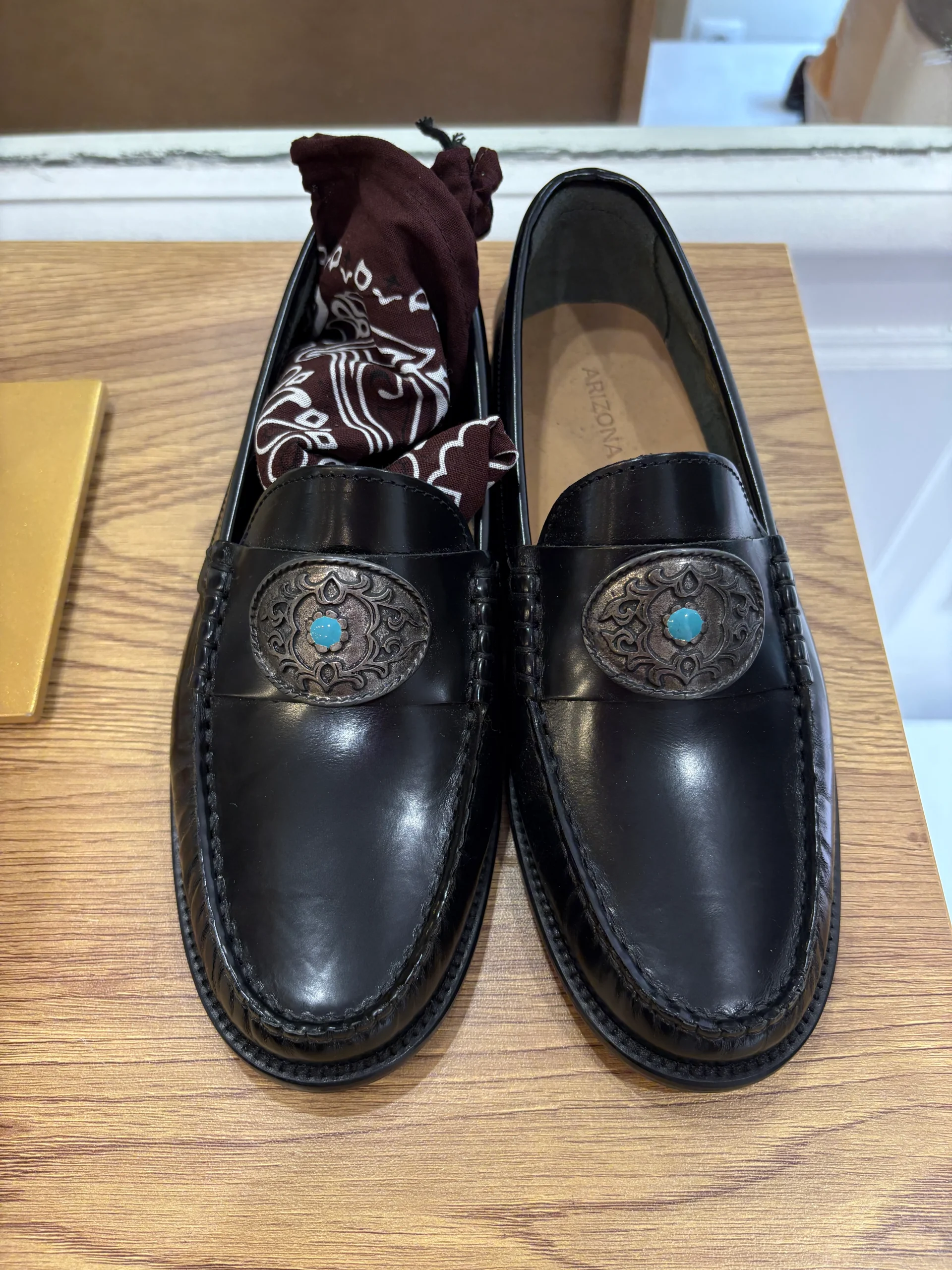 Ces mocassins en cuir noir 100 % pleine fleur allient élégance intemporelle et esprit western raffiné. Leur patine lisse met en valeur une boucle argentée ciselée, ornée d’une pierre turquoise, signature d’un style à la fois audacieux et sophistiqué. Entièrement réalisés en cuir, ils offrent un confort durable et une finition haut de gamme, parfaits pour sublimer un look habillé ou casual chic.