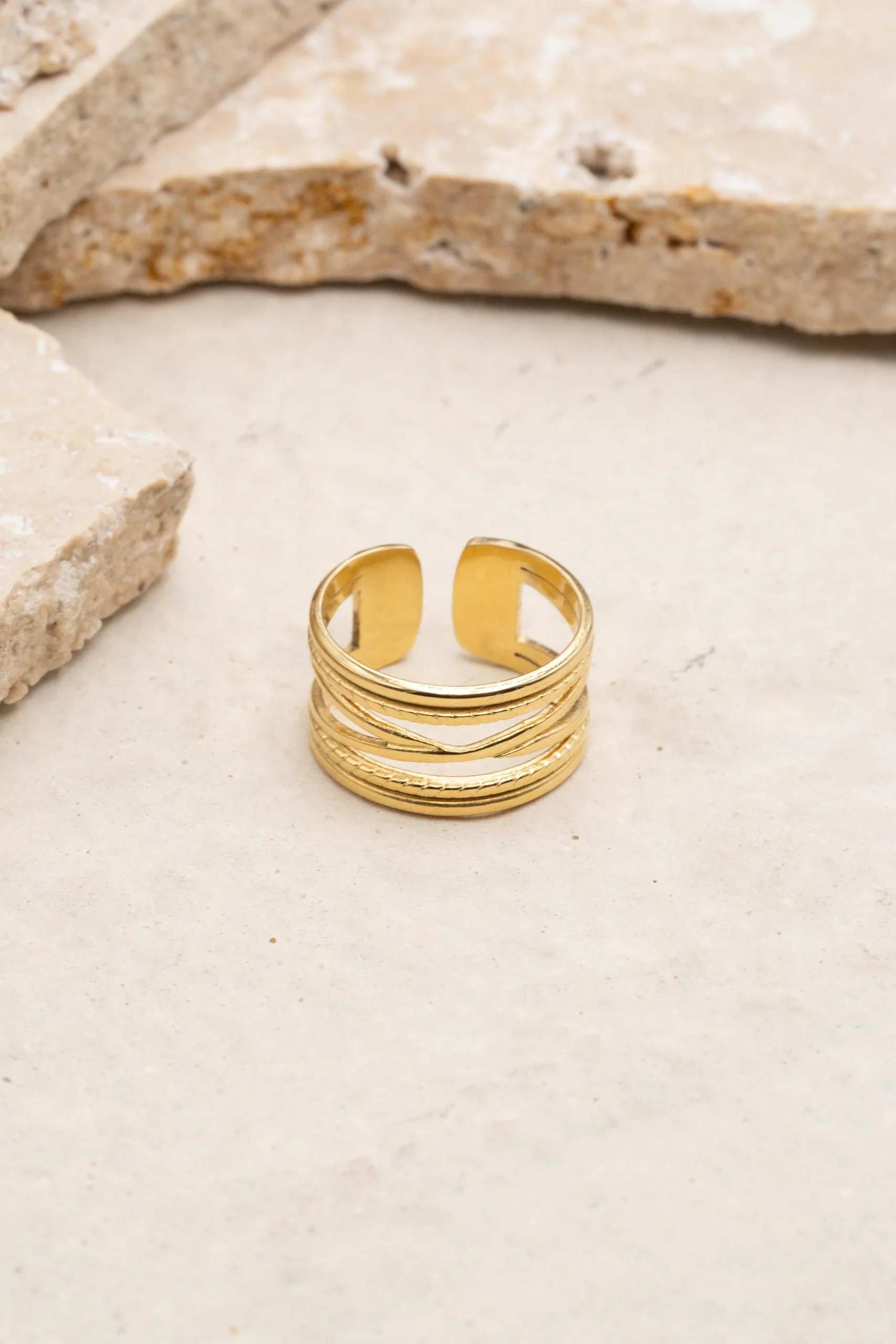 Bague en acier inoxydable composée de trois rangs, deux effet lisser et d’un anneau central torsadé.