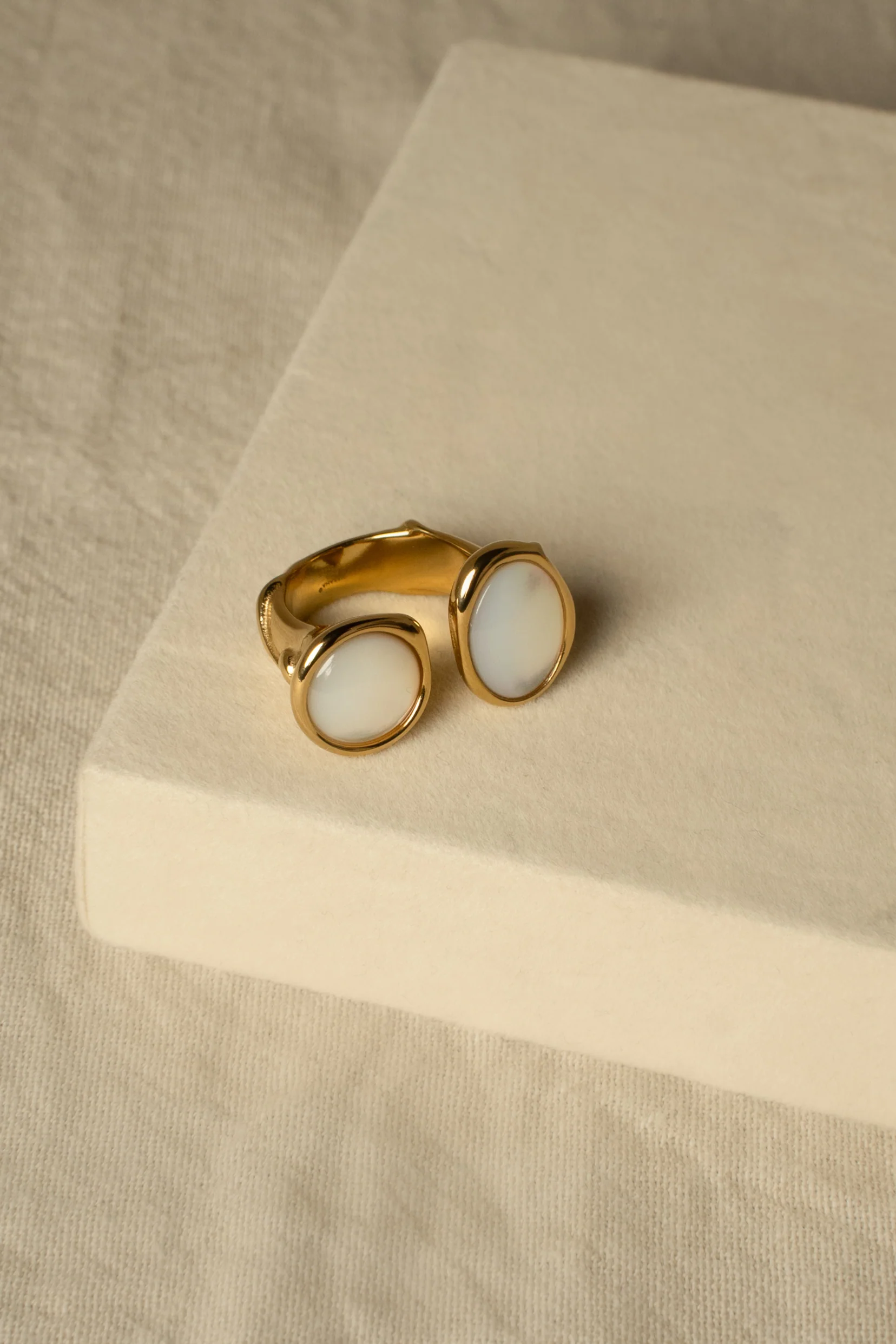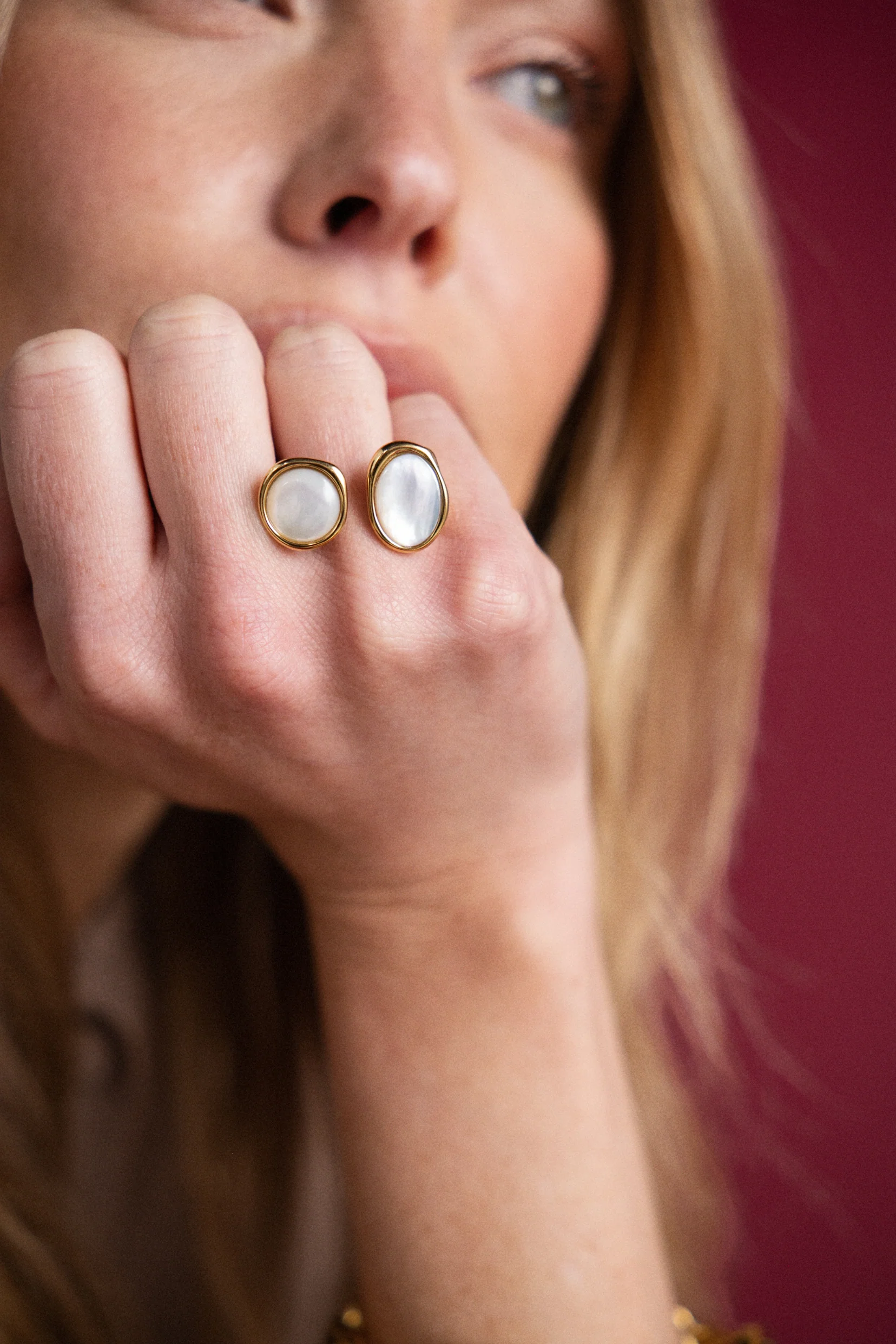 Ses deux pierres de nacre blanche, lumineuses et nacrées, reflètent la lumière avec une douceur presque poétique.