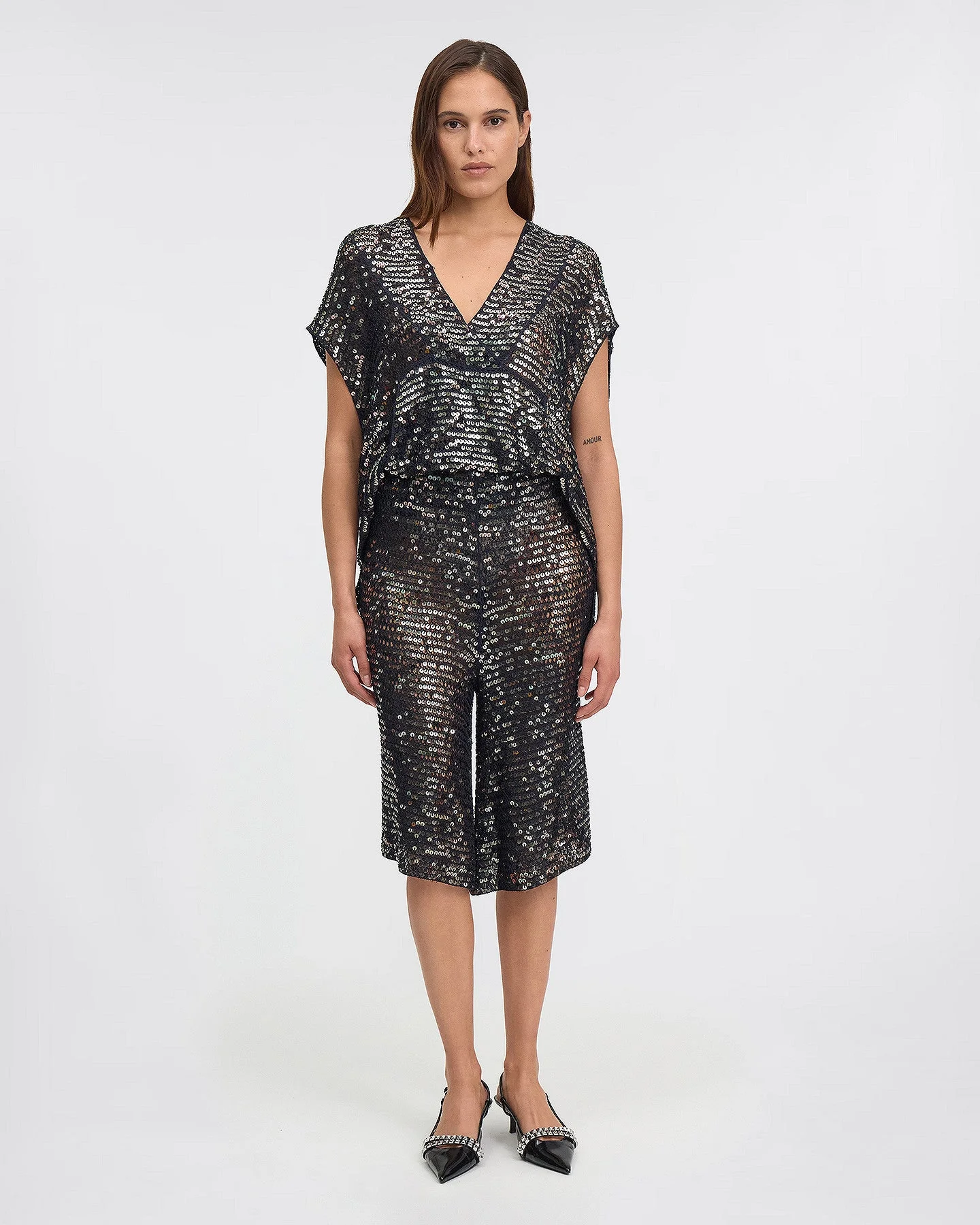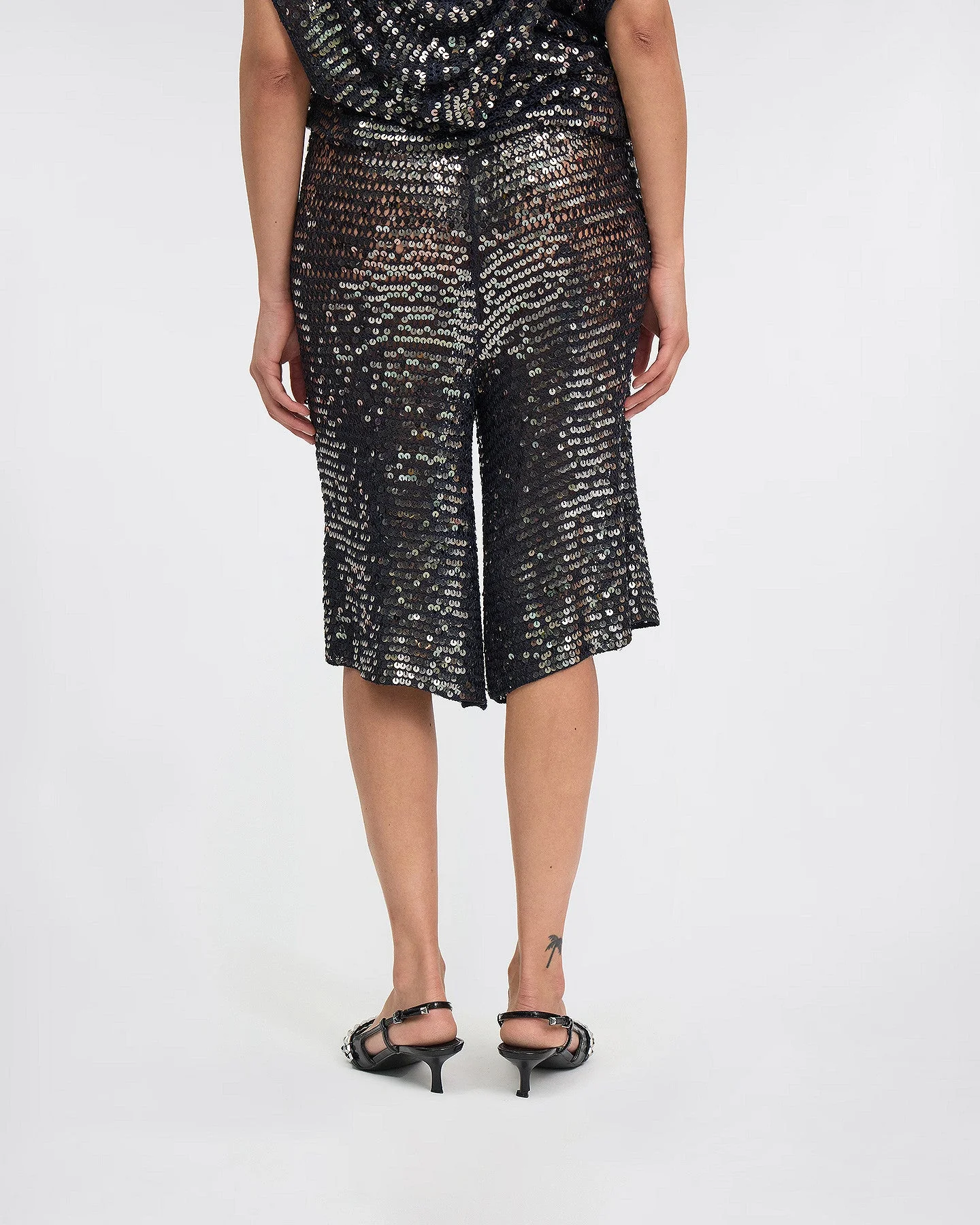 Notre dernier modèle de bermuda en filet de sequins est une pièce élégante et tendance pour ajouter une touche de glamour à votre garde-robe!Confectionné dans un tissu fluide de couleur anthracite qui épouse parfaitement vos courbes, ce bermuda offre un confort optimal grâce à sa taille élastique et la souplesse de sa matière. Sa brillance subtile attire les regards et ajoute une touche de sophistication à n’importe quelle tenue.