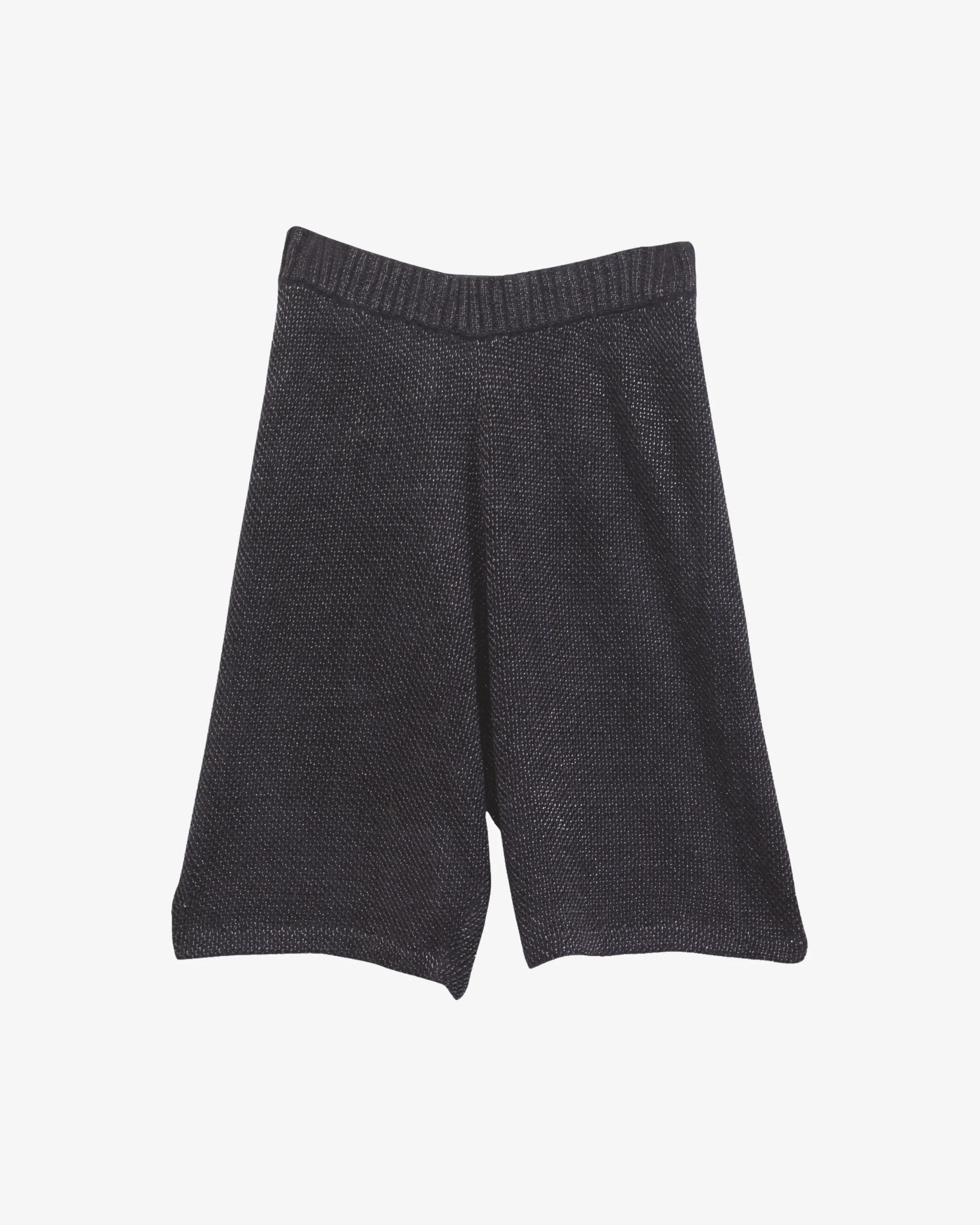 Ce bermuda en maille de couleur bleu marine se distingue par son tissage dense et texturé, intégrant de discrets reflets scintillants qui apportent une touche de lumière sophistiquée à la matière. Sa silhouette confortable présente une coupe évasée et une taille haute élastiquée à larges côtes, offrant un ajustement parfait et une allure à la fois décontractée et élégante.