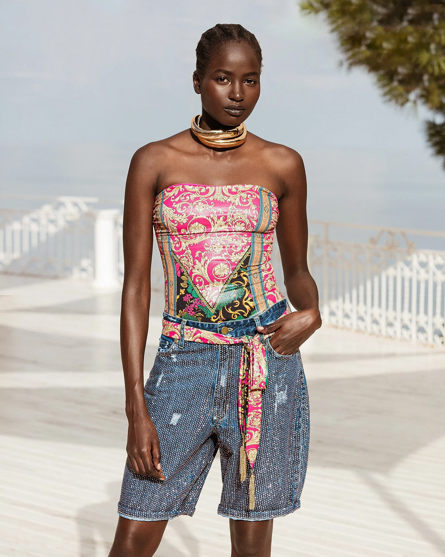 Rencontre créative entre une base de jeans et des micro strass de couleur bronze pour donner vie à un splendide bermuda. A porter façon décontractée ou bien sophistiquée. Une alternative créative entre pantalon et short.