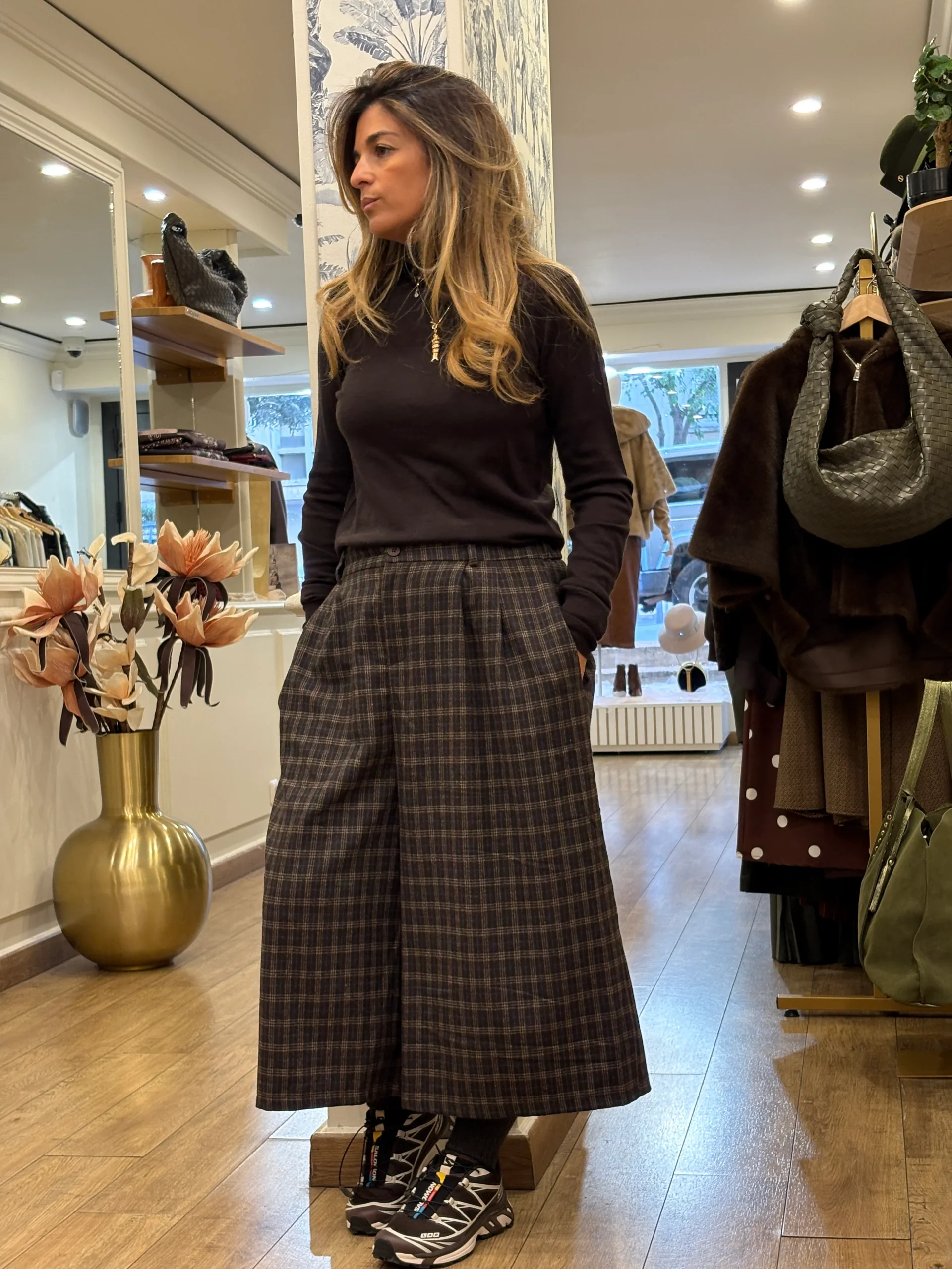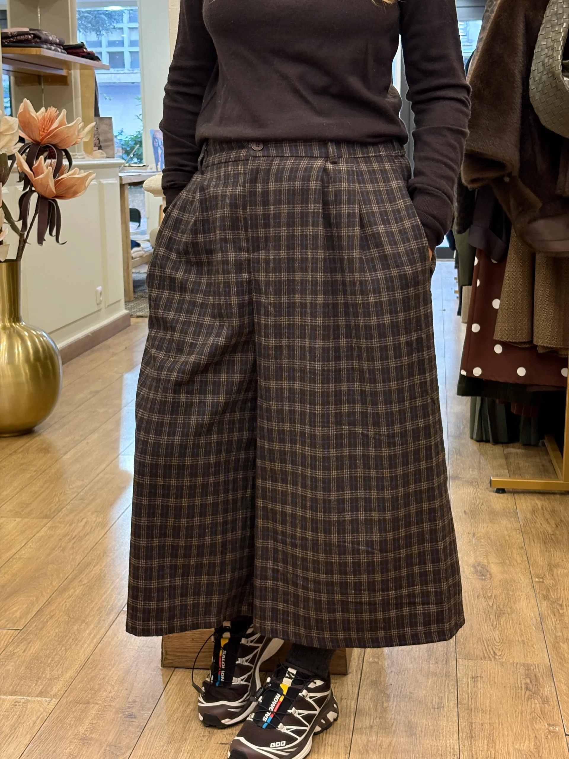 Taille haute, il souligne bien la ligne de la taille puis s’évase sur la jambe avec un volume fluide qui arrive au-dessus de la cheville, ce qui allonge la silhouette. Le tissu est en laine mélangée (effet lainage chaud et souple) avec un carreau discret, chic et facile à porter aussi bien en version bleu/gris qu’en version brun/chocolat.