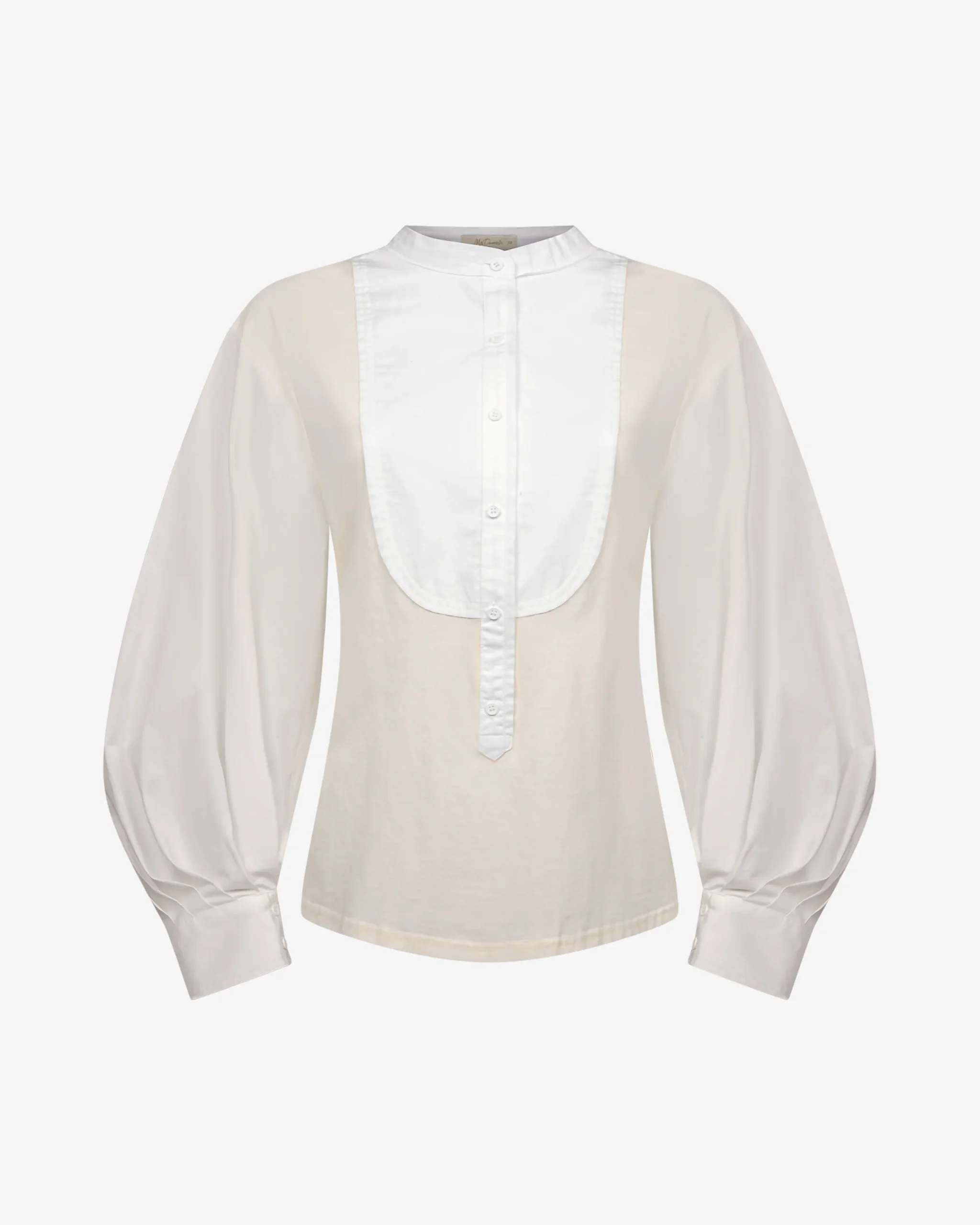 Cette chemise écrue se distingue par son mariage subtil de matières, combinant le coton classique et le jersey confortable. Les manches, inspirées par le style volumineux à la D’Artagnan, ajoutent une touche dramatique et audacieuse. La coupe et le col droit confèrent à la chemise une allure épurée et contemporaine, tout en mettant en valeur le contraste entre les textures des tissus.