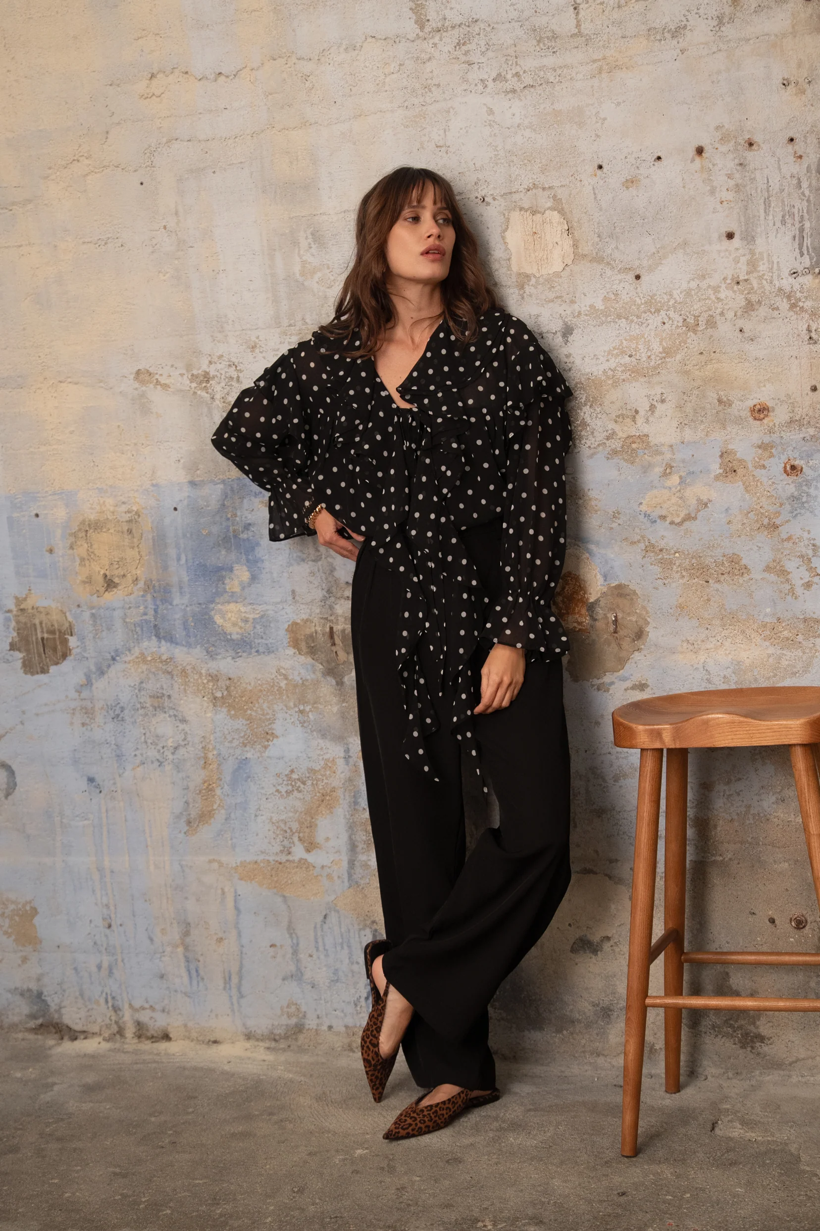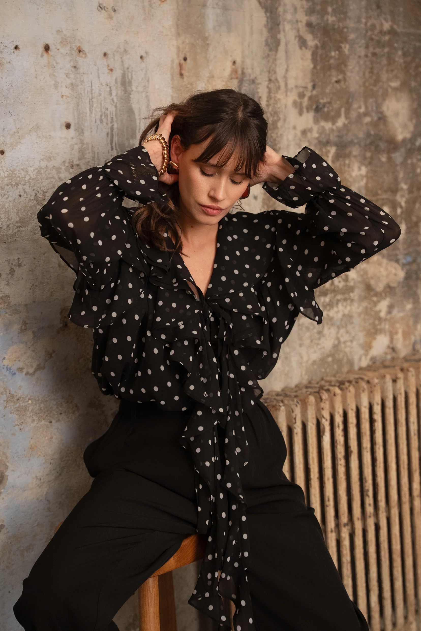 Ses pois délicats et sa transparence subtile jouent avec la lumière, révélant une féminité douce et assumée. Son col volanté et ses détails froncés lui apportent du mouvement, tandis que sa coupe fluide flatte la silhouette avec naturel.