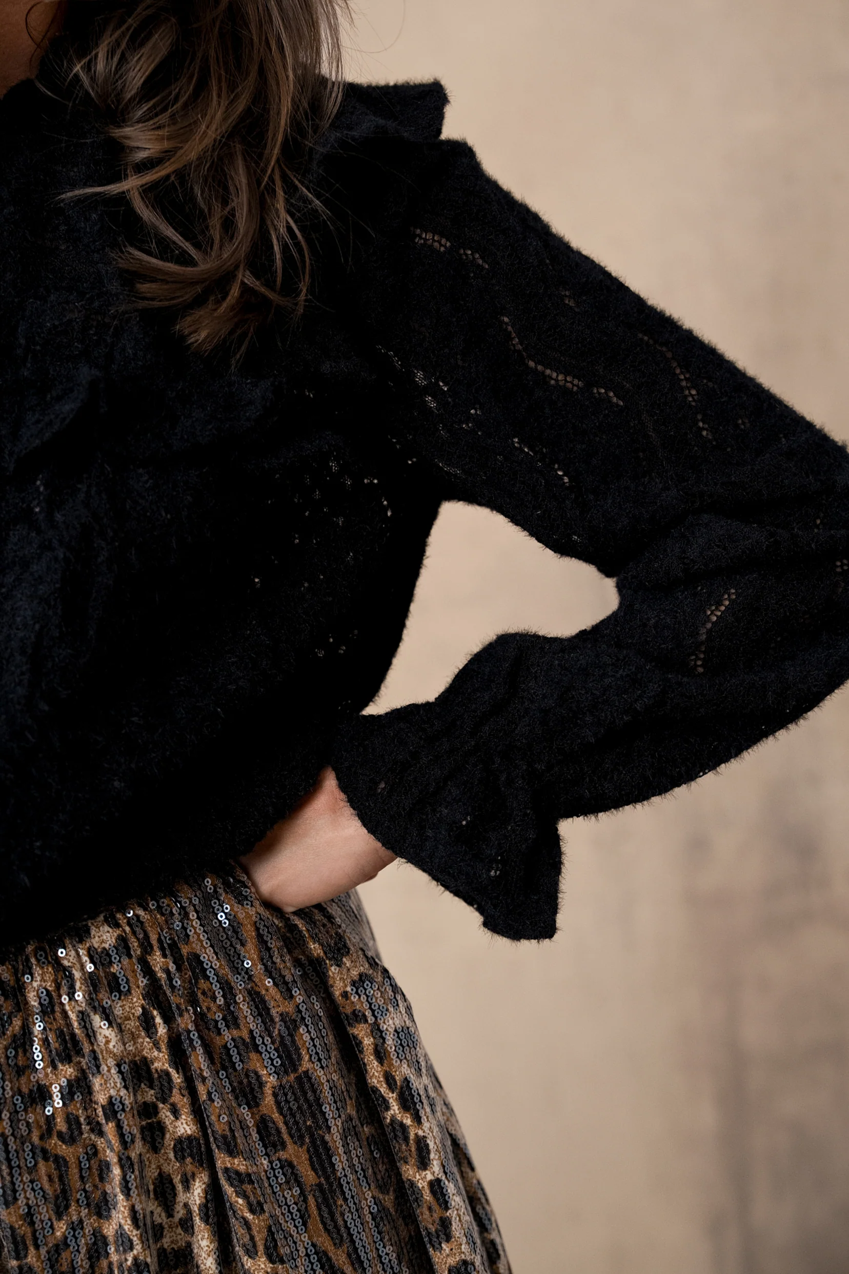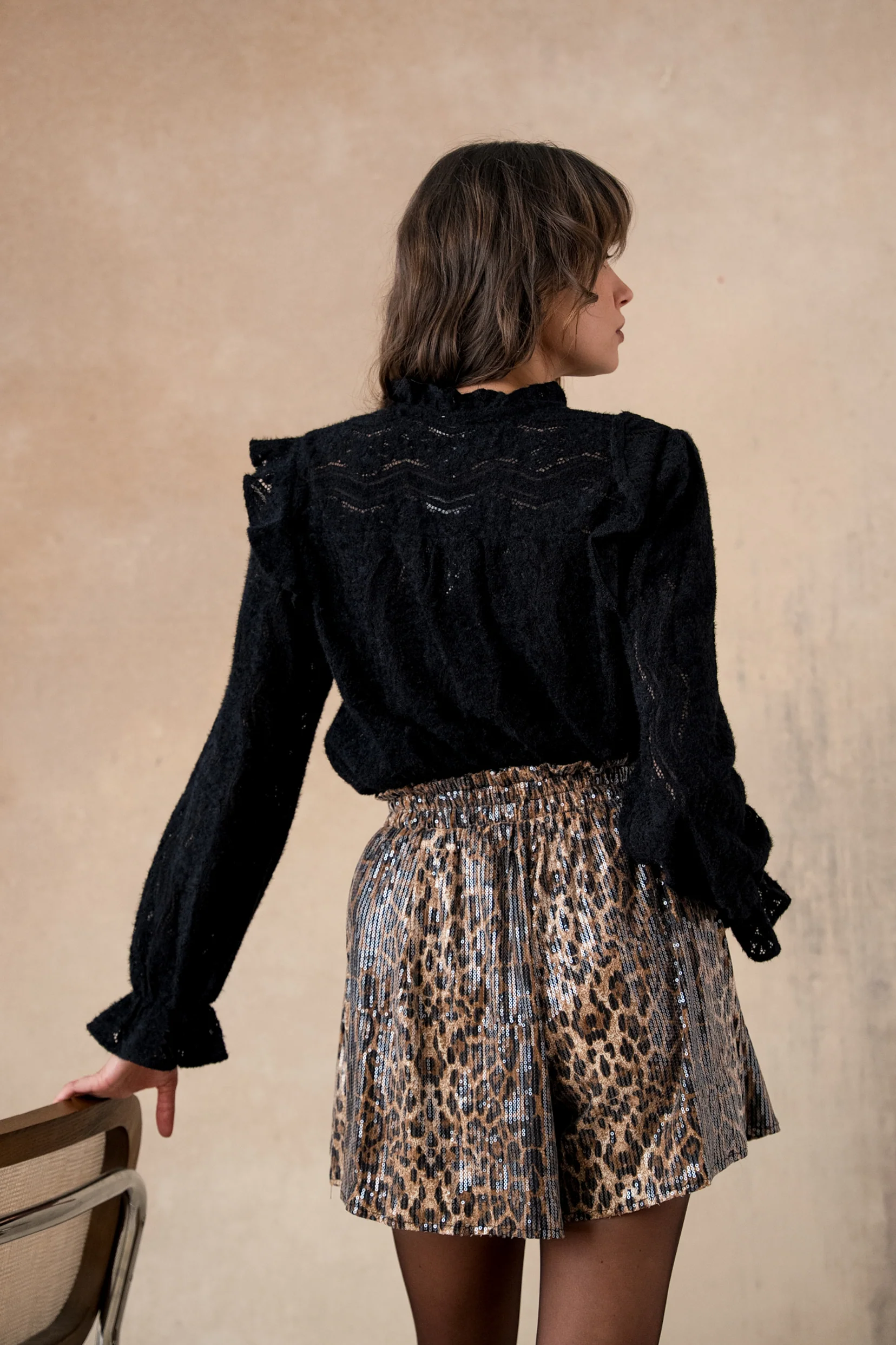 Florence, c’est la blouse noire qui ose la féminité avec subtilité.