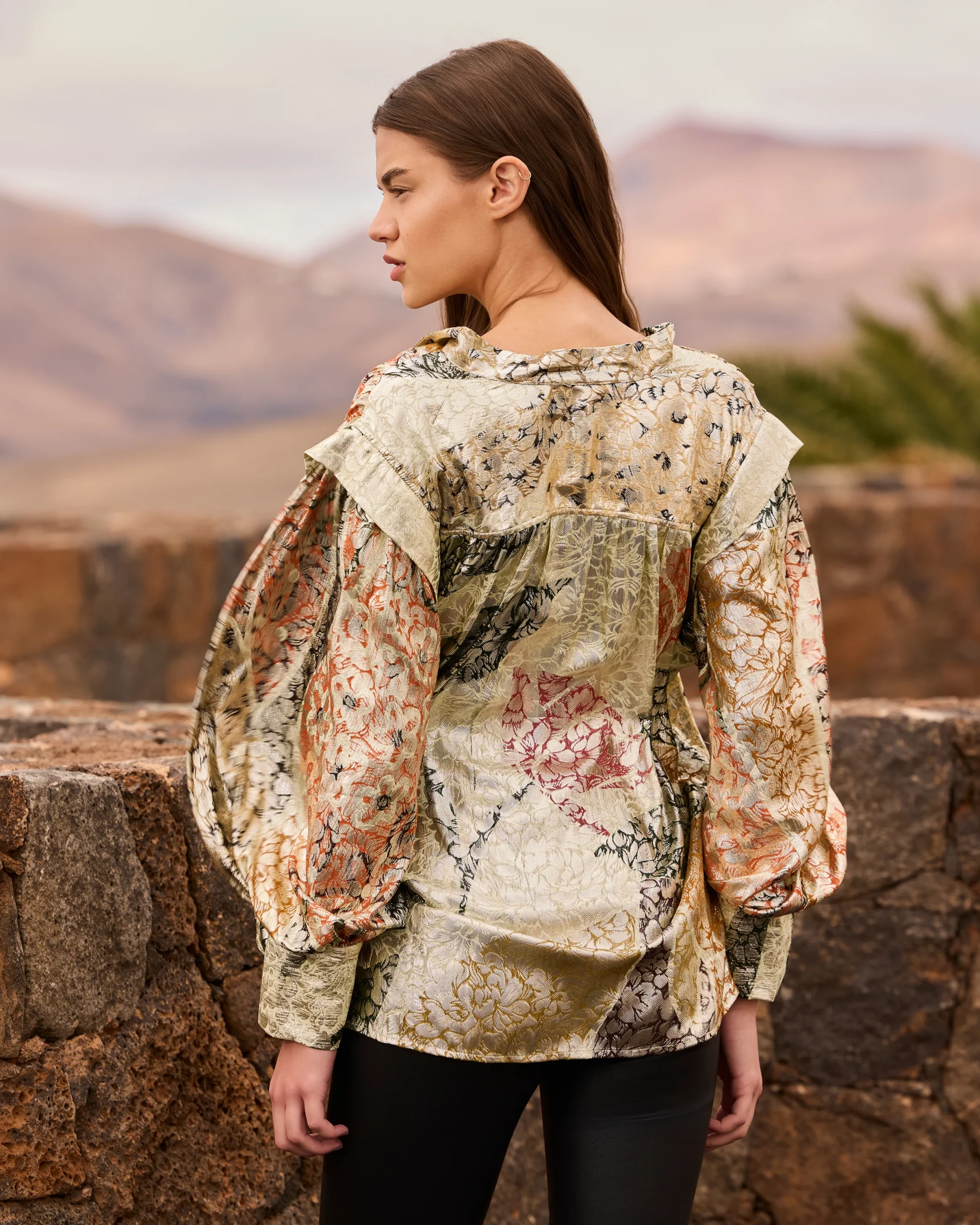Chemise en jacquard lurex multicolore avec un imprimé placé au reflet métallisé et lumineux, pour un effet brillance mouillé unique. Les manches volumineuses sont doublées de tulle afin de conserver une forme ballon structurée. Dotée d’une patte de boutonnage discrète et de poignets larges, cette pièce allie raffinement et modernité. Un modèle d’exception au tombé […]
