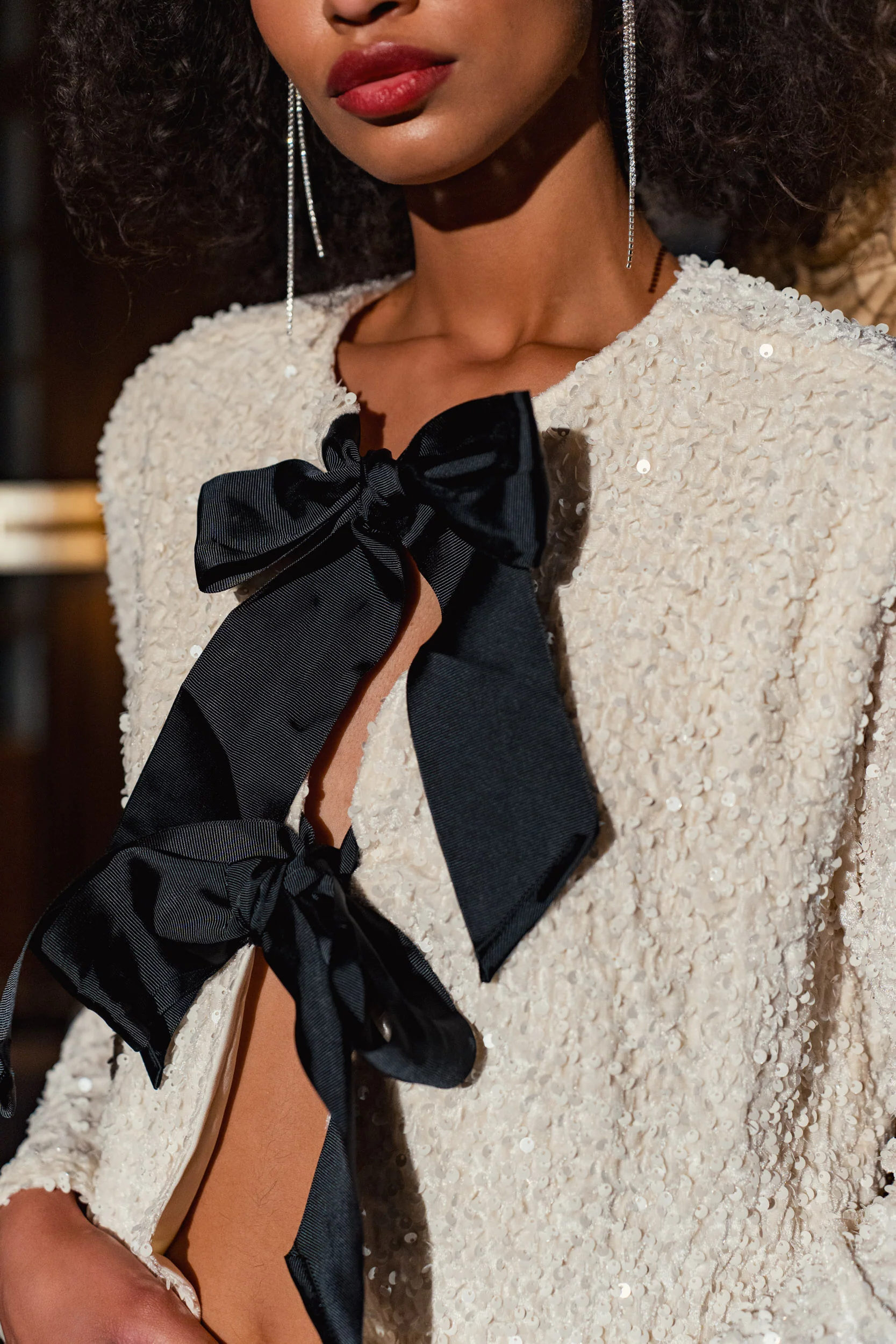 La blouse Jinna, pensée pour les fêtes, allie sobriété et raffinement grâce à son col rond intemporel et ses manches longues élégantes. Le détail de la fermeture à nœuds dans le dos apporte une touche festive et délicate, parfaite pour briller lors des occasions spéciales. Sa coupe fluide et sa finition impeccable en font une pièce chic et sophistiquée, idéale pour sublimer votre tenue de soirée.