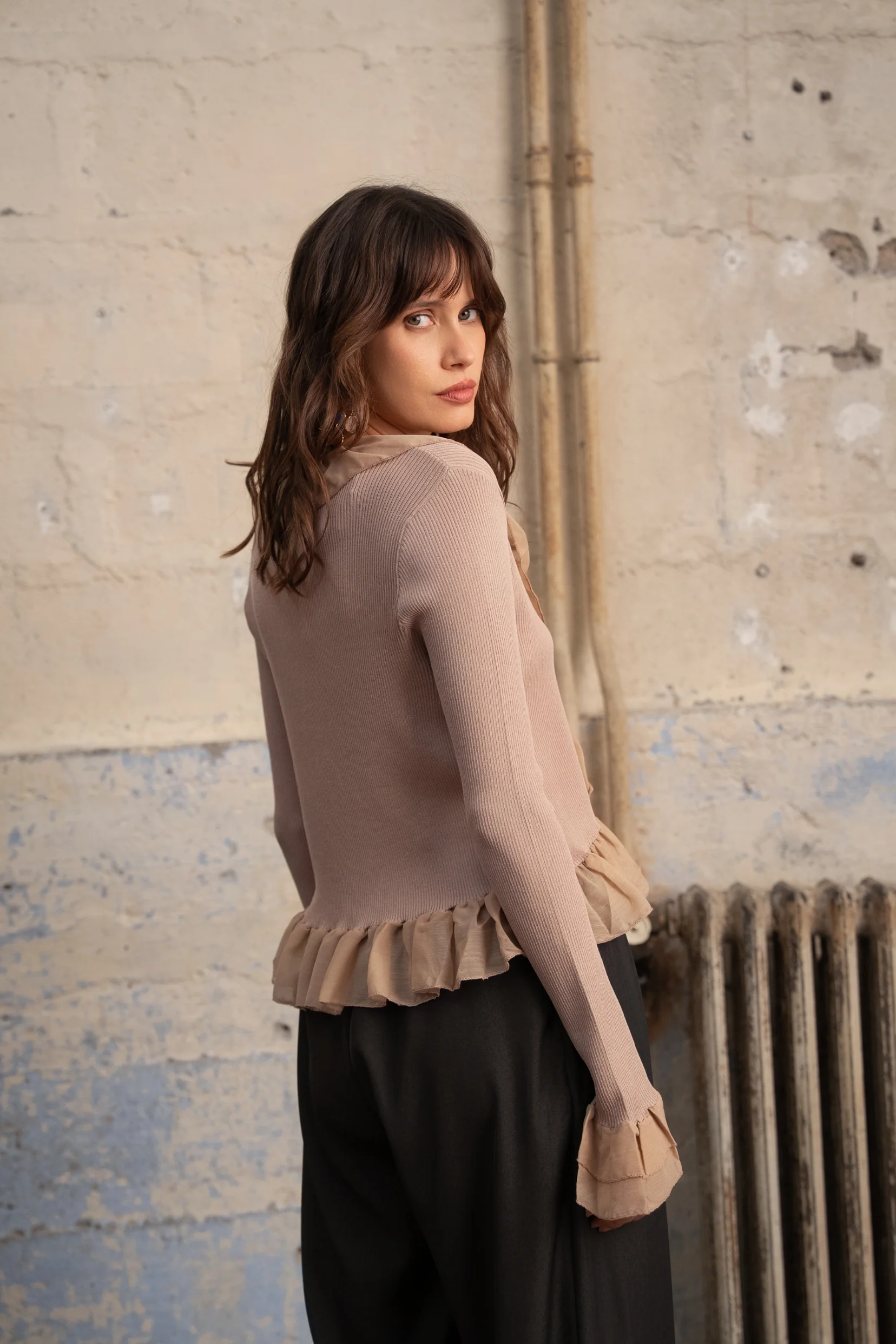 Sa matière fluide au tombé souple épouse les mouvements avec élégance, tandis que sa teinte taupe apporte une note de douceur intemporelle. Ses détails discrets, encolure arrondie, boutons fins et manches légèrement bouffantes – en font une pièce raffinée et facile à porter.