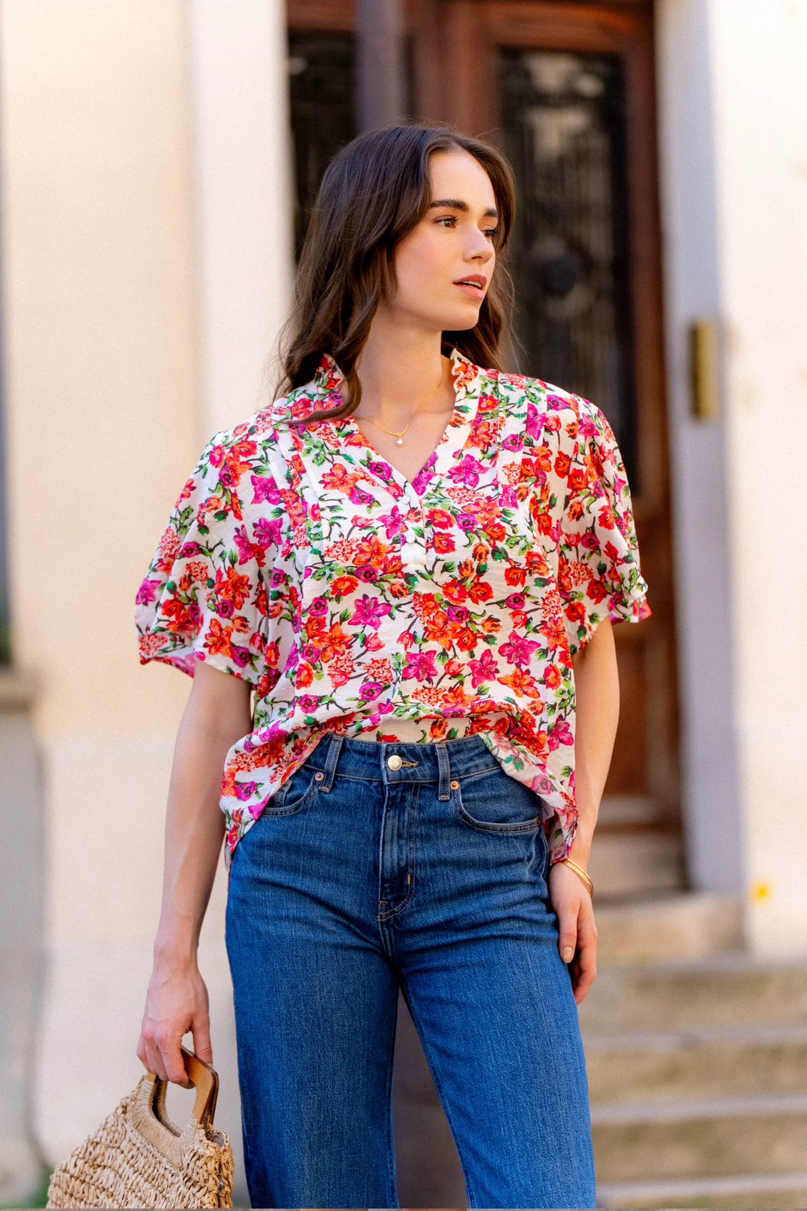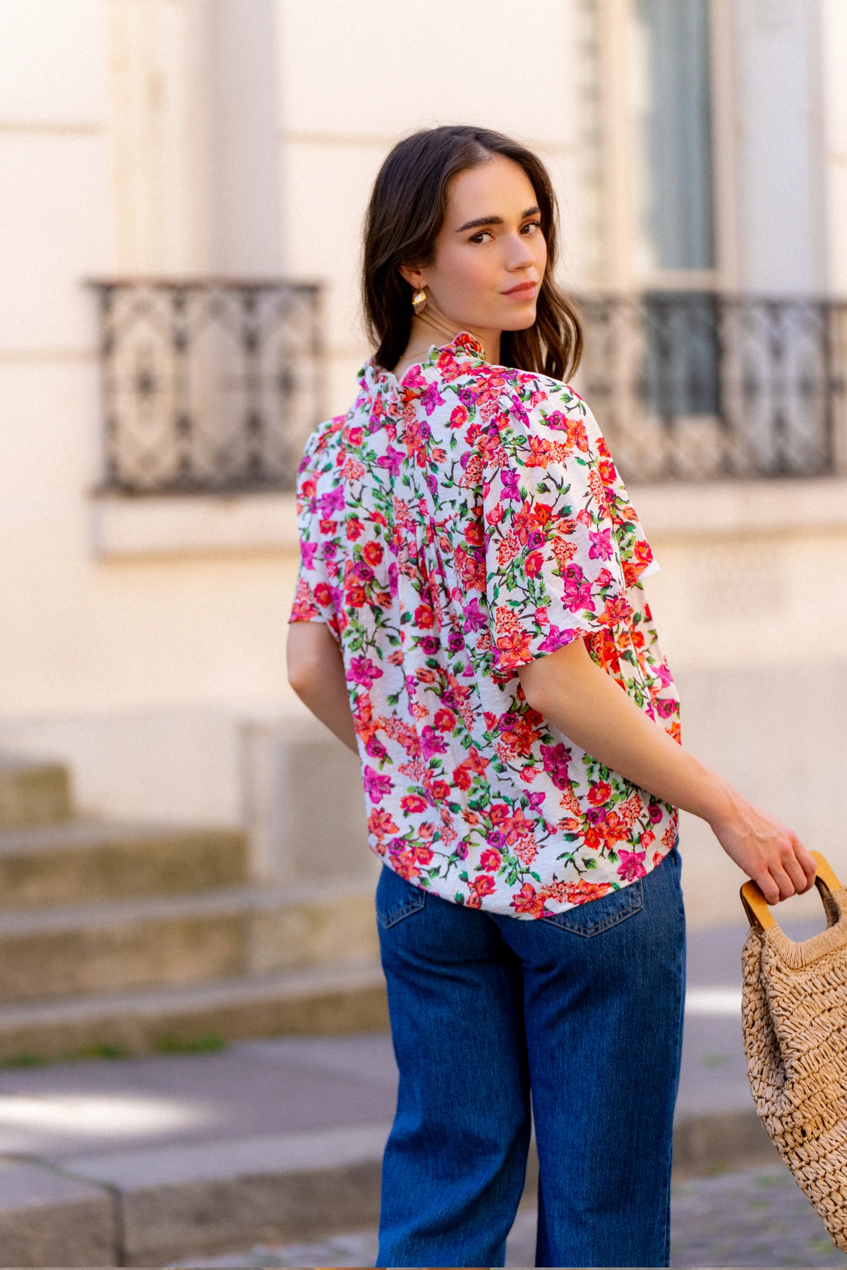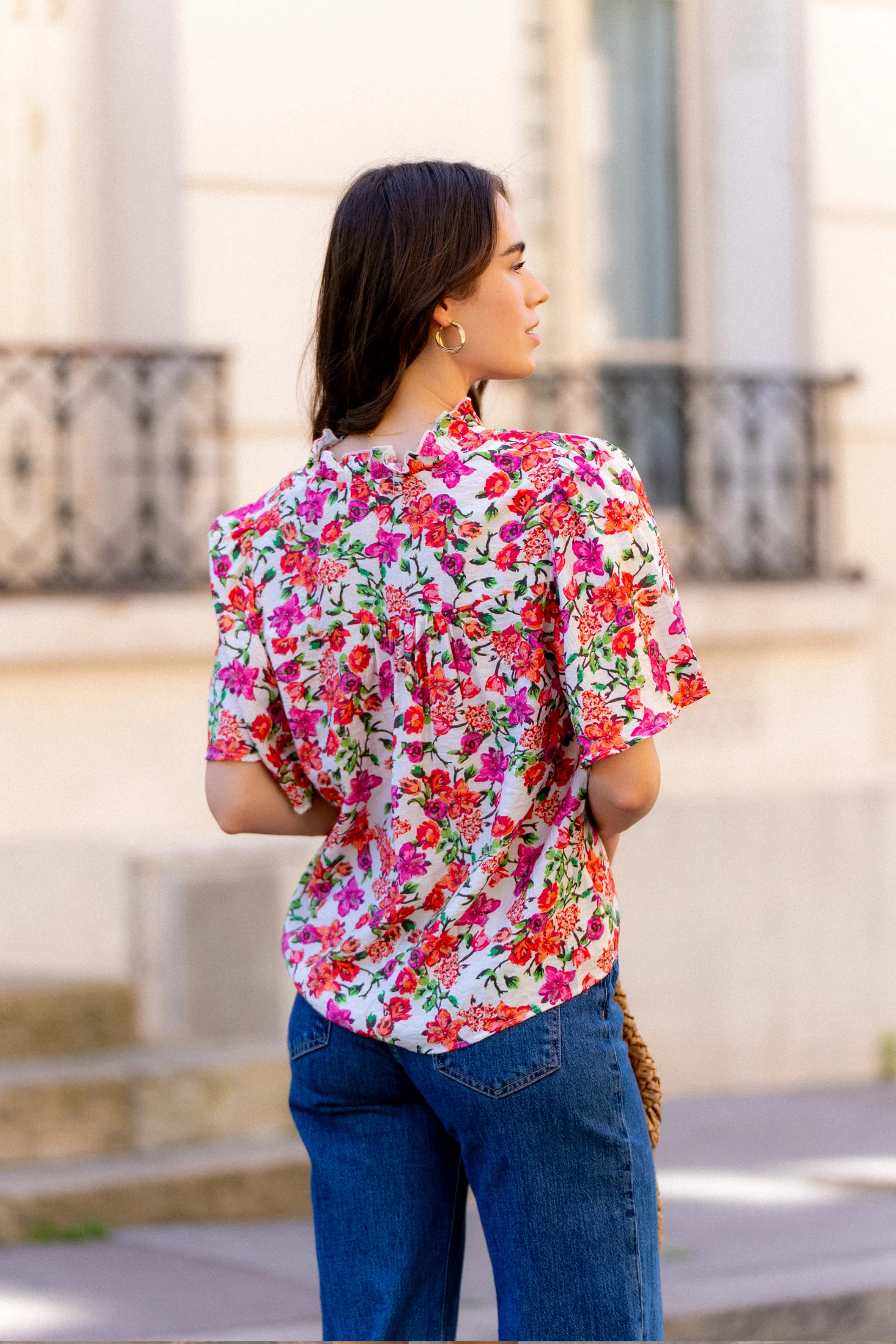 La blouse Noa est une pièce féminine qui allie confort et élégance. Son col en V flatteur met en valeur le port de tête, tandis que ses manches bouffantes apportent du volume et du caractère à la silhouette. Ornées de deux boutons au col, elles ajoutent une touche de raffinement discrète. Son imprimé floral, à la fois doux et lumineux, en fait une pièce facile à associer, du jean brut au pantalon fluide.