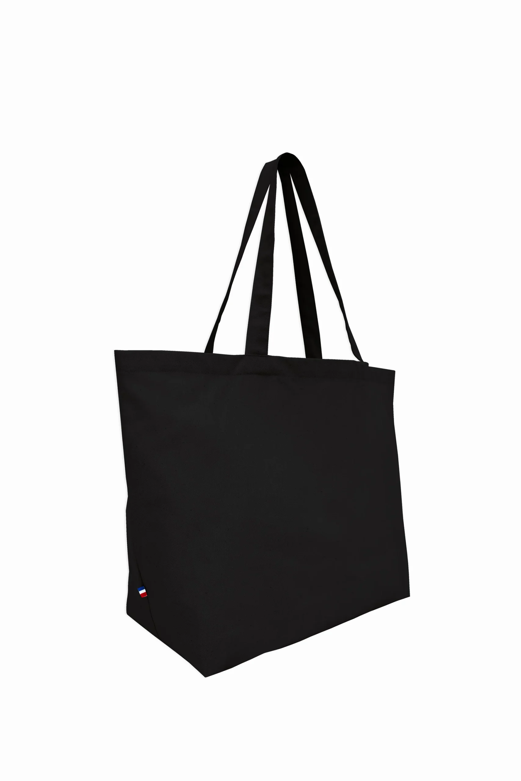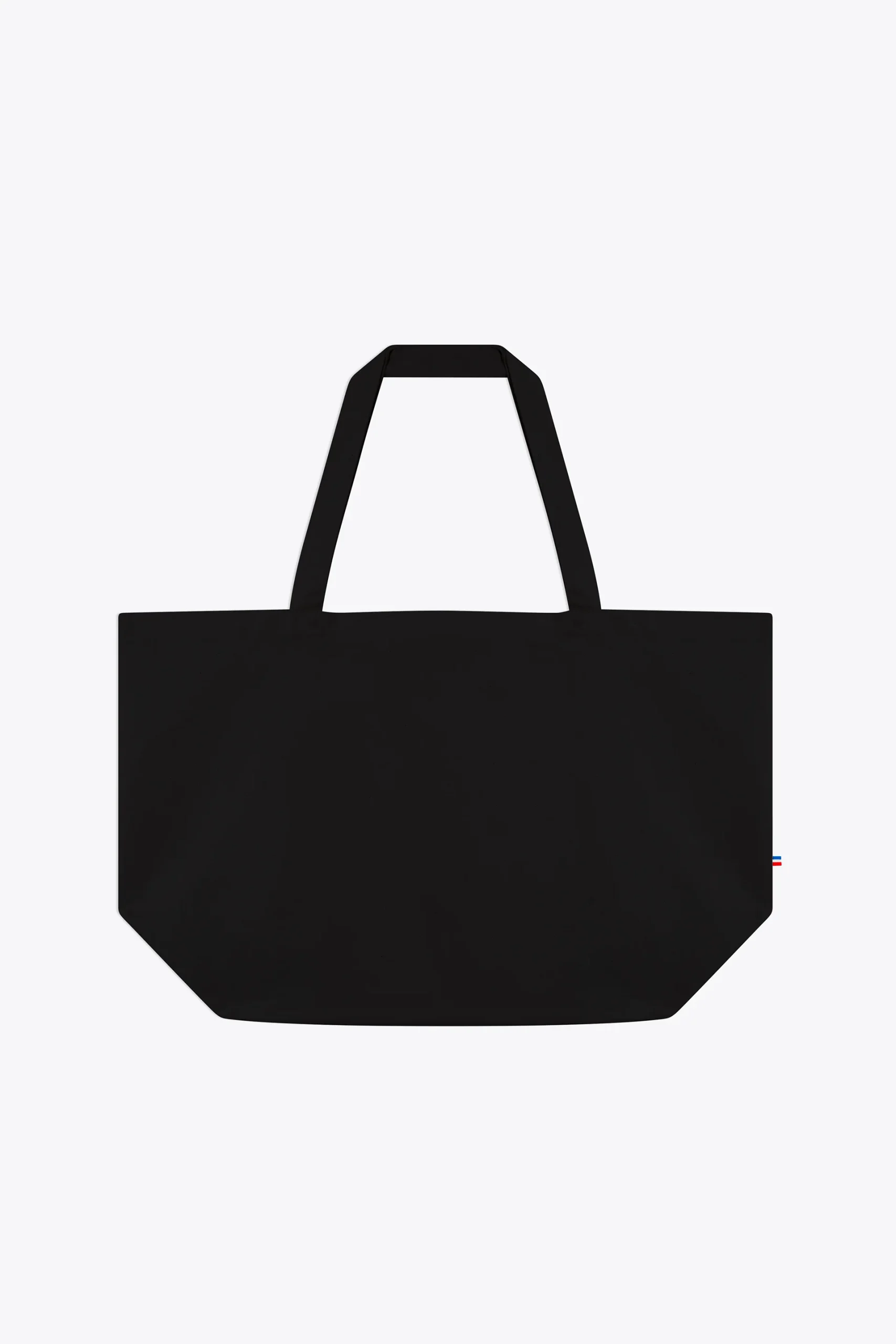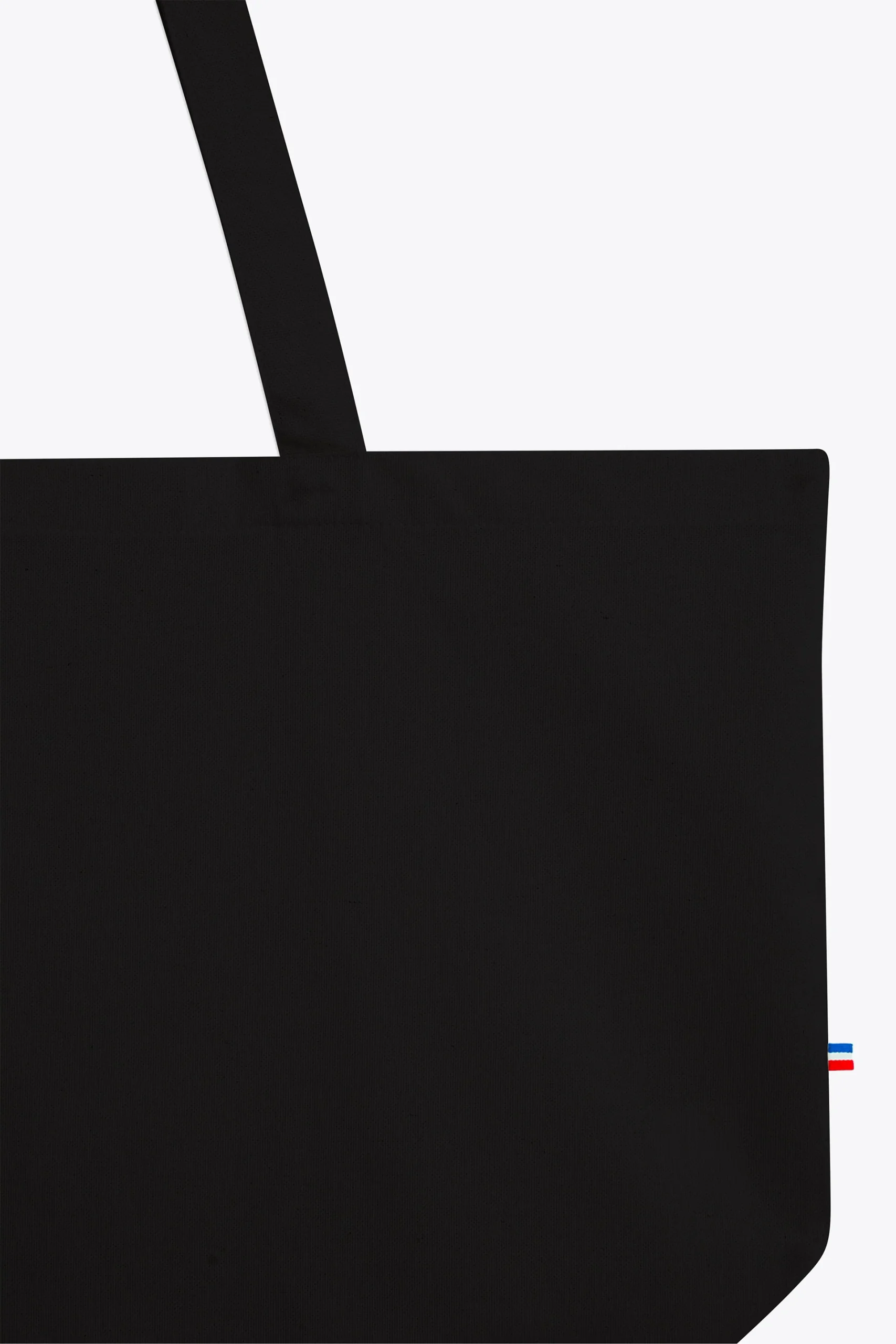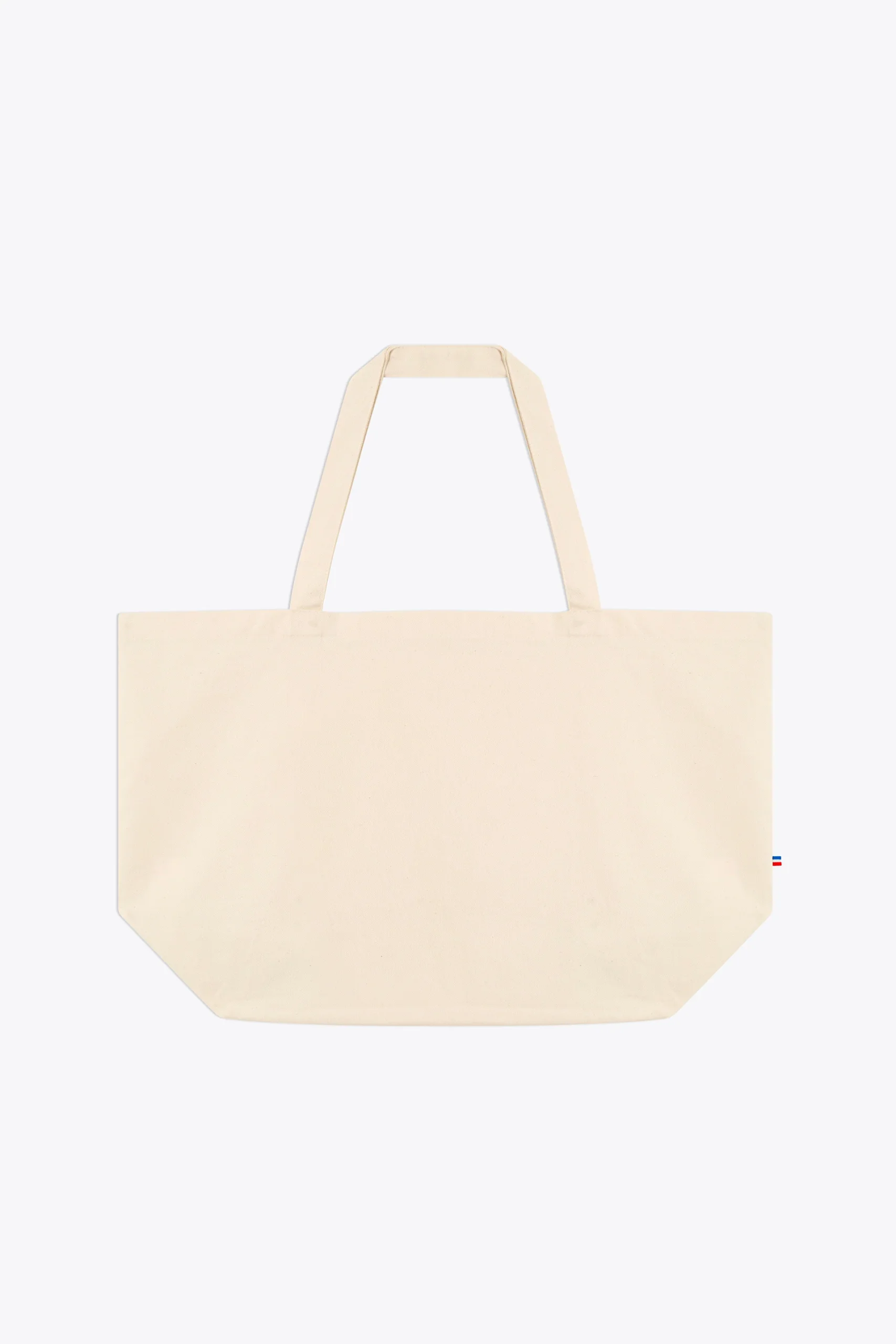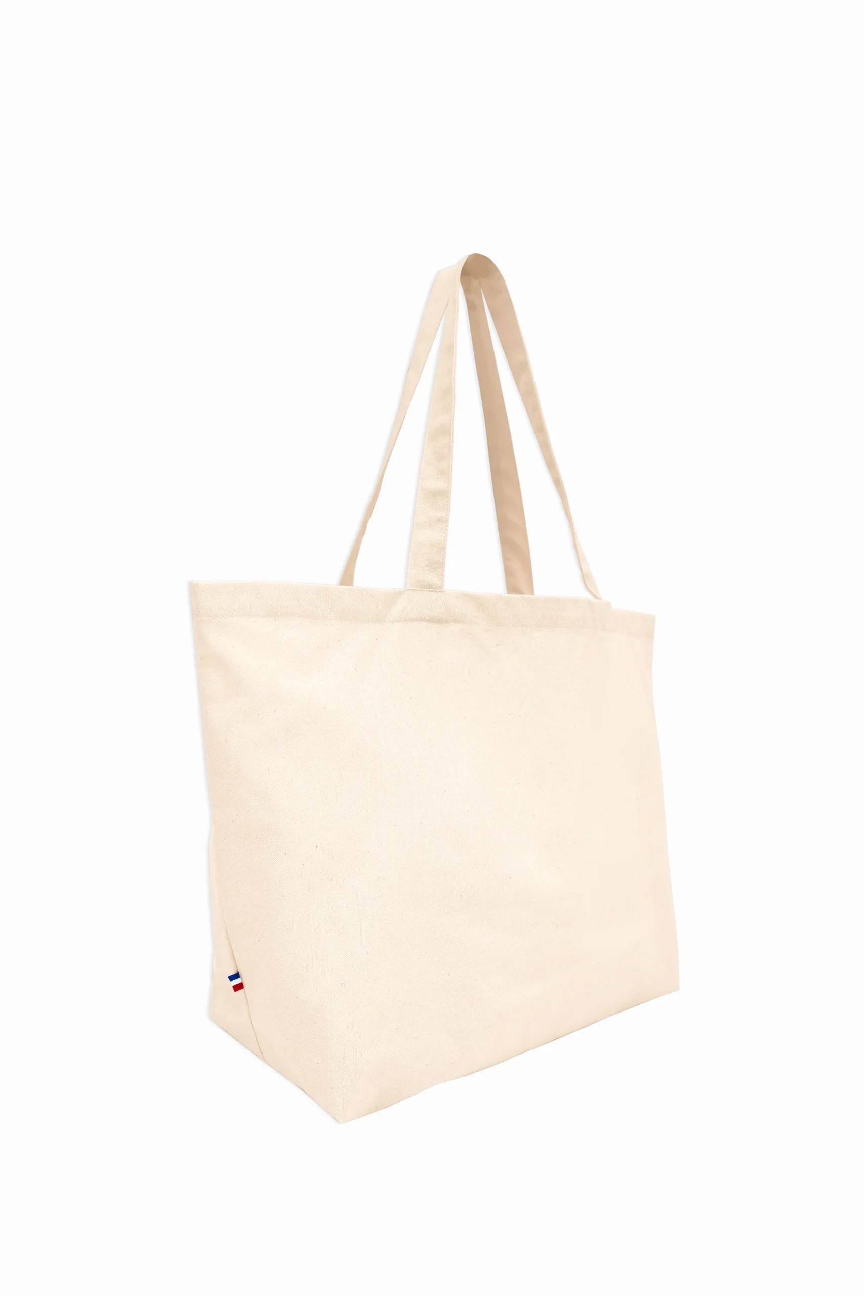 Anses de 3cm, coupées et cousues dans la toile, détail tricolore coté bas.