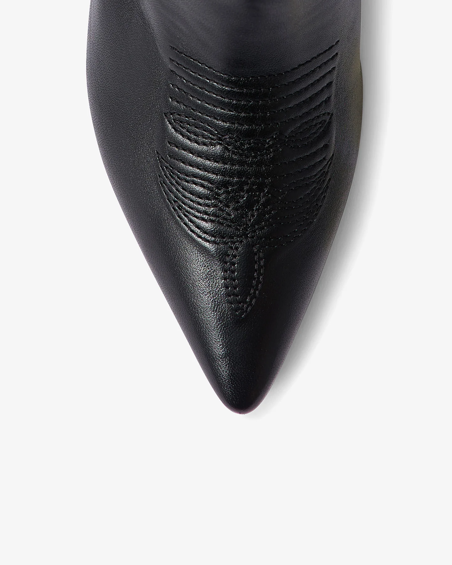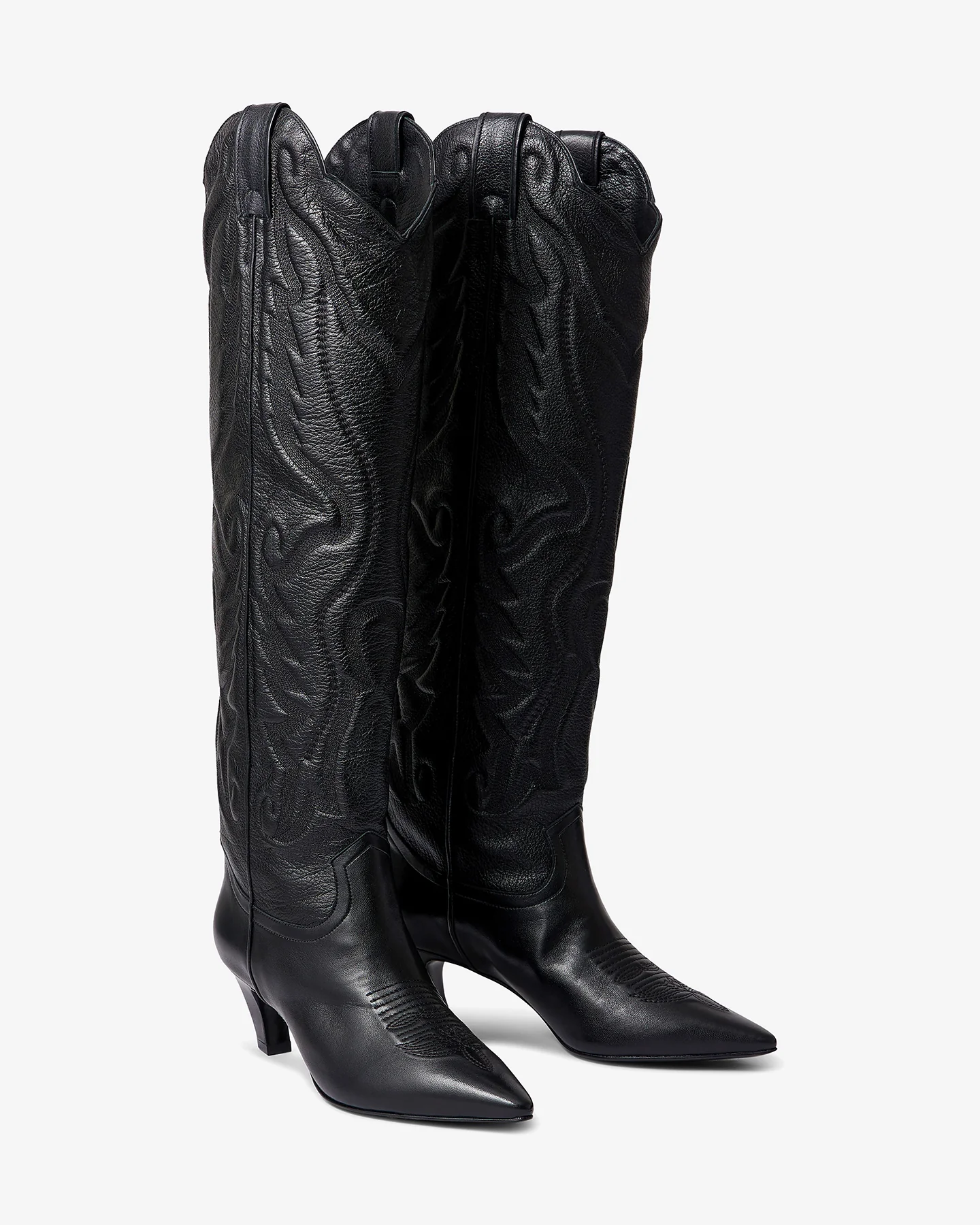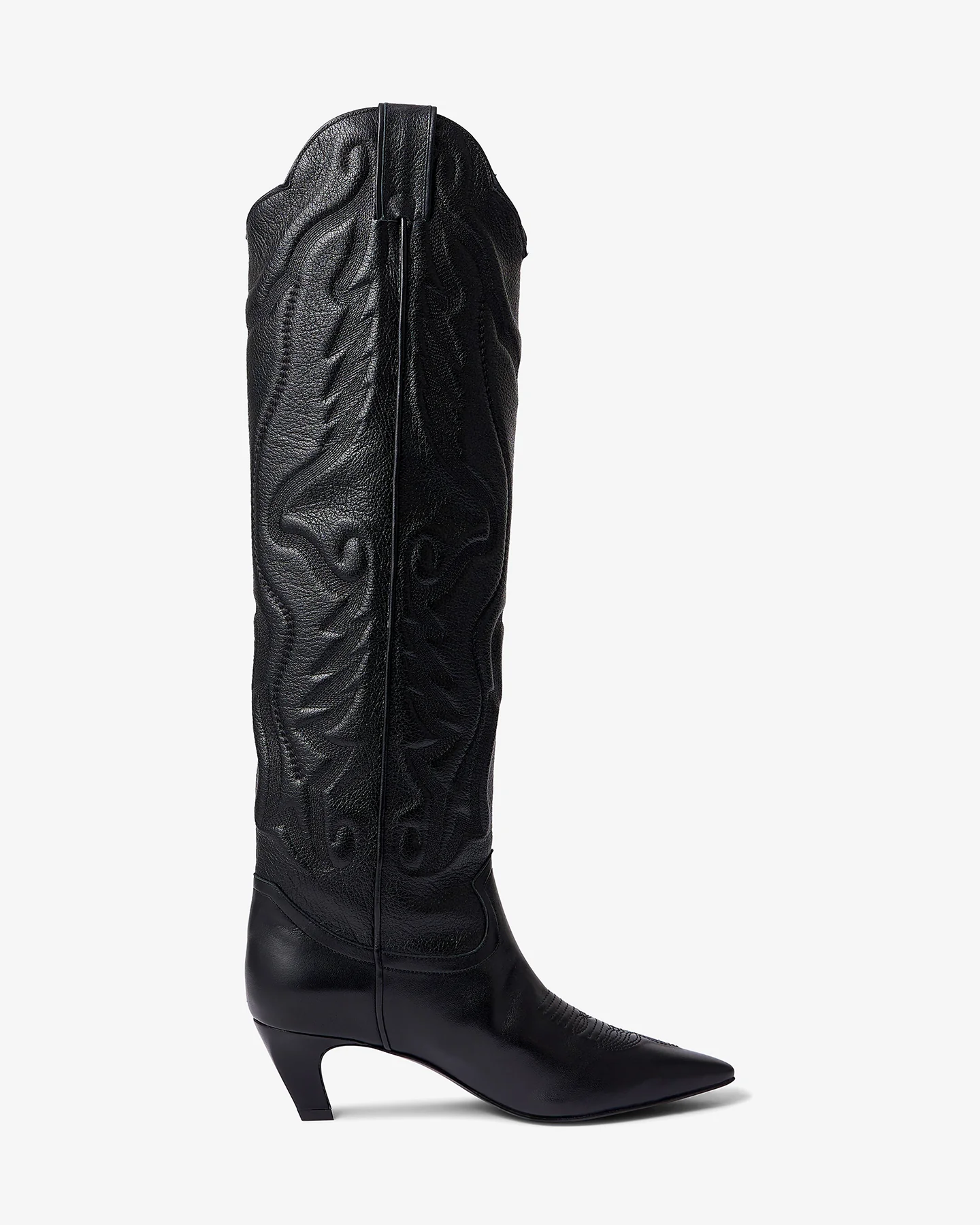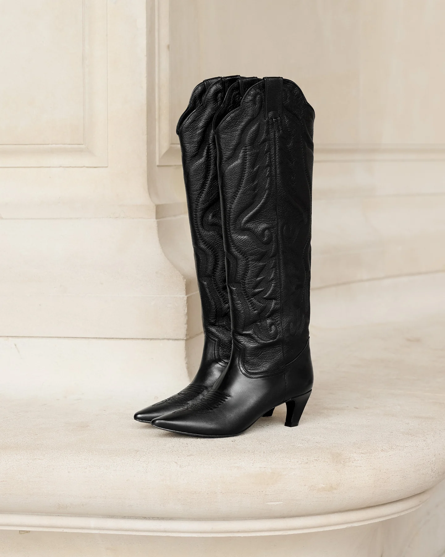 Bottes très hautes en cuir d’agneau noir, inspirées du style western avec une allure élégante et affirmée. Bout pointu et coupe droite légèrement évasée vers le haut, avec un arrondi délicat en haut de la tige qui monte jusqu’au genou. Des surpiqûres brodées ajoutent une touche artisanale et raffinée sur le long de la botte. Talon fin de 6 cm, féminin et confortable, apportant une silhouette élancée et une démarche gracieuse. Parfaites pour un look audacieux et chic, à la croisée de la tradition et de la modernité.