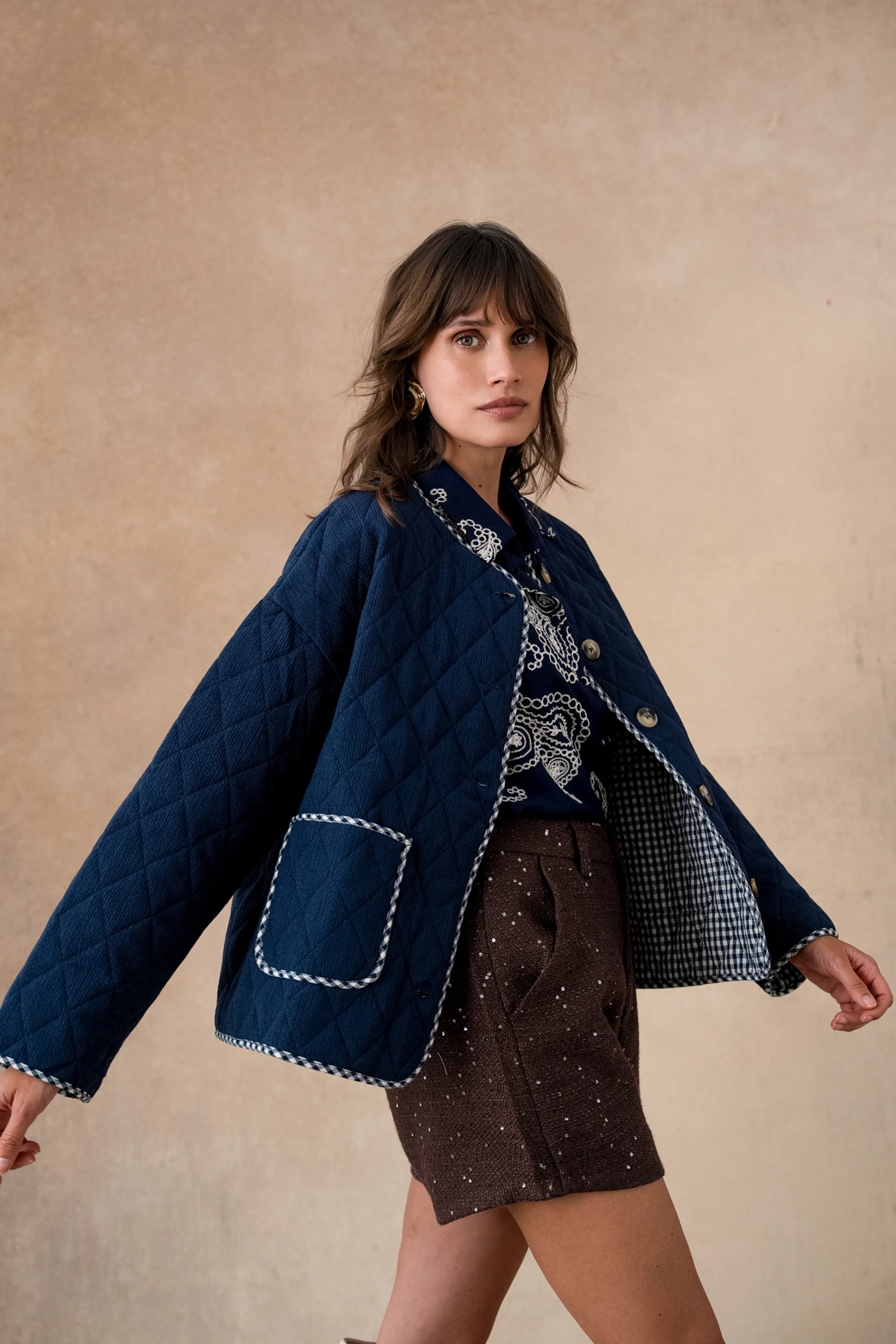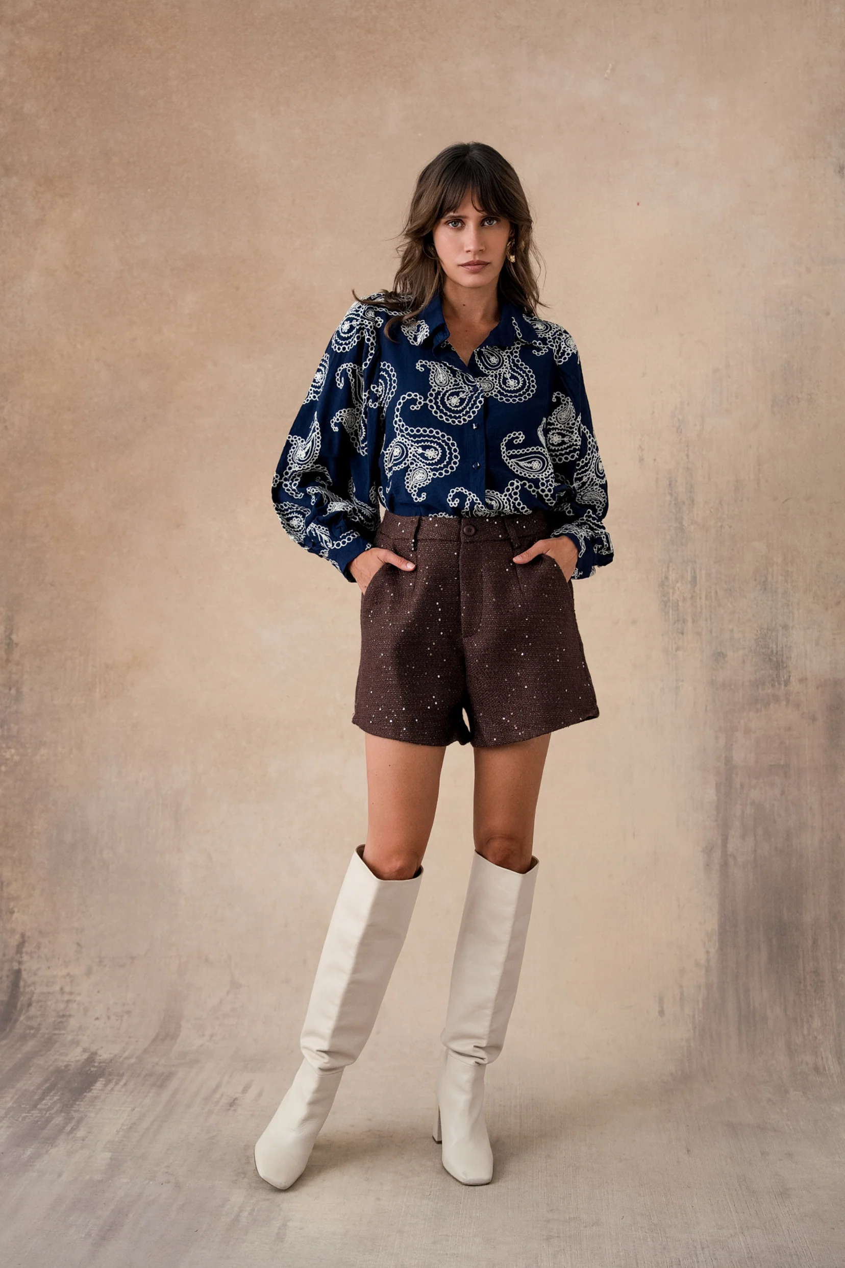 Son motif paisley aux teintes marine et écru apporte du relief à la silhouette, tandis que sa coupe fluide accompagne les mouvements avec élégance. Son col classique et ses manches longues légèrement bouffantes jouent entre allure citadine et esprit bohème.