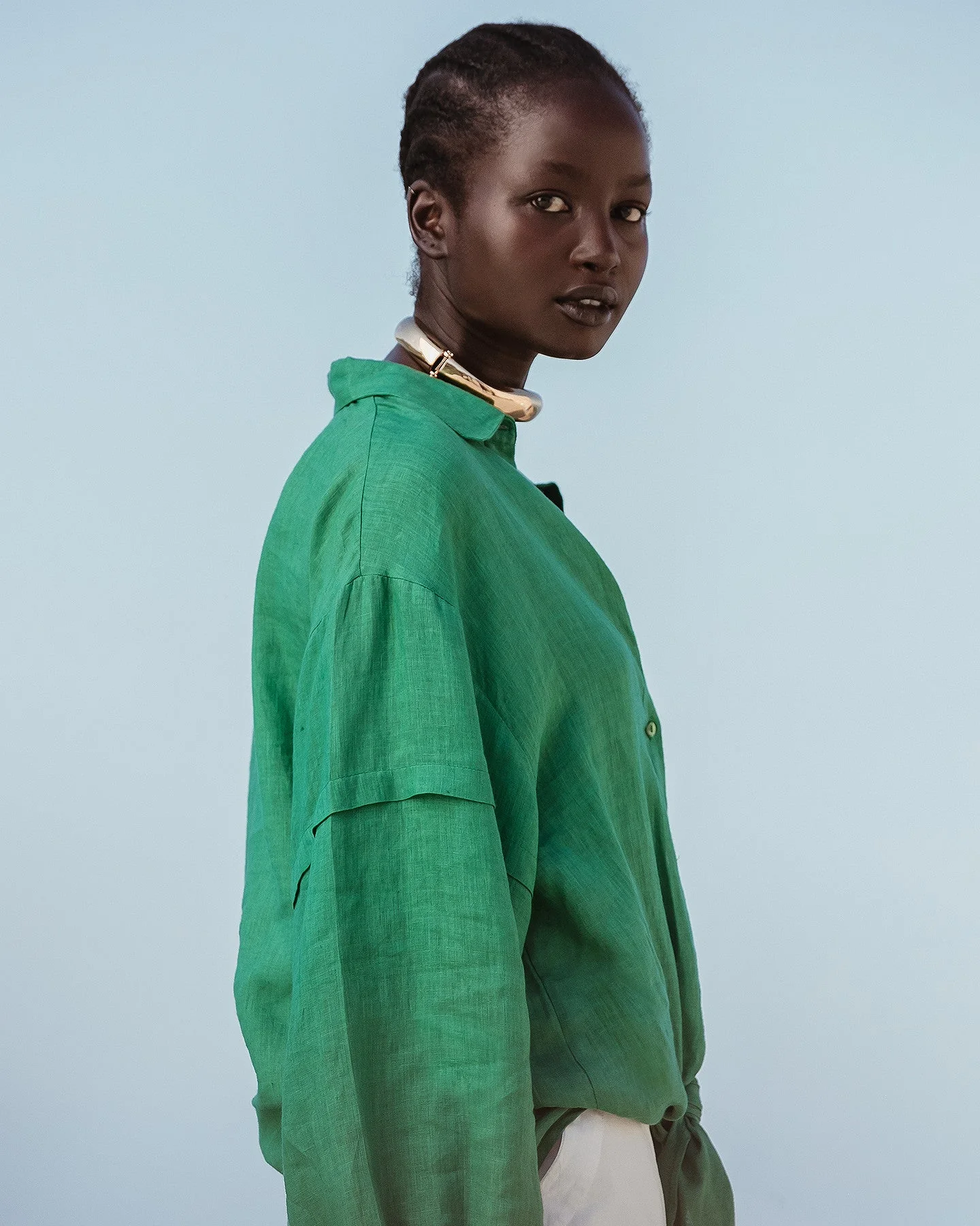 Romantique et raffinée notre chemise en lin de couleur verte est proposée sur une coupe souple et ronde. Les manches sont légèrement larges et longues, la base se noue pour un design qui s’insère harmonieusement dans la collection.