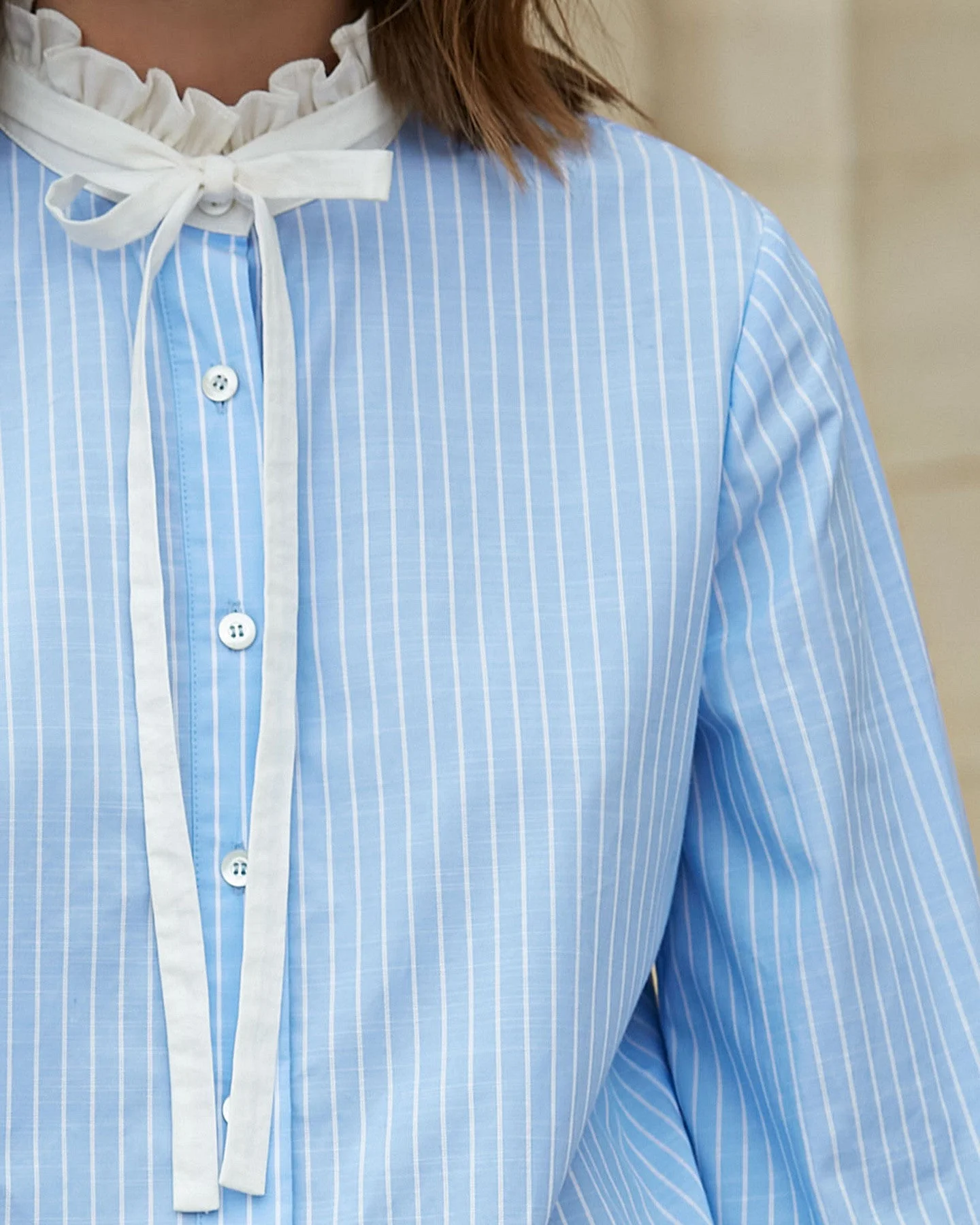 Romantique et éthérée à la fois, de notre chemise droite en coton émane délicatesse et féminité absolue. Col, poignets et liens blanc créent une agréable consistance rythmée par des rayures latérales sur fond de bleu. Portez la en harmonie avec vos tenues automnales pour un équilibre parfait.
