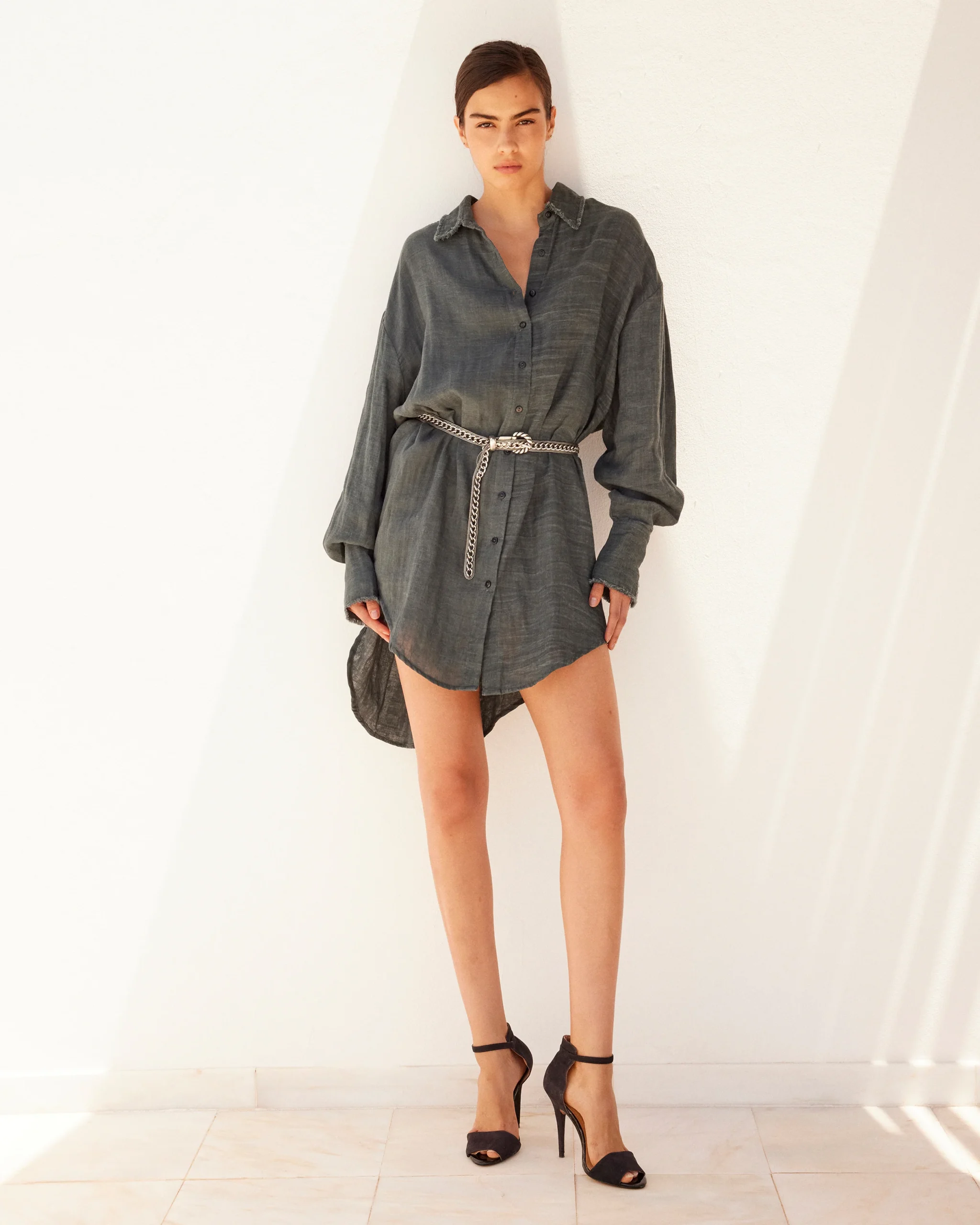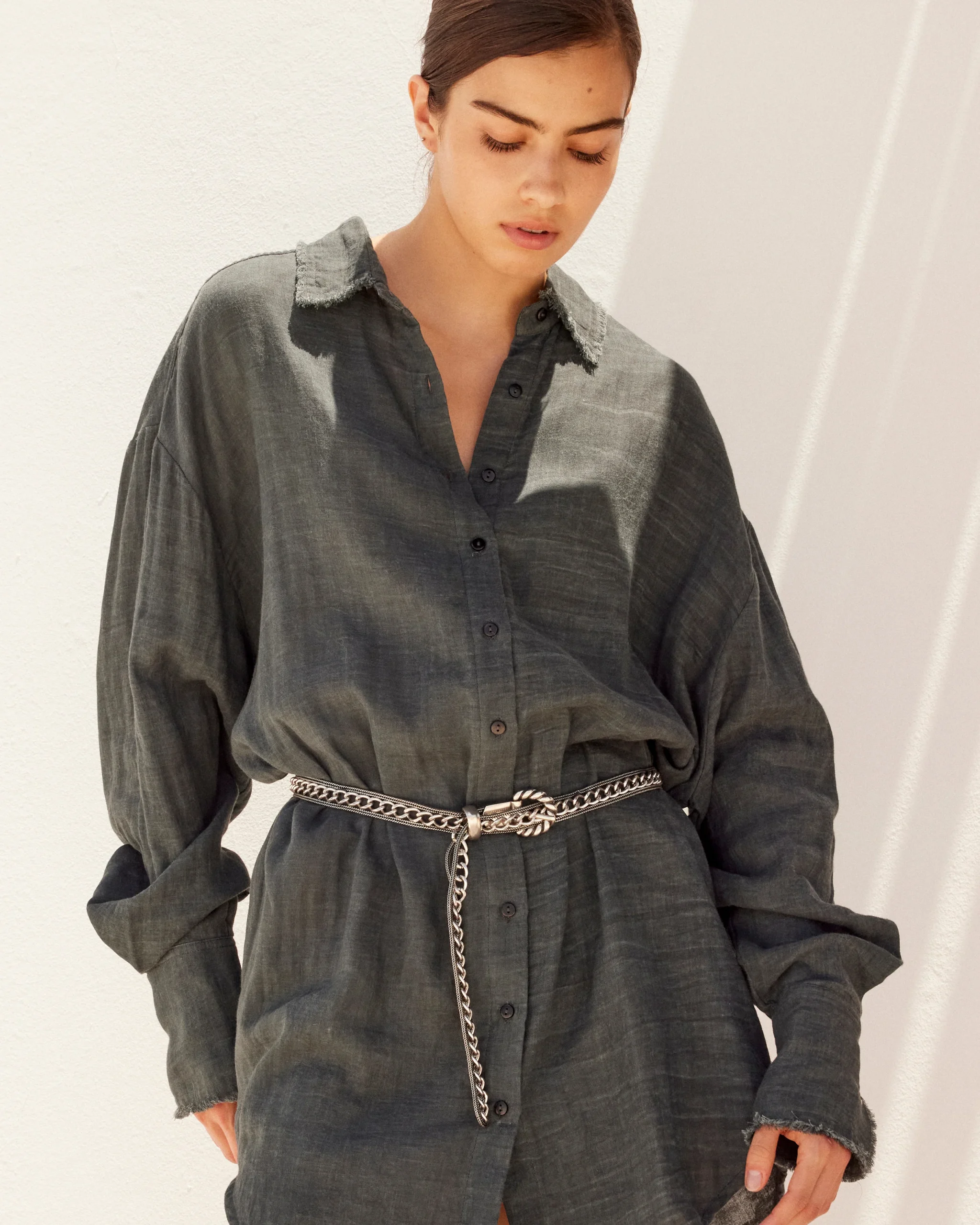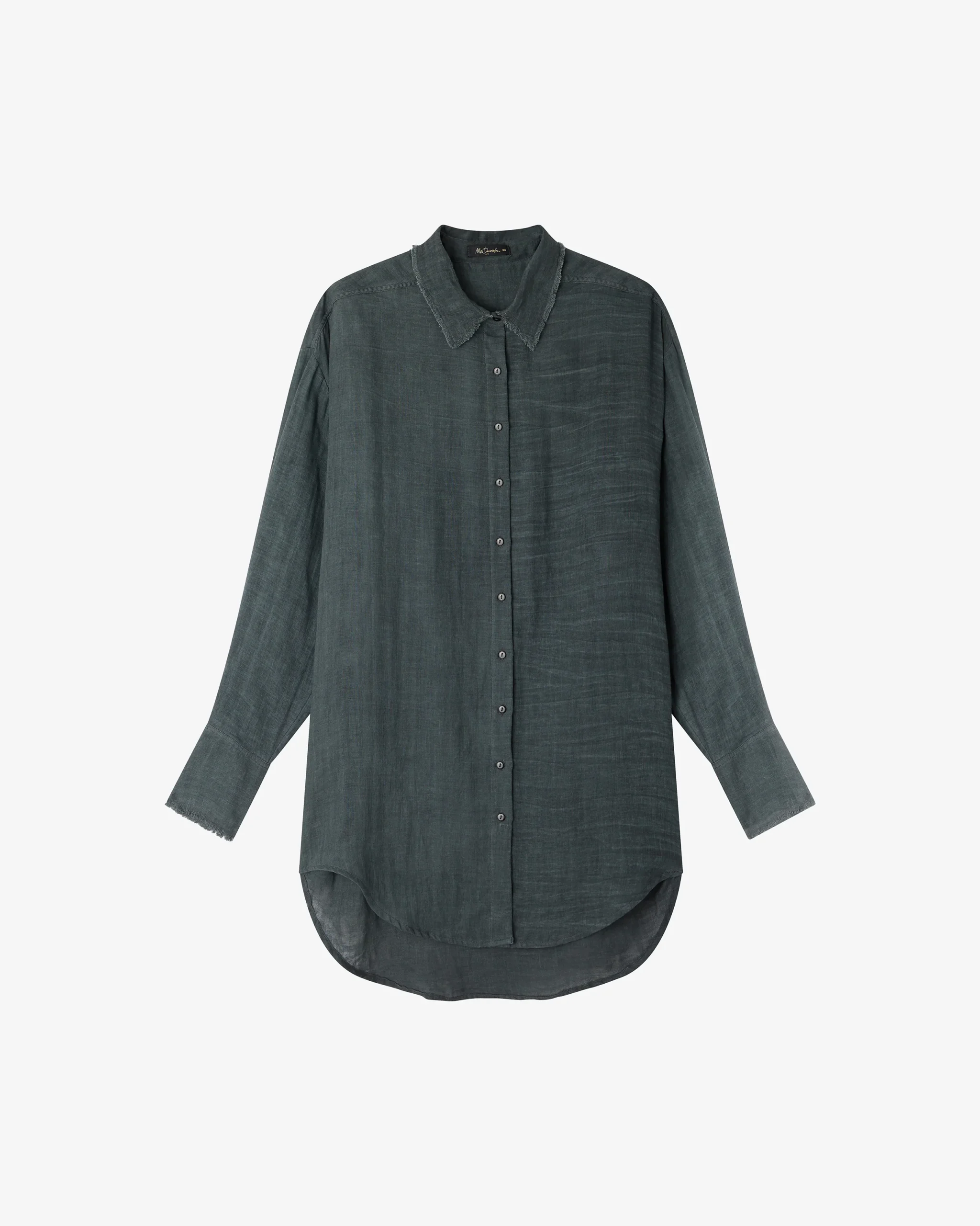 Minimalisme texturé et caractère brut. Cette chemise longue en double coton pigment dye dévoile une teinte gris foncé subtilement nuancée, rendue unique par un procédé de teinture artisanale. Chaque pièce possède ses propres variations, comme une empreinte singulière.