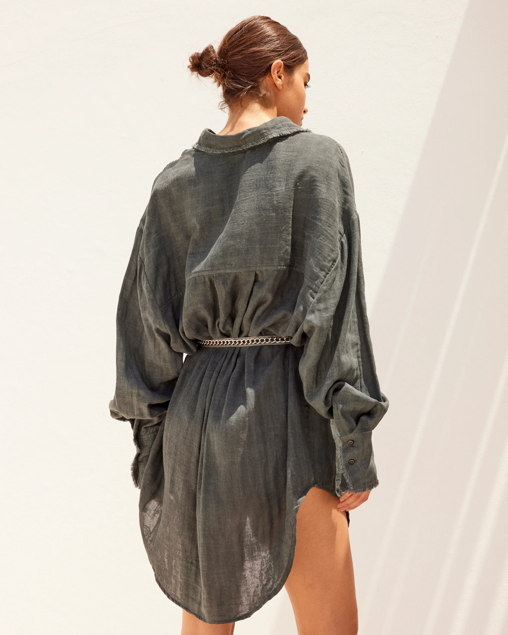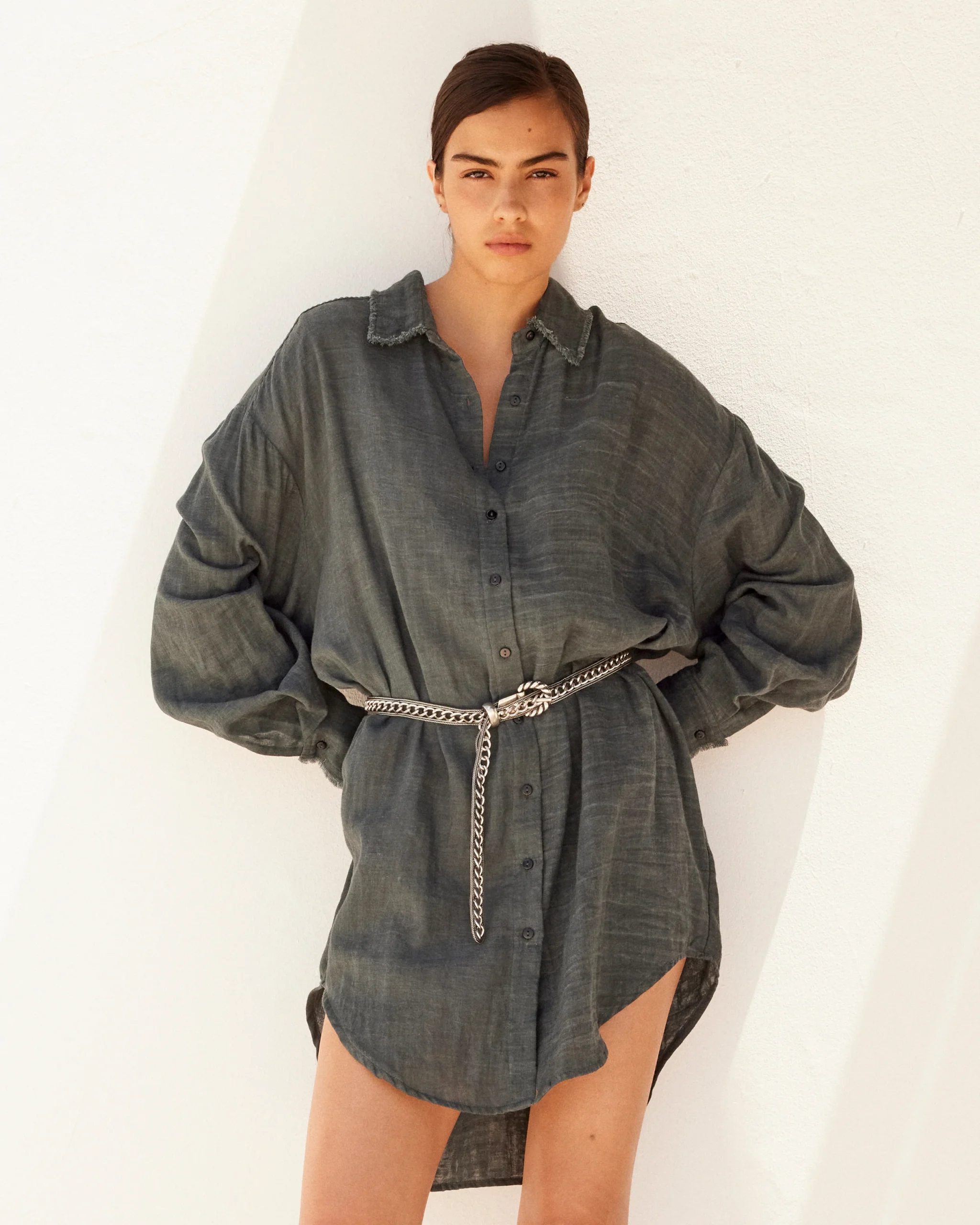 Sa coupe droite, légèrement plus longue à l’arrière, dessine une silhouette fluide et structurée à la fois. Le col, aux bords effilochés, affirme un esprit bord franc délicatement désinvolte, entre modernité et naturel.