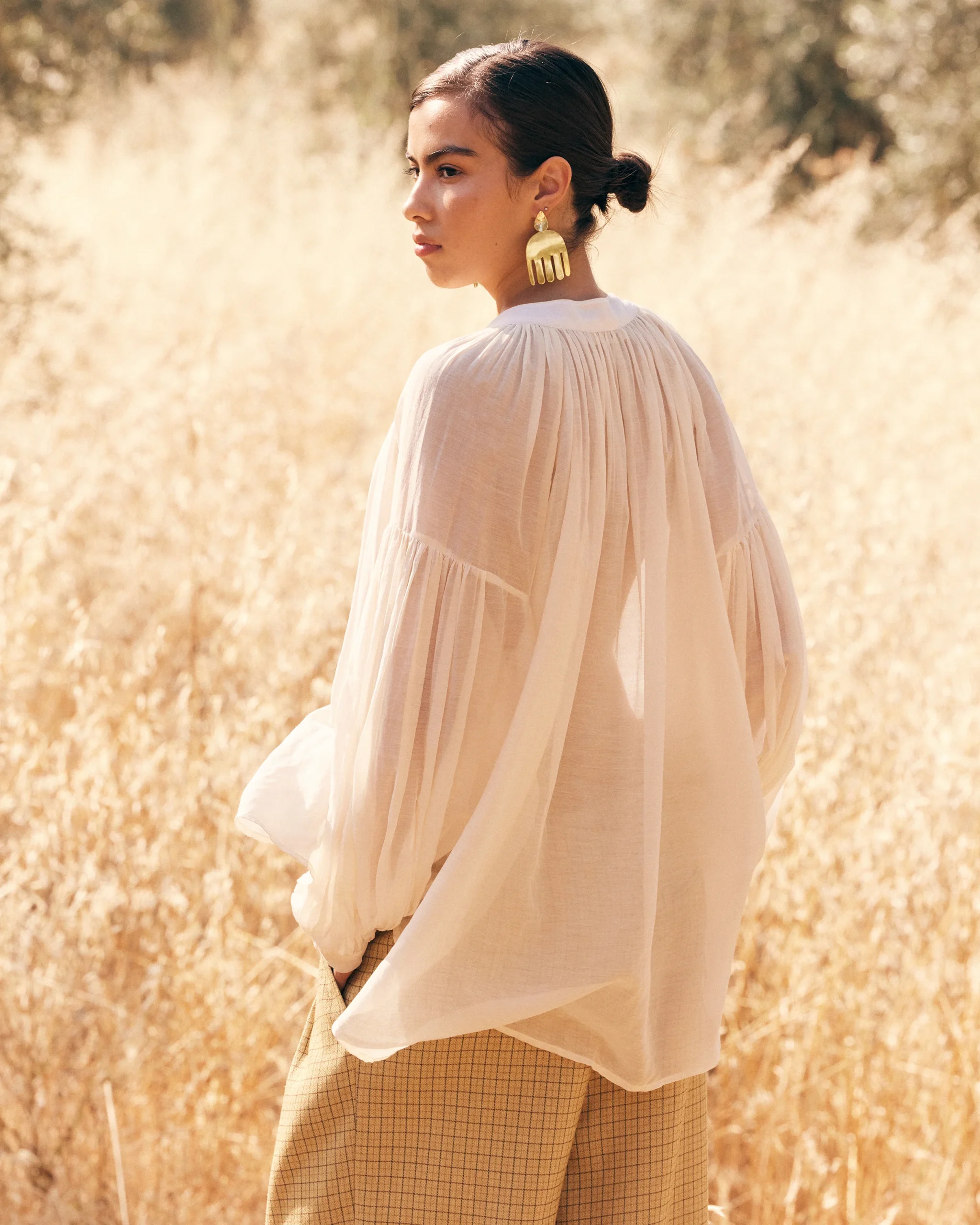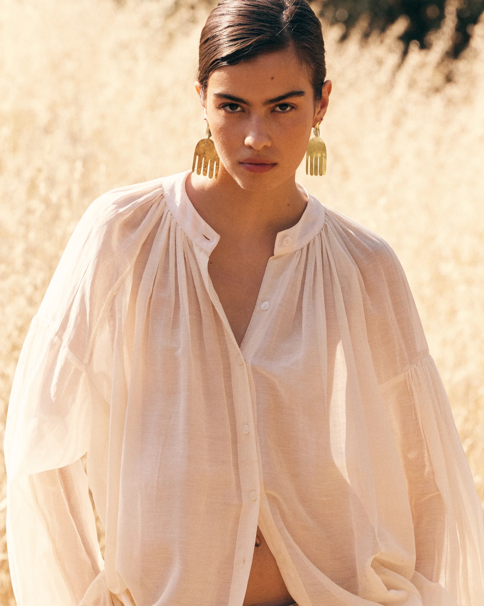 Légèreté absolue et raffinement discret. Cette blouse en voile de coton et soie, délicatement translucide, révèle une nuance ivoire douce et lumineuse. Sa coupe large et souple épouse les mouvements avec grâce, portée par des manches longues au volume généreux qui ajoutent une touche de poésie à la silhouette.