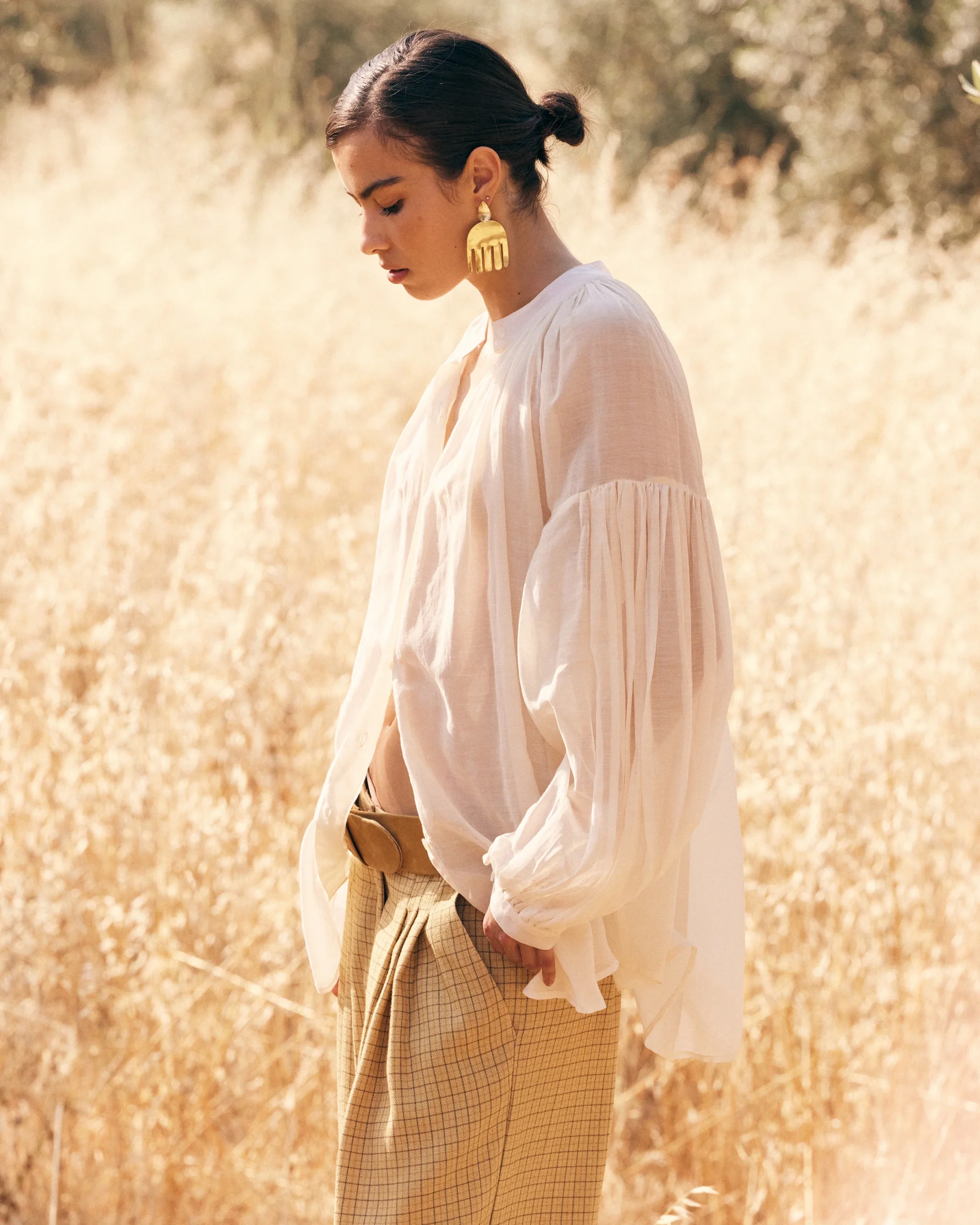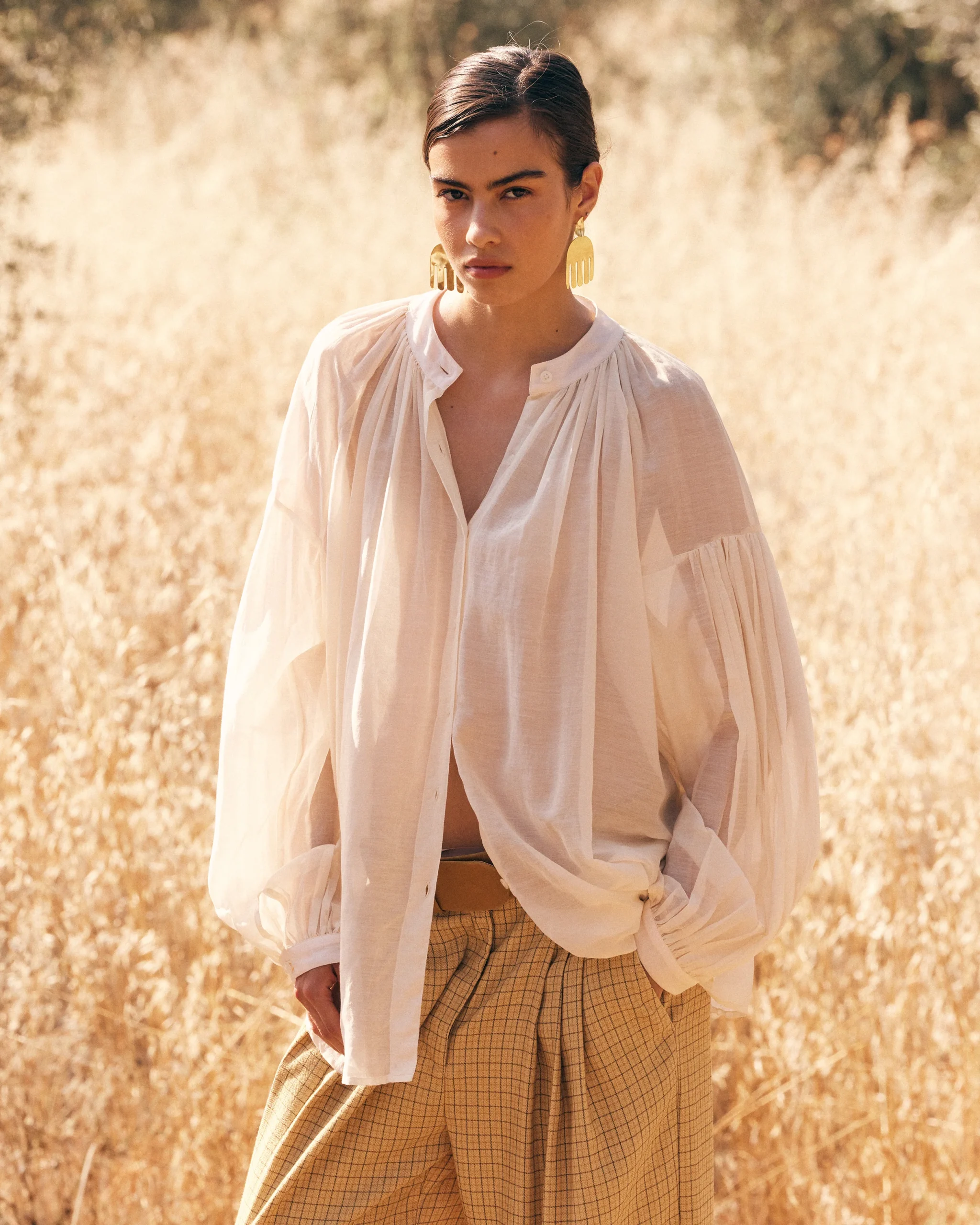 Légèreté absolue et raffinement discret. Cette blouse en voile de coton et soie, délicatement translucide, révèle une nuance ivoire douce et lumineuse. Sa coupe large et souple épouse les mouvements avec grâce, portée par des manches longues au volume généreux qui ajoutent une touche de poésie à la silhouette. Le col droit, épuré, structure l’ensemble […]