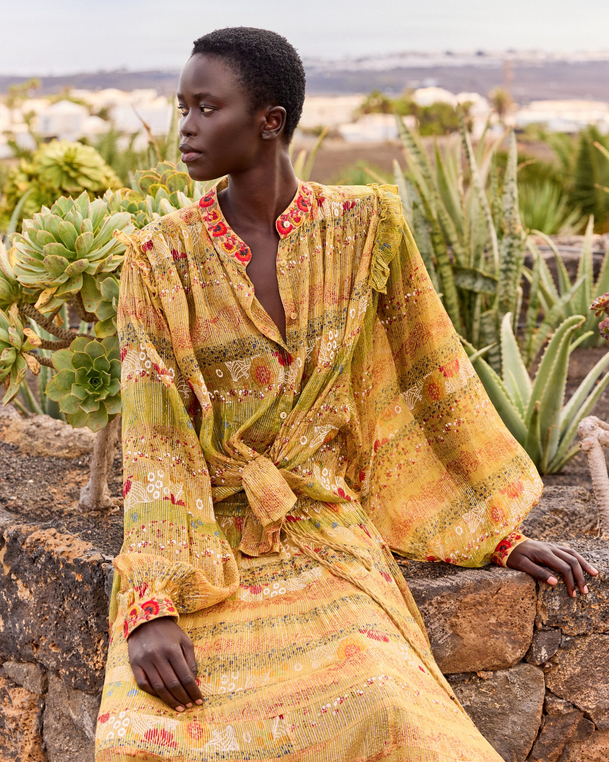 Chemise raffinée en viscose chiffon agrémentée de fils lurex scintillants, apportant une subtile brillance au tissu. Elle se distingue par ses volants délicats aux épaules, ses broderies colorées sur le col et les poignets, et ses manches longues amples qui offrent un volume aérien. Fermeture par petits boutons nacrés à l’avant. À associer avec la […]