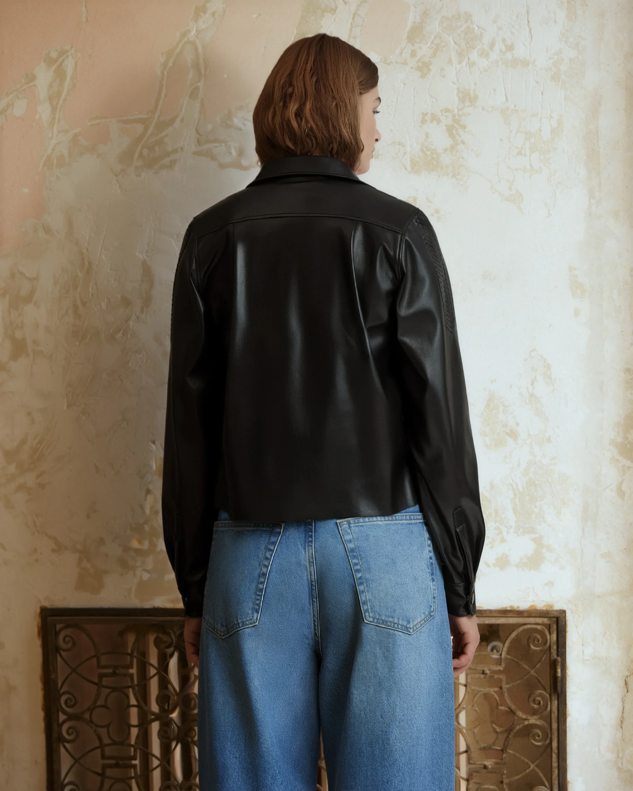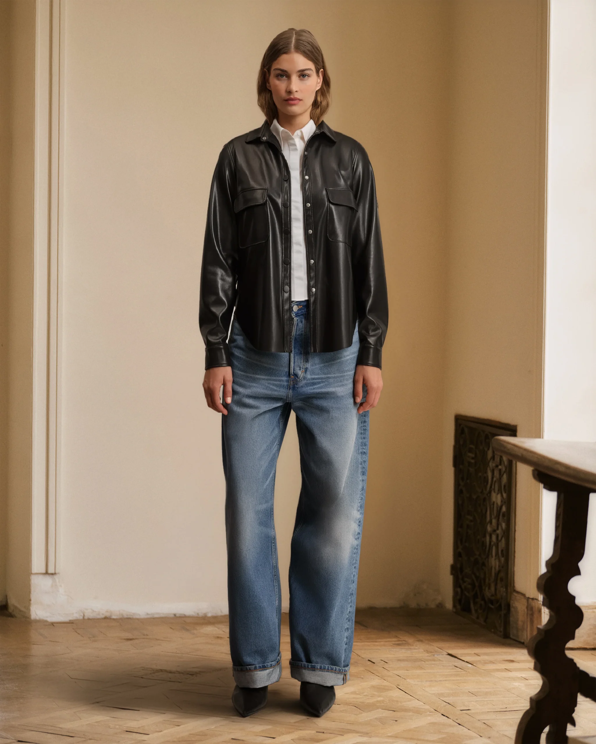 Cette chemise droite en simili-cuir ajoute une touche de sophistication urbaine à votre garde-robe reproduisant avec élégance l’apparence du cuir naturel, ajoutant une dimension de texture et de style à la pièce. La couleur noire confère une allure intemporelle et polyvalente, parfaite pour être assortie à une variété de tenues. La coupe droite de la chemise offre une silhouette classique et flatteuse, tandis que les poches à revers apportent une touche de modernité et d’audace.