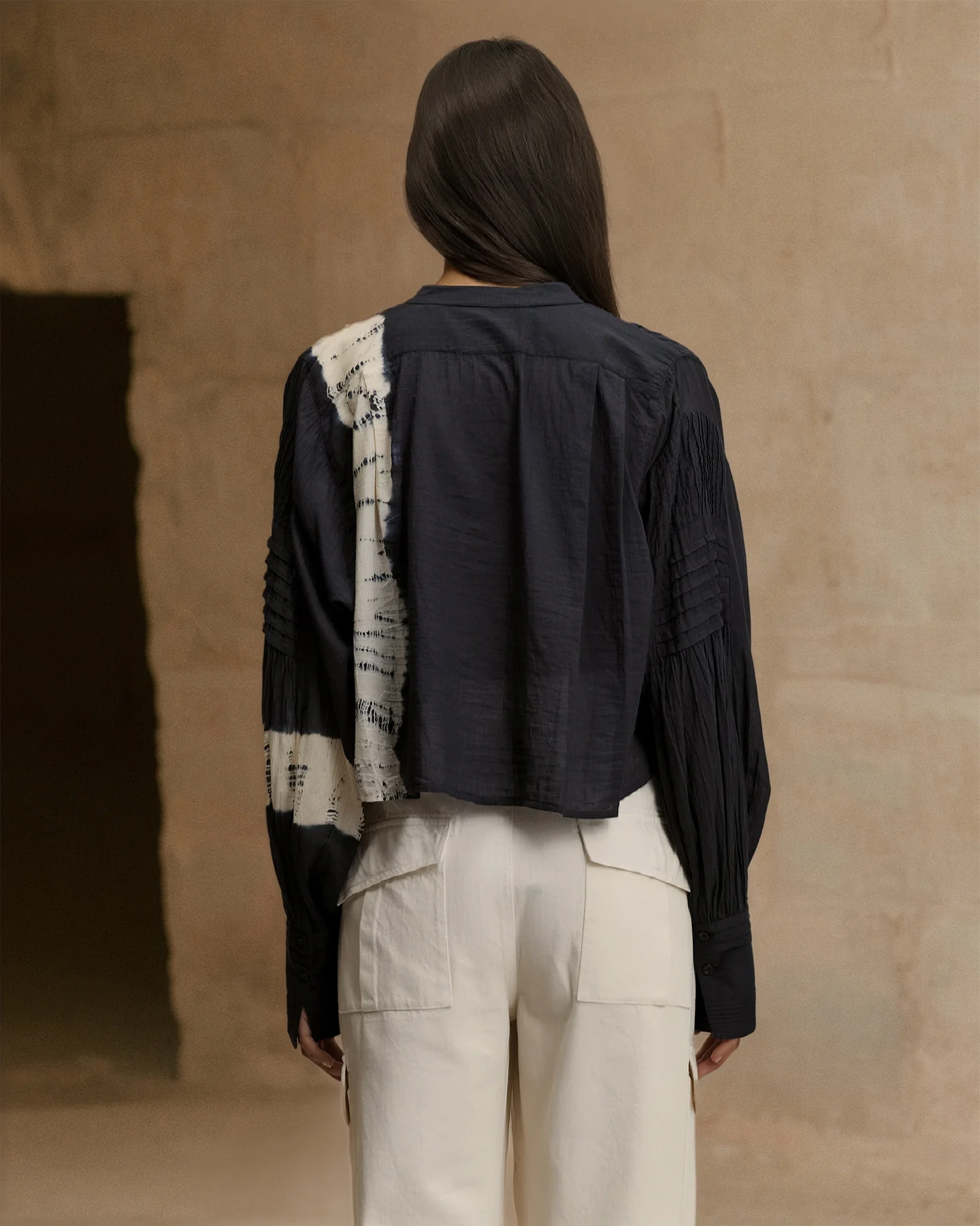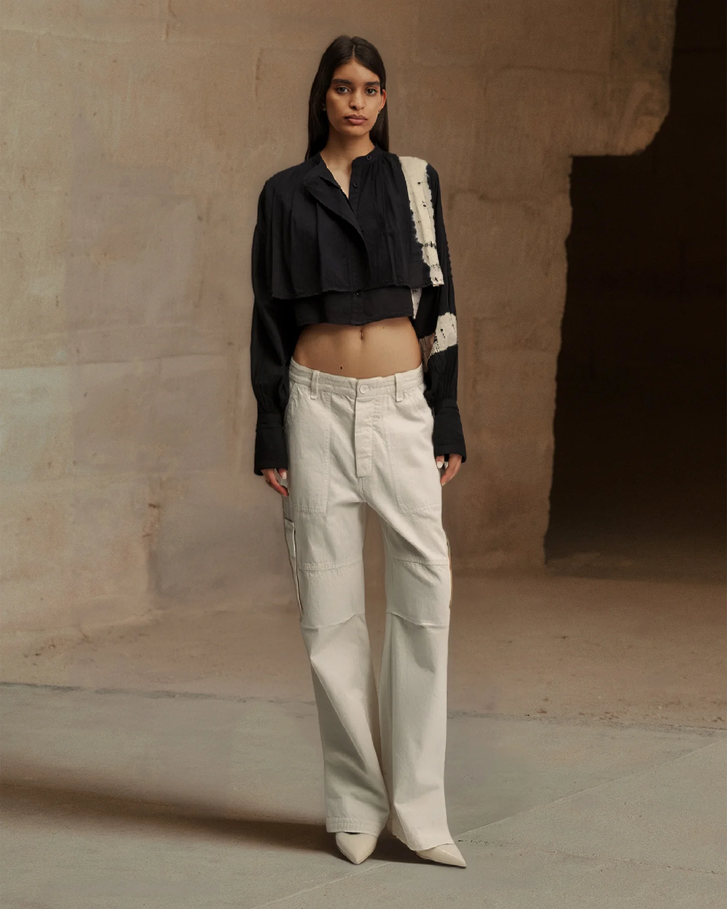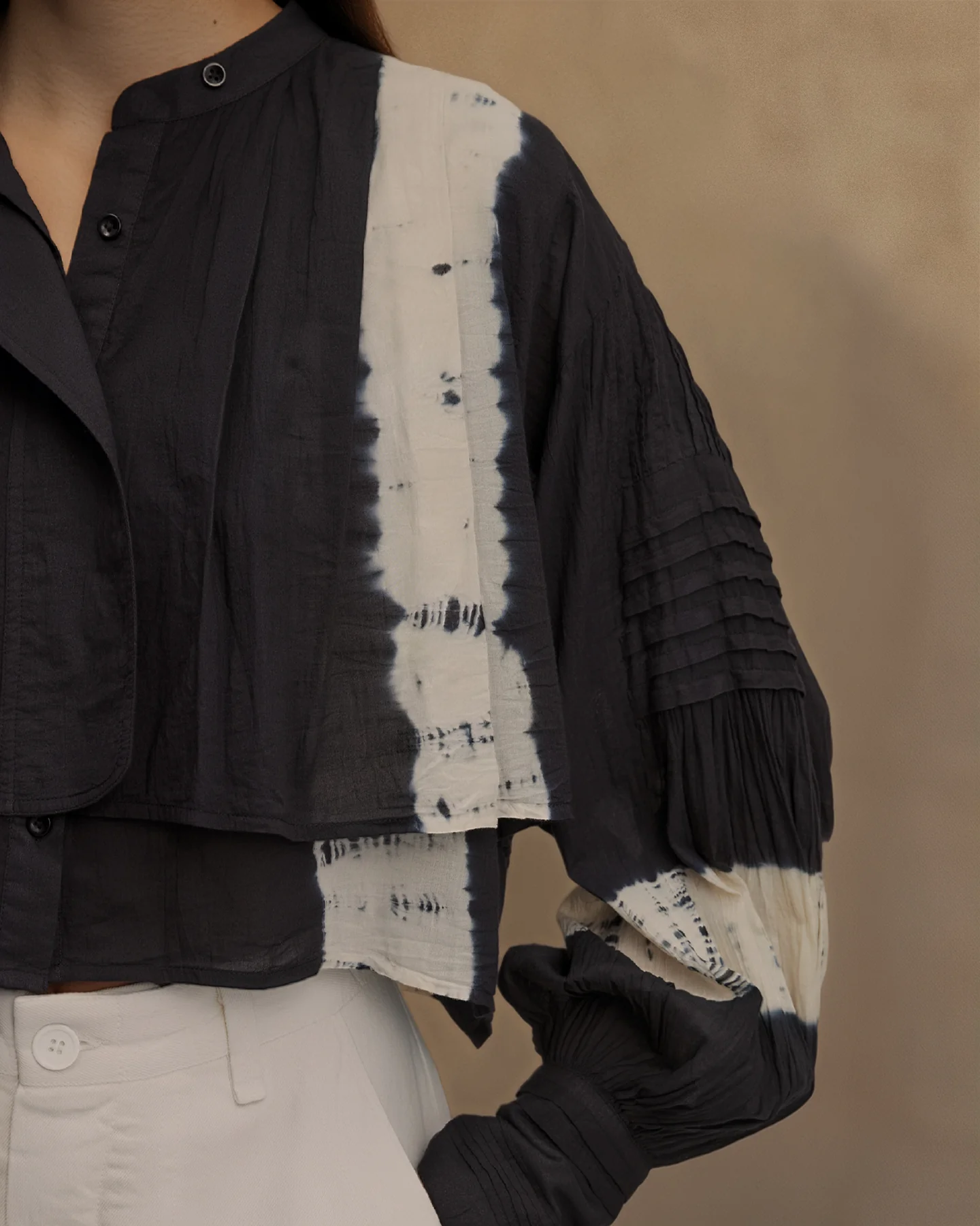 Notre chemise coupe courte en coton noir, offre un style à la fois dynamique et sophistiqué. Son boutonnage croisé et son jeu de pans ajoutent une touche d’originalité, tandis que les manches longues et souples offrent un confort optimal. Une bande écru sur le côté ajoute une note sportive et contemporaine à l’ensemble.
