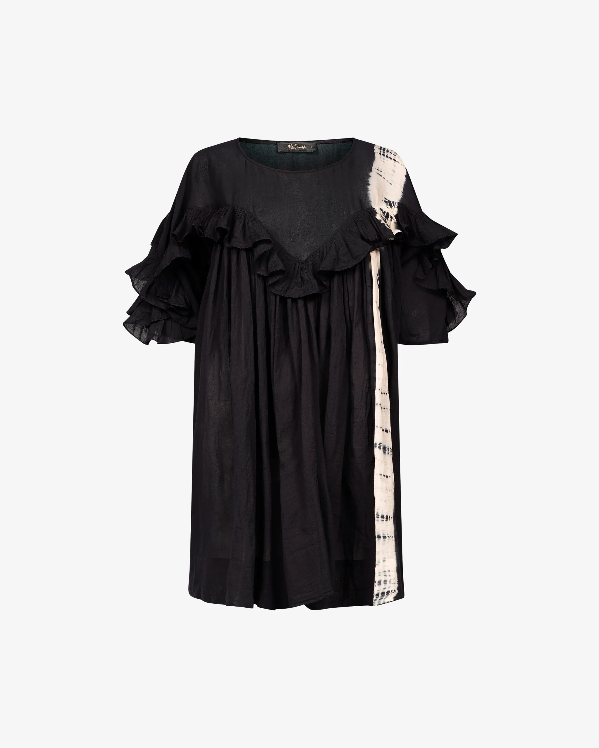 Cette pièce en coton noir se distingue par son volume généreux et son travail de volants délicats qui ornent le décolleté et les manches, créant un mouvement aérien et romantique. Elle arbore une bande verticale contrastée en tie-dye blanc et noir, apportant une touche graphique et artisanale à sa silhouette fluide.