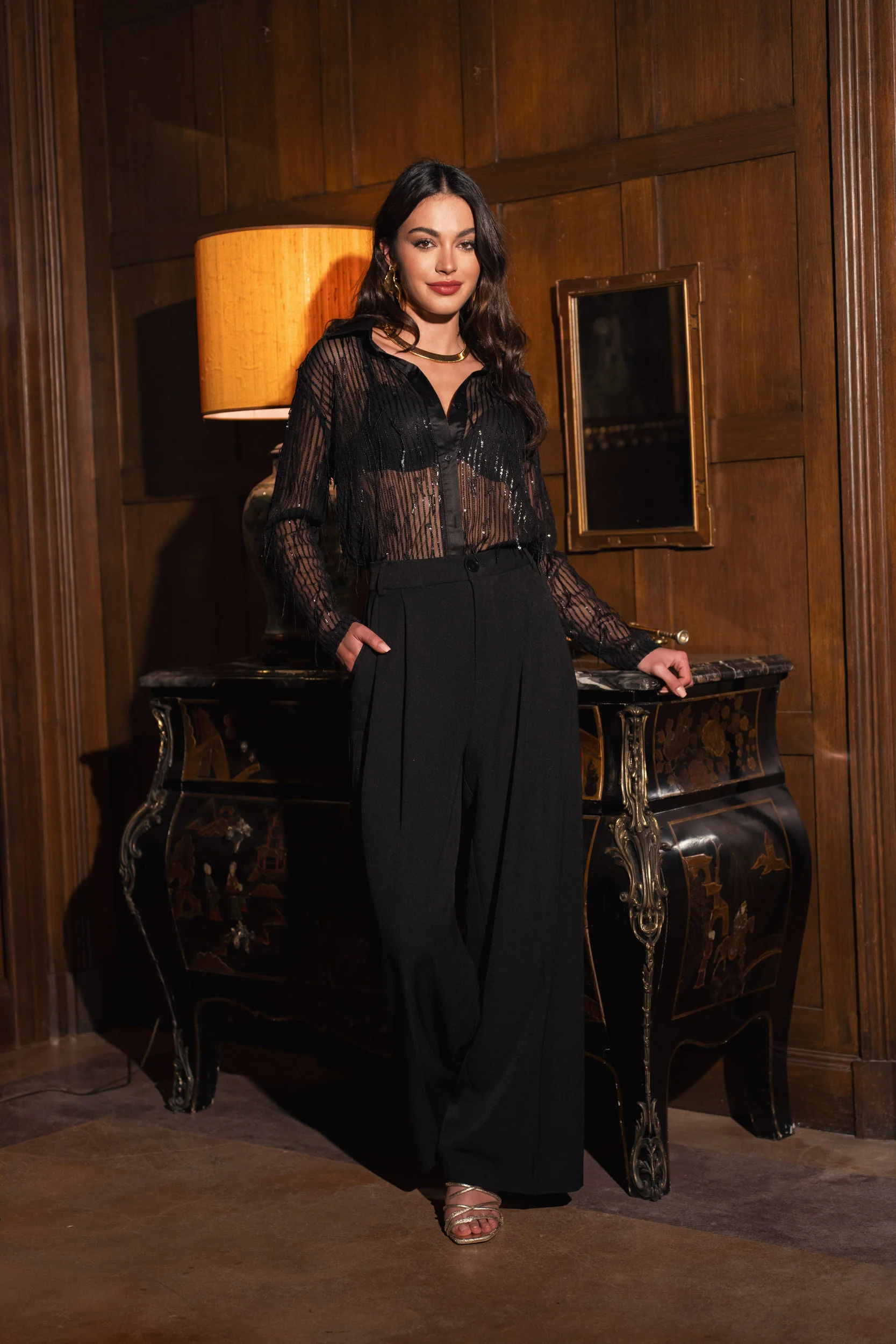 Pour un look élégant, associez-la à un pantalon taille haute et des escarpins pour souligner la silhouette. Pour un style plus audacieux, optez pour une jupe en cuir ou un pantalon en vinyle. Complétez avec des accessoires métalliques et des boucles d’oreilles délicates pour une touche glamour.