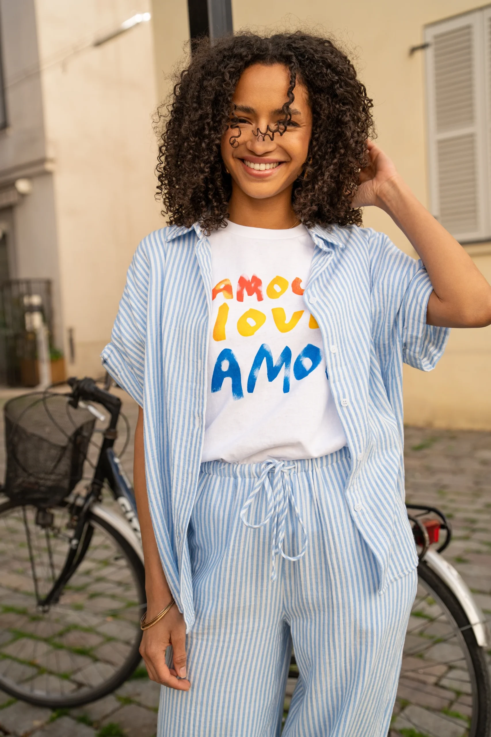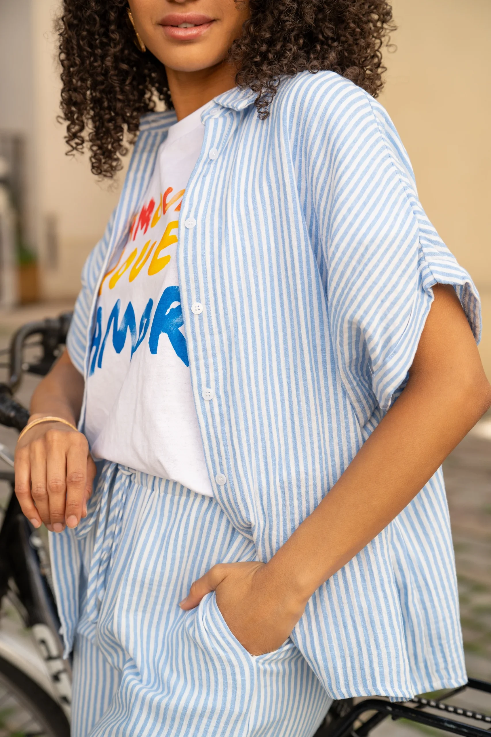 La chemise Nia revisite un grand classique avec une touche de fraîcheur estivale. À manches courtes, elle affiche une coupe épurée soulignée par un col classique et une patte de boutonnage discrète. Son motif à rayures, à la fois intemporel et graphique, lui apporte du caractère sans en faire trop. Légère et facile à associer, elle se porte aussi bien rentrée dans un pantalon taille haute que nouée sur une jupe fluide.