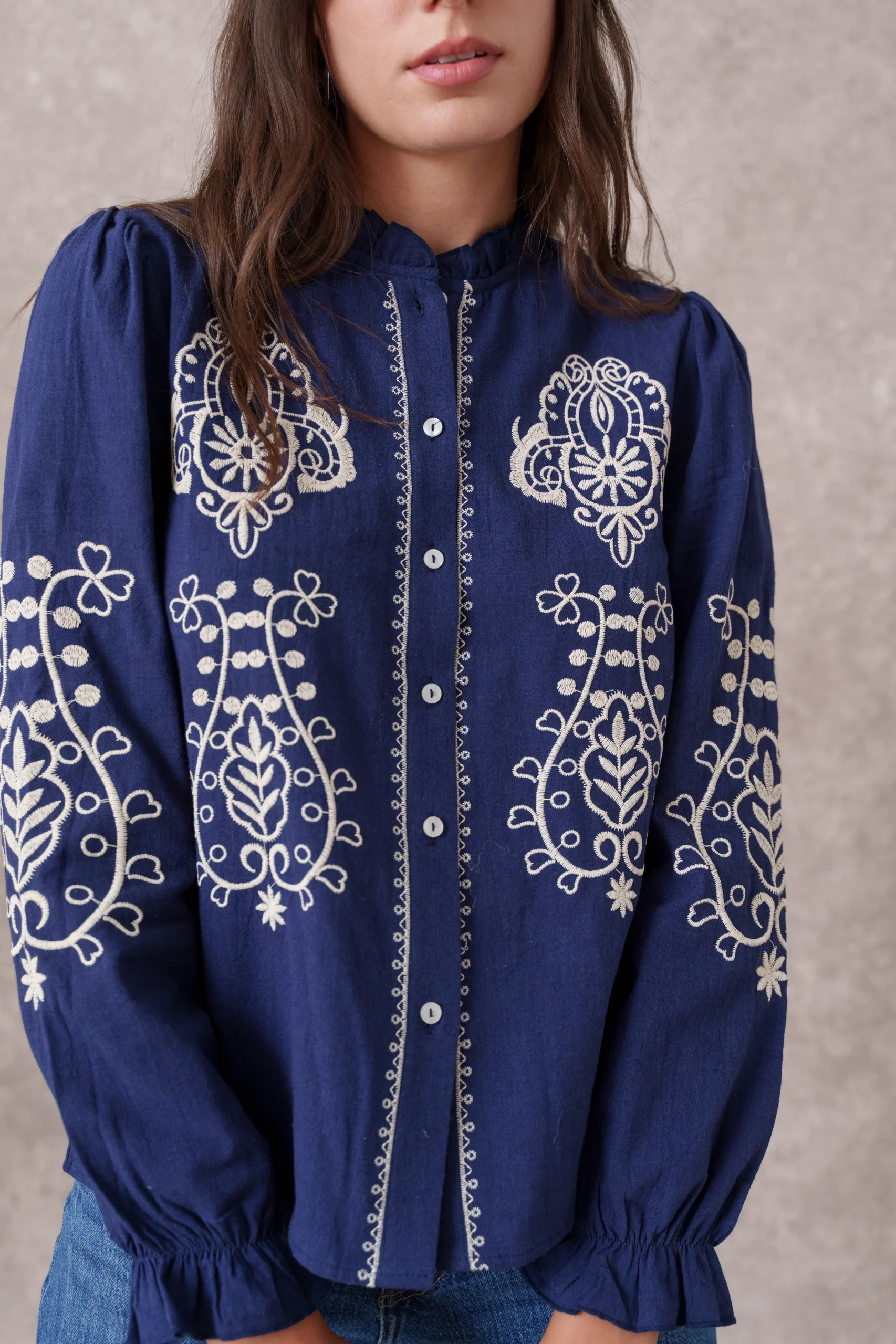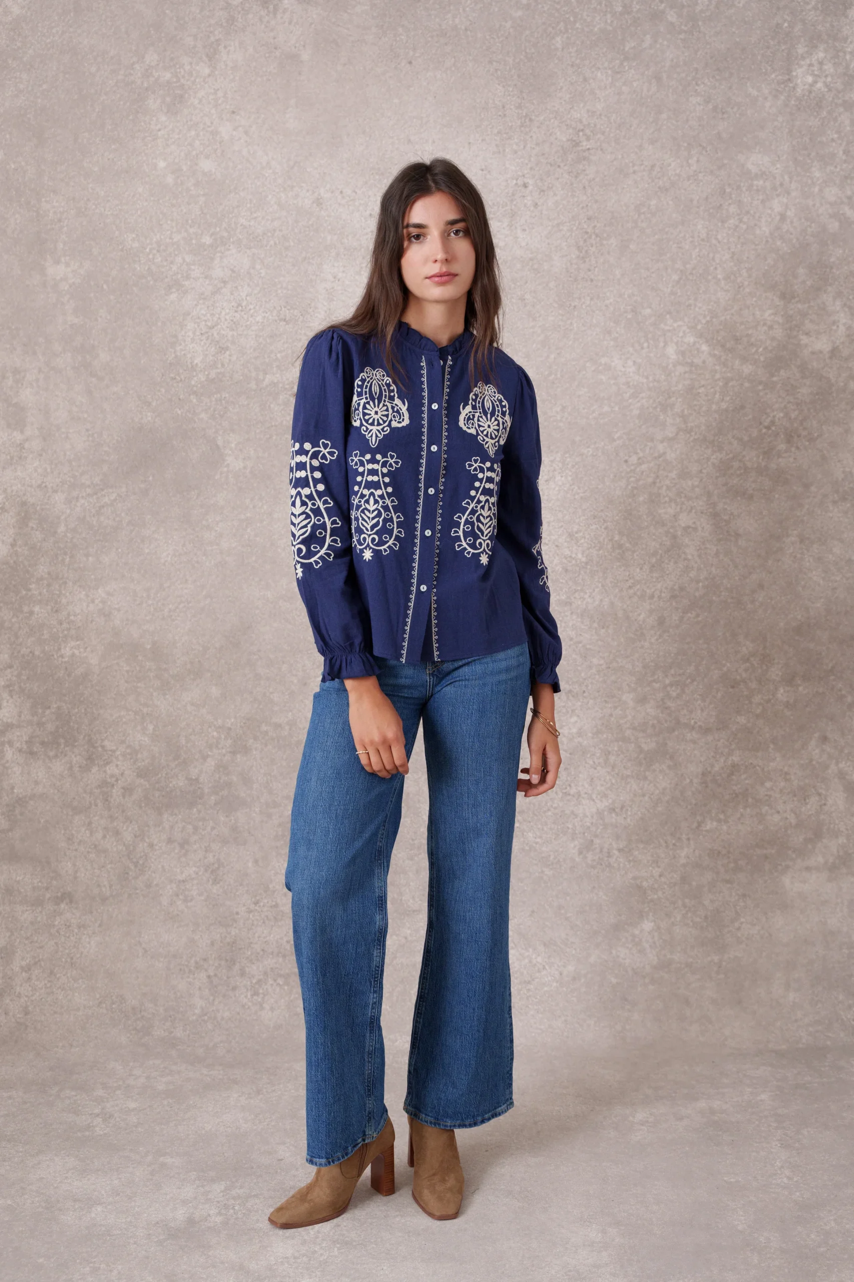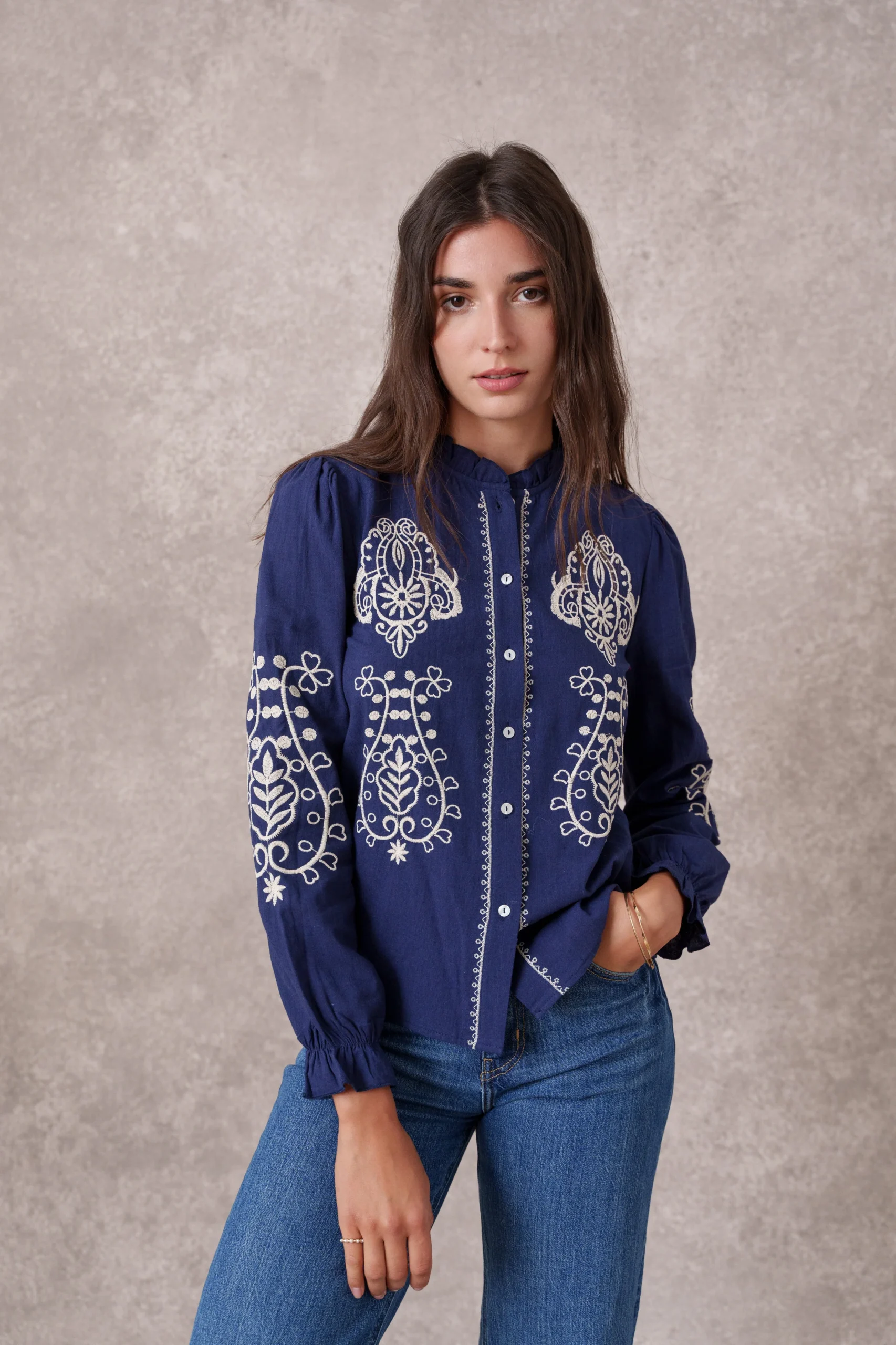 La chemise Soline fait partie des pièces phares de notre nouvelle collection Joli Minois. Ses motifs brodés symétriques lui apportent de la structure, ce qui vous permettra d’oser la porter avec un pantalon taille haute et une coupe plus évasée. Cette pièce est un véritable coup de cœur de la saison.