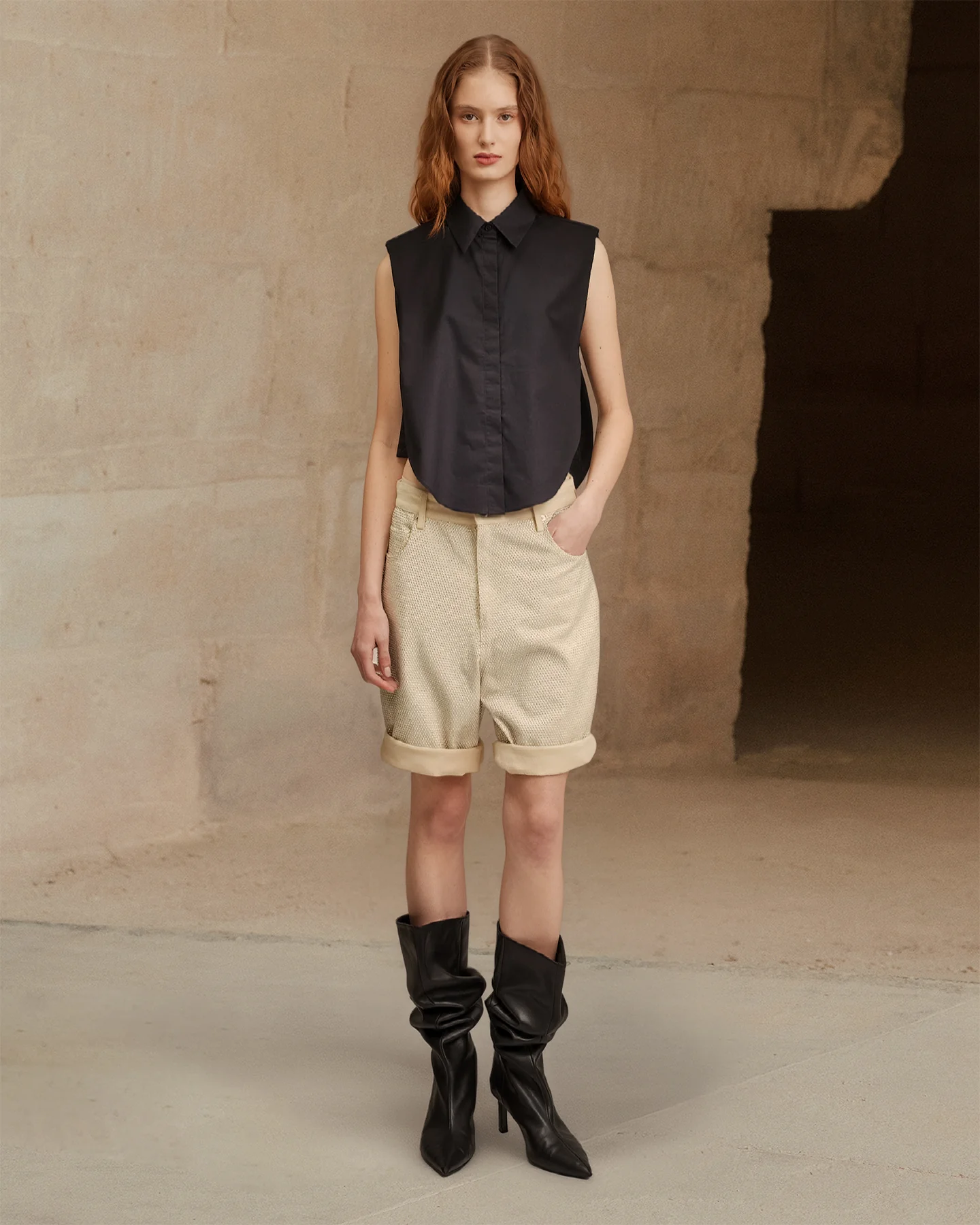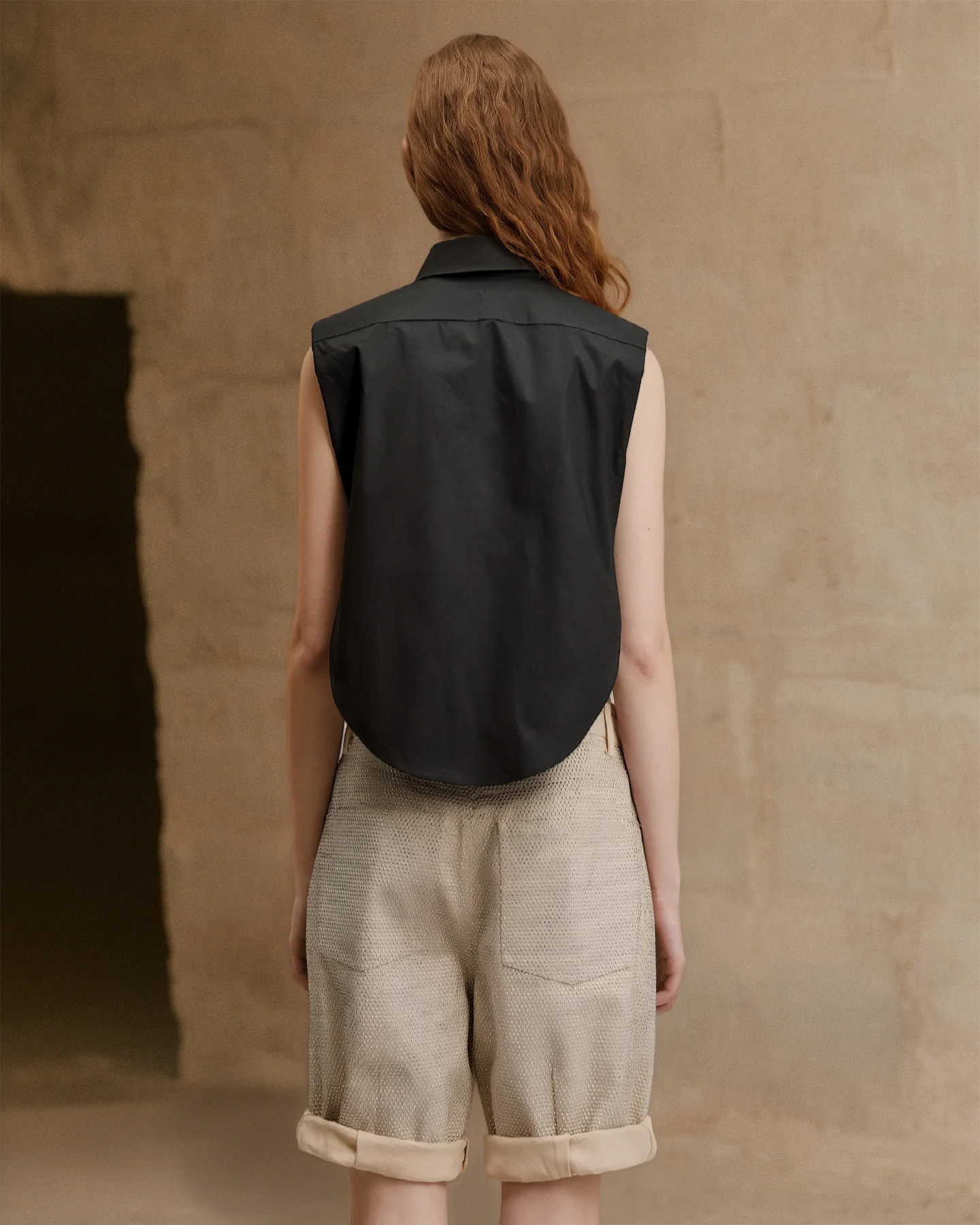Notre petit top au style esprit chemise est conçu pour être porté avec désinvolture, il offre un look tendance et ajusté grâce à ses nouages réglables sur les côtés pour un ajustement parfait. Fabriqué en coton léger, il est réalisé en uni noir qui ajoutent une touche de sophistication à cette pièce raffinée mais décontractée.