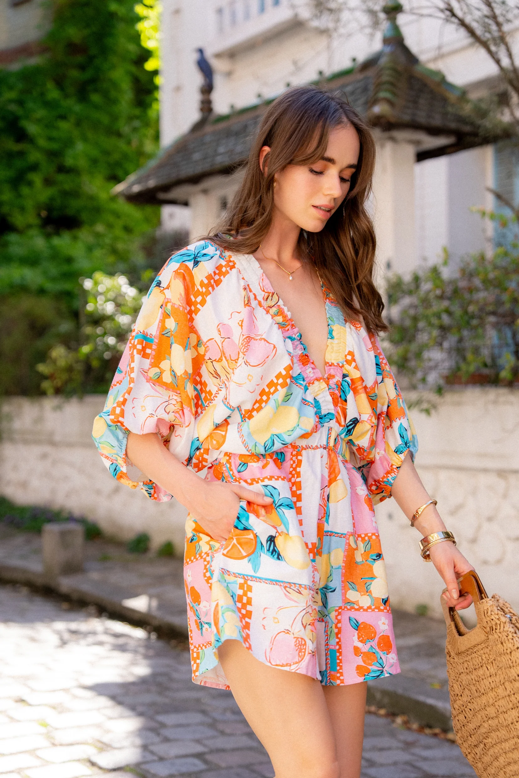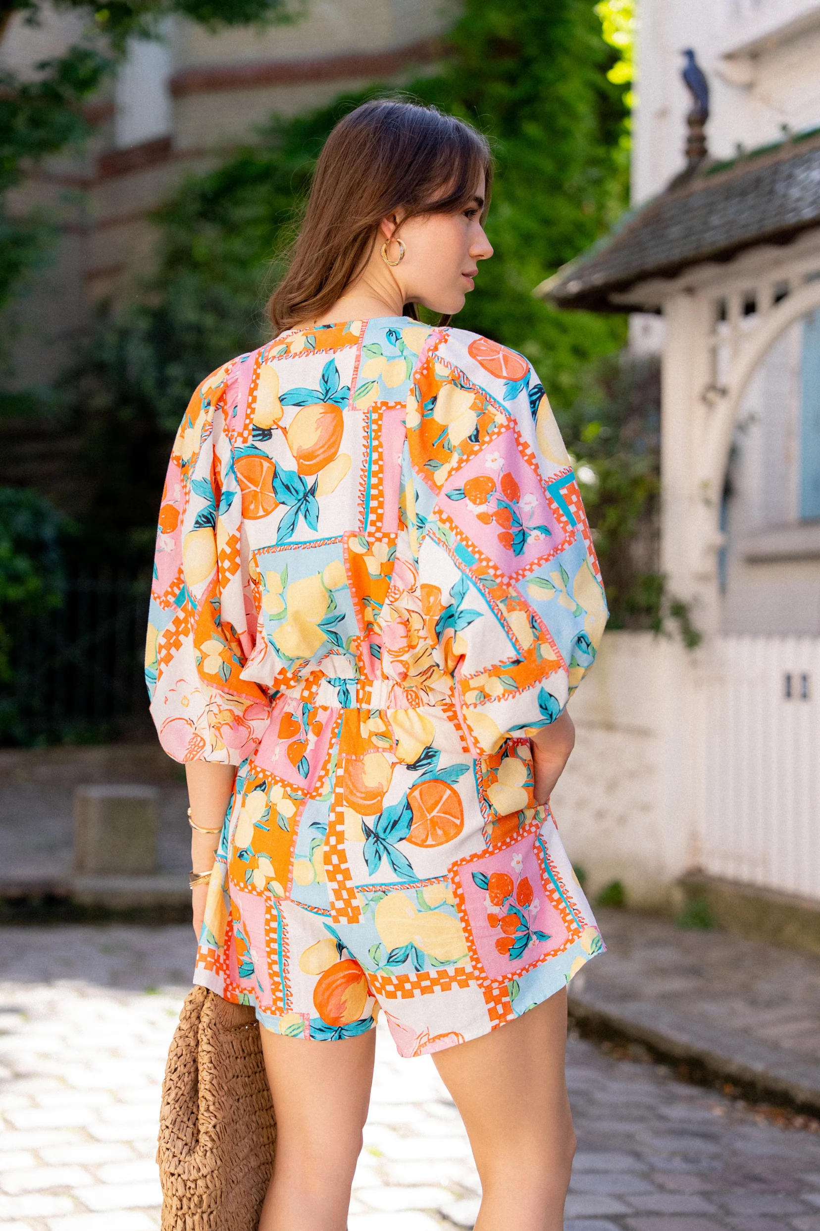 La Combishort Sophia, une pièce lumineuse et joyeuse. Son imprimé fruité mêlant citrons, pêches et oranges évoque les journées ensoleillées et les escapades sous le ciel bleu. Confectionnée dans un tissu doux en coton majoritaire, elle allie confort et style avec brio.