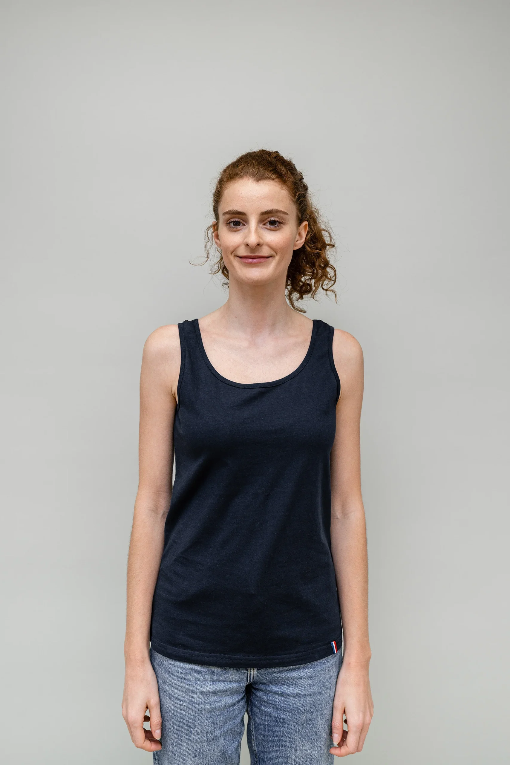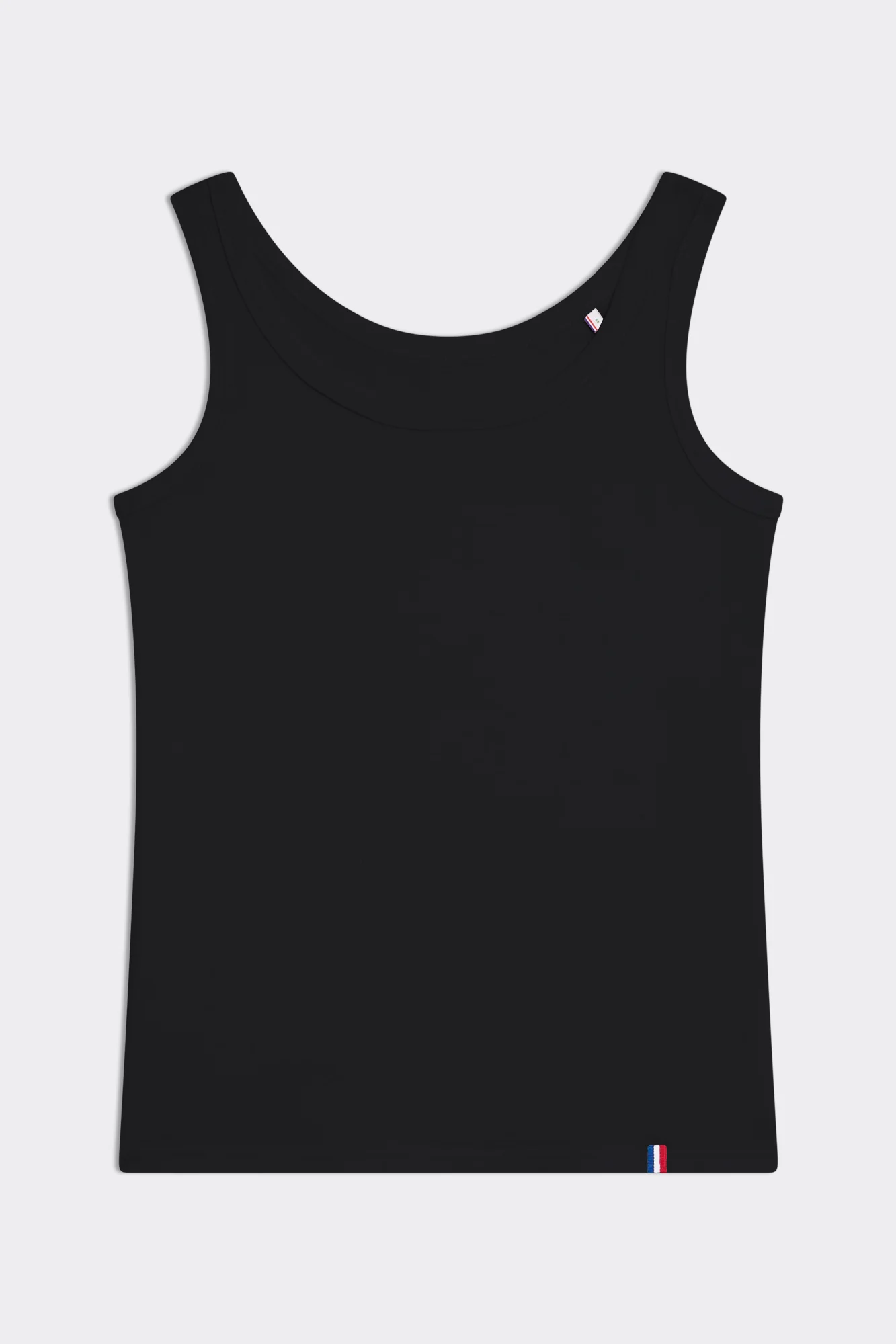 Débardeur femme, jersey 180g, 100% coton biologique.Disponible en 6 tailles, du XS au XXL.Coupe standard, coupé cousu, avec détail tricolore en bas àgauche. Décliné en 4 coloris : noir, bleu marine, blanc et gris chiné.Conçu et fabriqué en France, sous le label « Origine France Garantie«