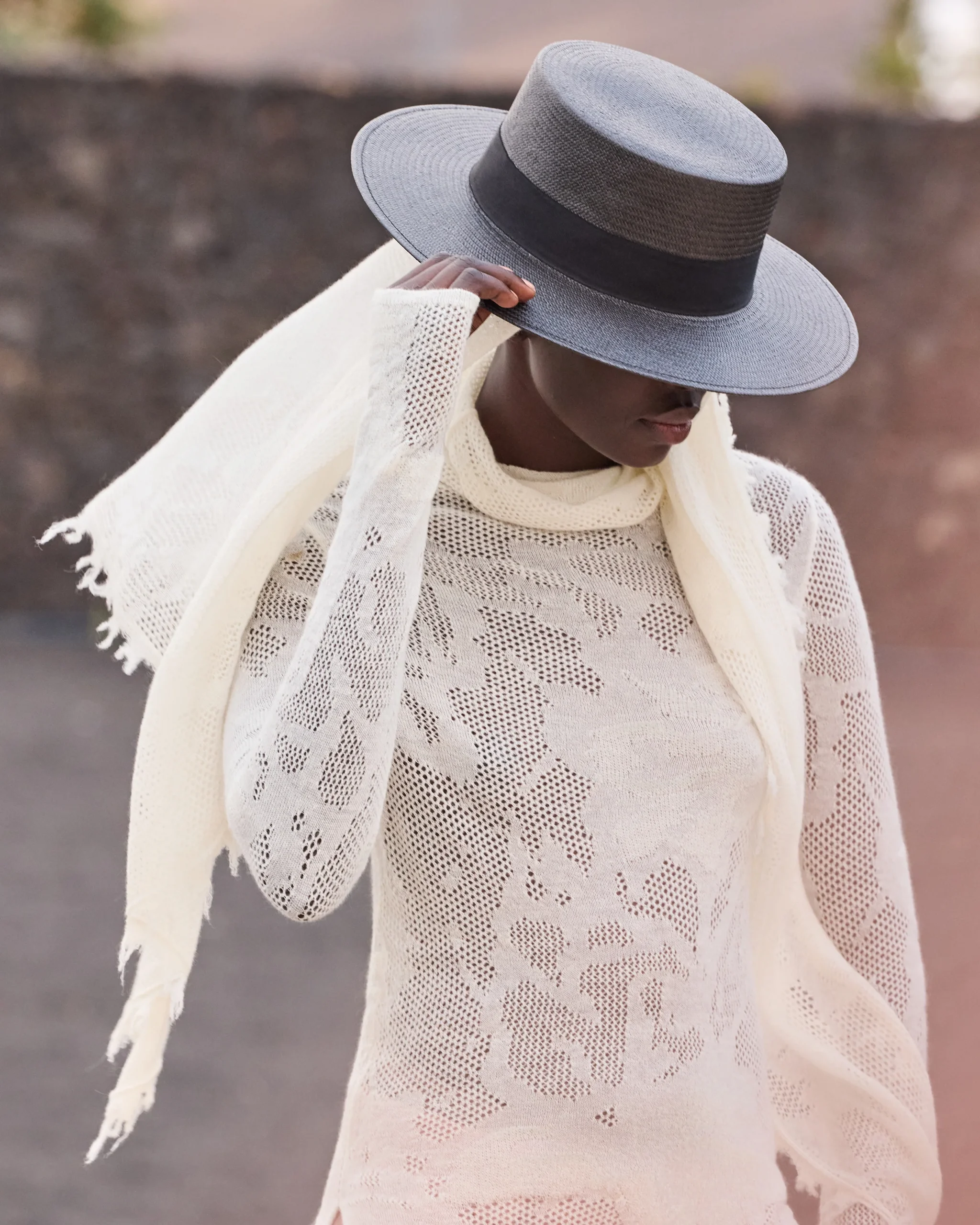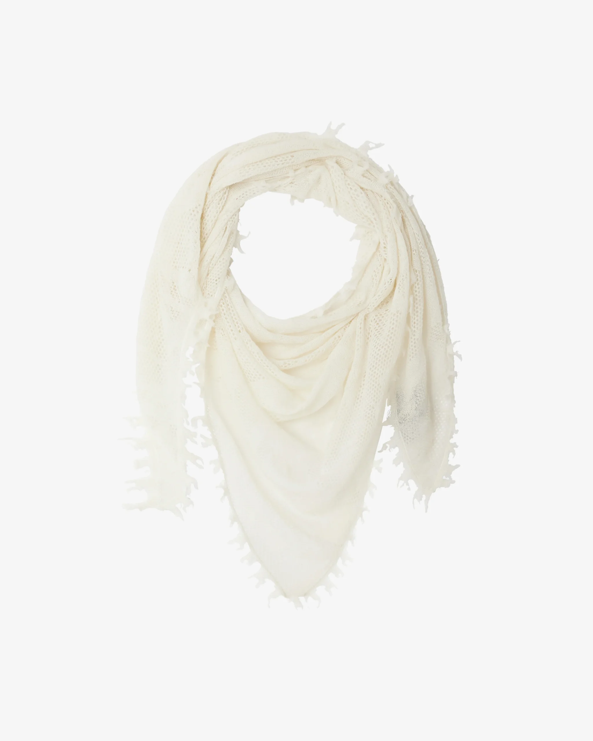 Réalisé dans une maille d’alpaca souple et aérée, ce foulard ivoire de forme triangulaire reprend le délicat motif de fleurs ajourées caractéristique de la gamme pointelle. Travaillée comme une dentelle, la matière offre un jeu subtil de transparence et une légèreté enveloppante.