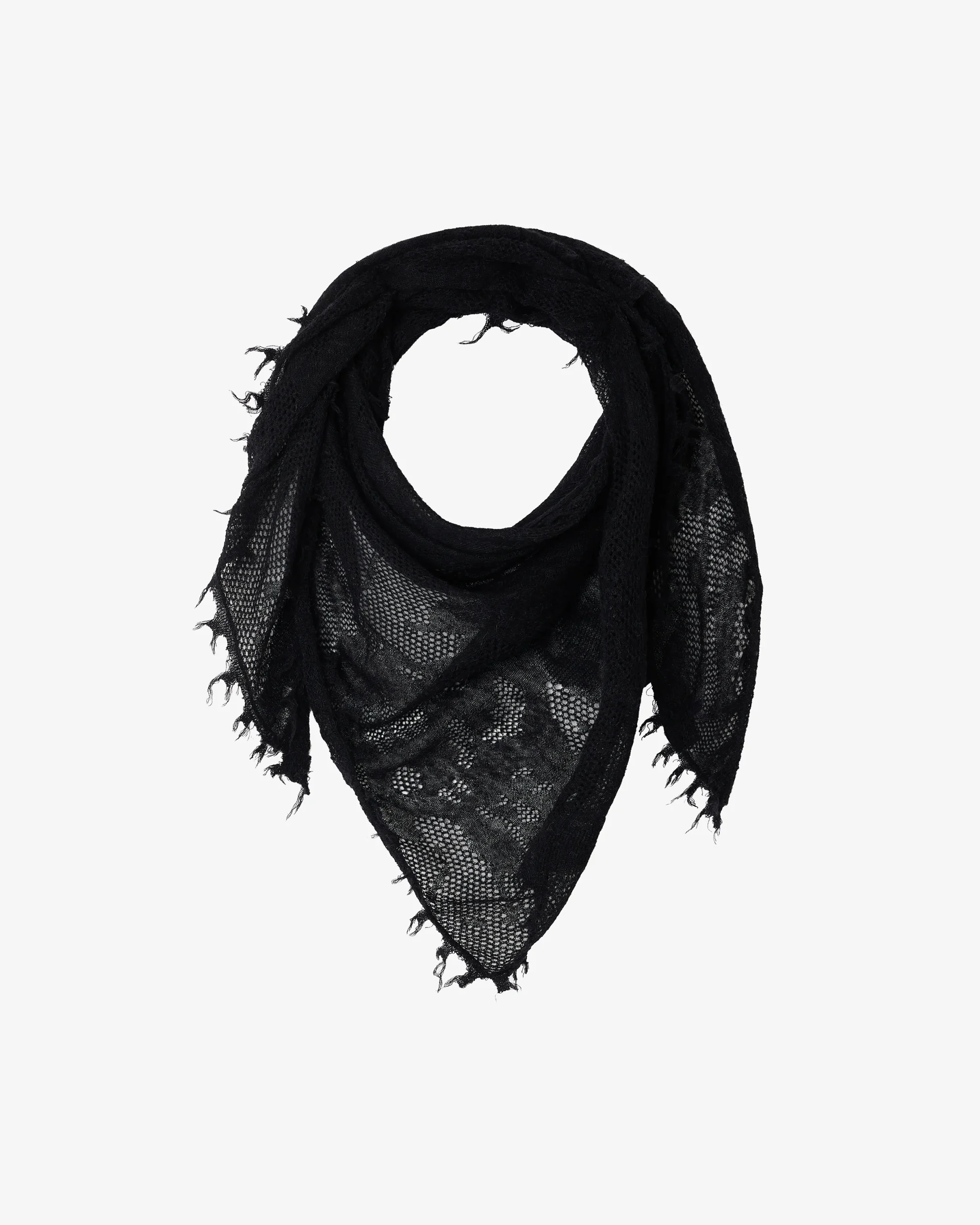 Réalisé dans une maille d’alpaca souple et aérée, ce foulard noir de forme triangulaire reprend le délicat motif de fleurs ajourées caractéristique de la gamme pointelle. Travaillée comme une dentelle, la matière offre un jeu subtil de transparence et une légèreté enveloppante.