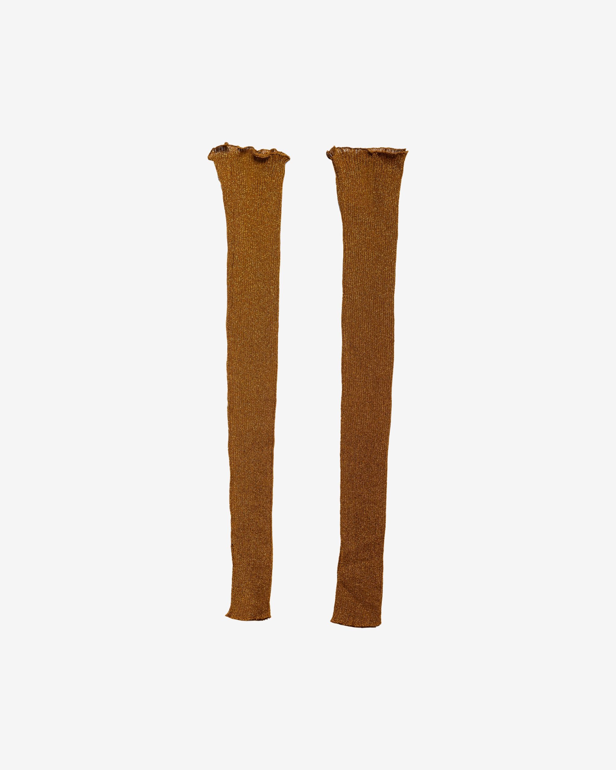 Un accessoire original et élégant, confectionné dans une maille fine de viscose couleur ocre, réchauffée par un fil scintillant doré pour un éclat discret. La longue coupe s’étend jusqu’au coude et est magnifiée par un tricot fin en côtes, tandis que leur extrémité présente un ourlet délicatement ondulé.