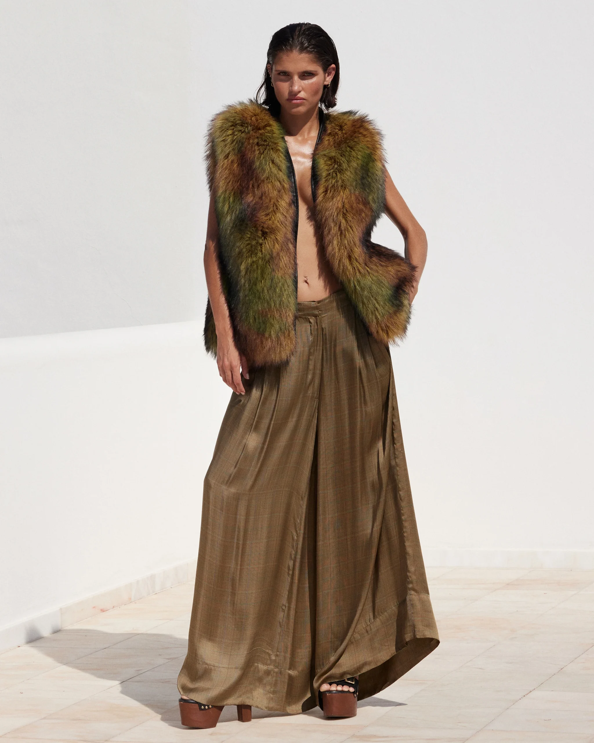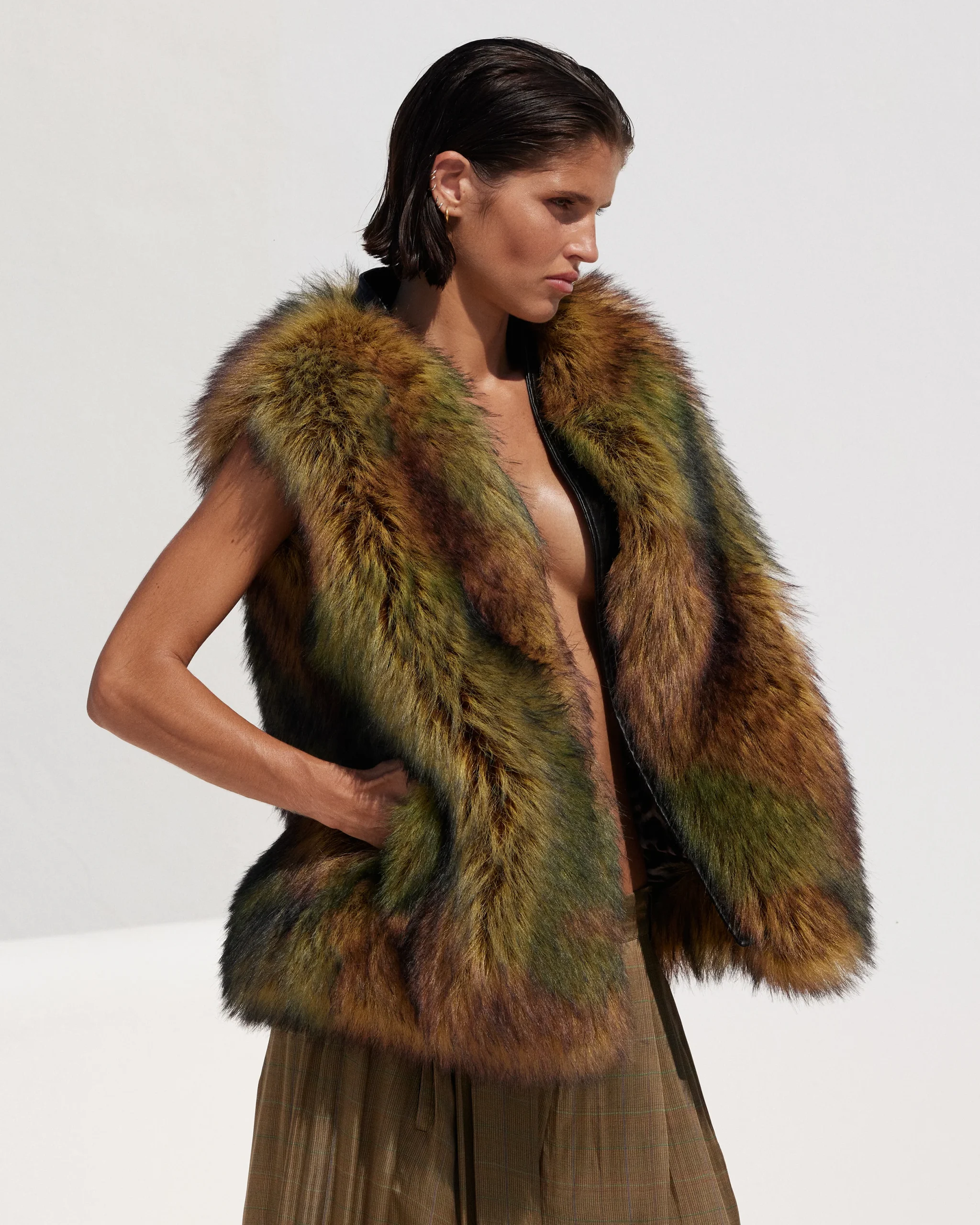 Confectionné dans une fausse fourrure au coloris kaki aux reflets changeants, ce gilet sans manches se porte court et affiche une encolure ouverte qui souligne sa modernité. L’intérieur révèle une doublure imprimée léopard, contrastant avec élégance l’aspect extérieur. Une pièce à superposer pour réchauffer une silhouette tout en affirmant son style.