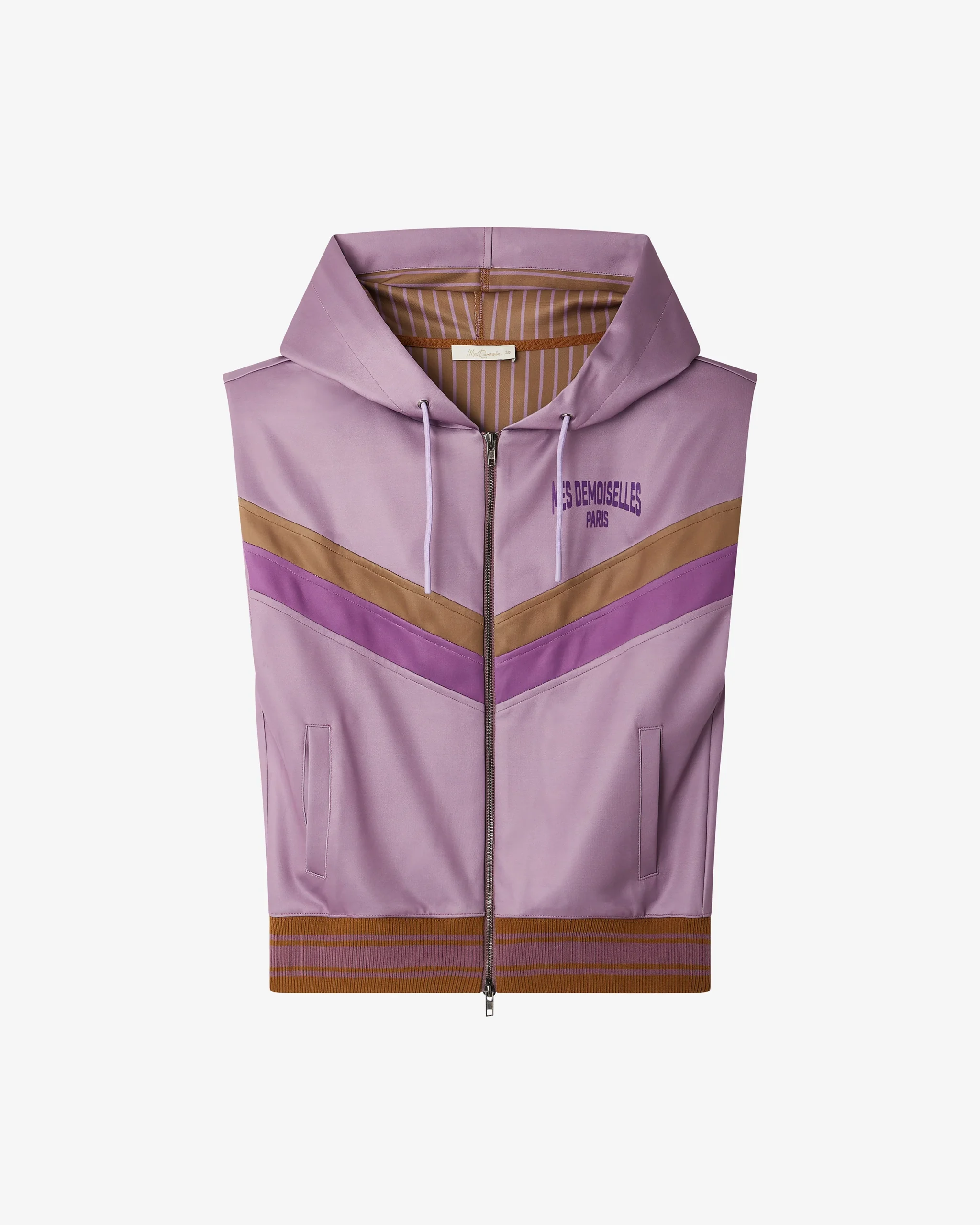Le style sportif avec une sophistication inattendue, se présentant sous la forme d’un gilet sans manches à capuche, dans un coloris lavande délicat et tendance. Sa coupe athlétique est sublimée par des chevrons graphiques dans des tons contrastés de marron et de violet, tandis que la base et la doublure de la capuche affichent de fines rayures marron.