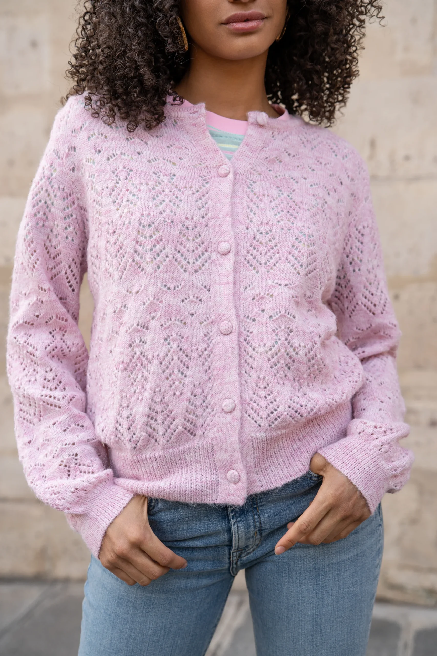 Le gilet Nion enveloppe la silhouette d’une douceur délicate et d’un charme discret. Confectionné dans une maille fine, il se distingue par ses broderies subtiles qui lui confèrent une touche raffinée. Ses manches longues et sa texture douce en font un allié idéal pour les soirées fraîches ou les superpositions légères. À porter ouvert sur une robe ou boutonné sur un top simple pour une allure tout en finesse.
