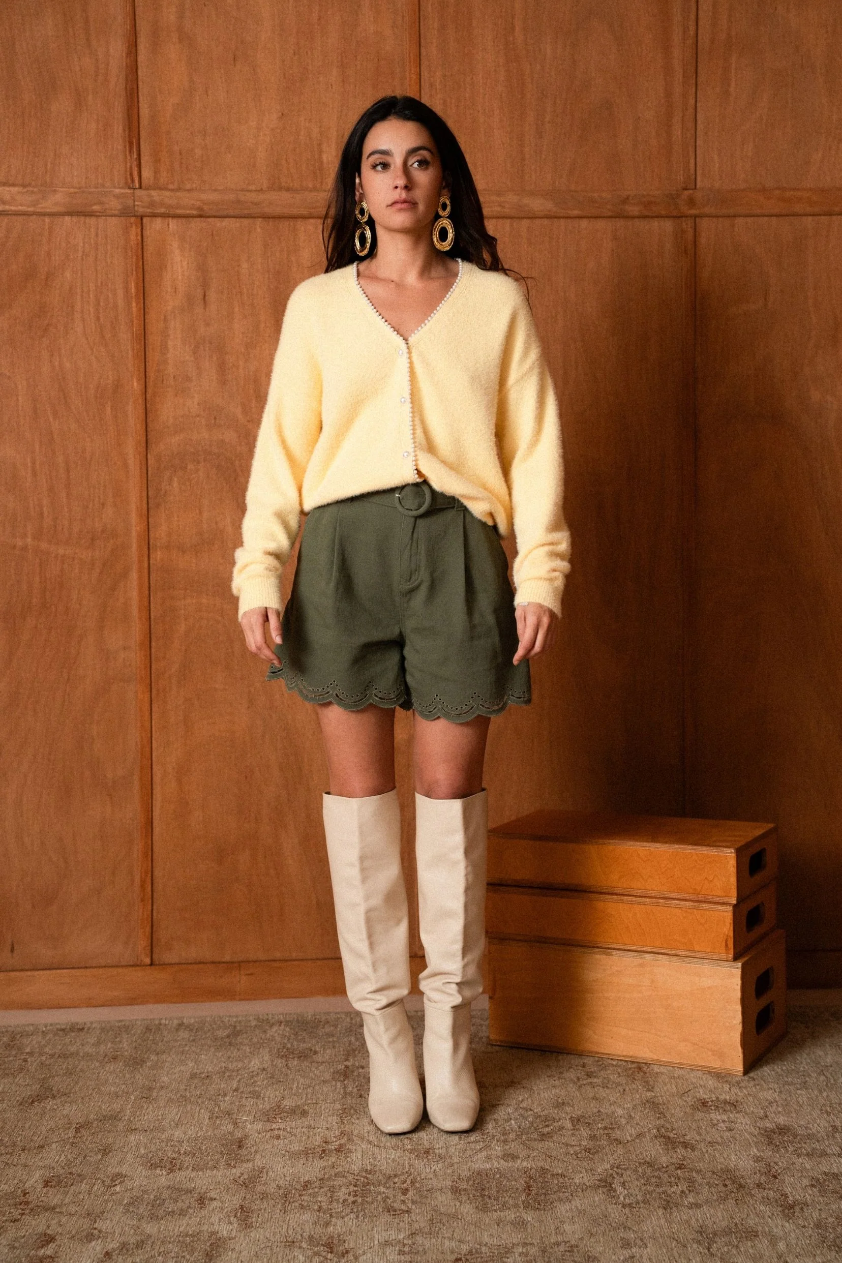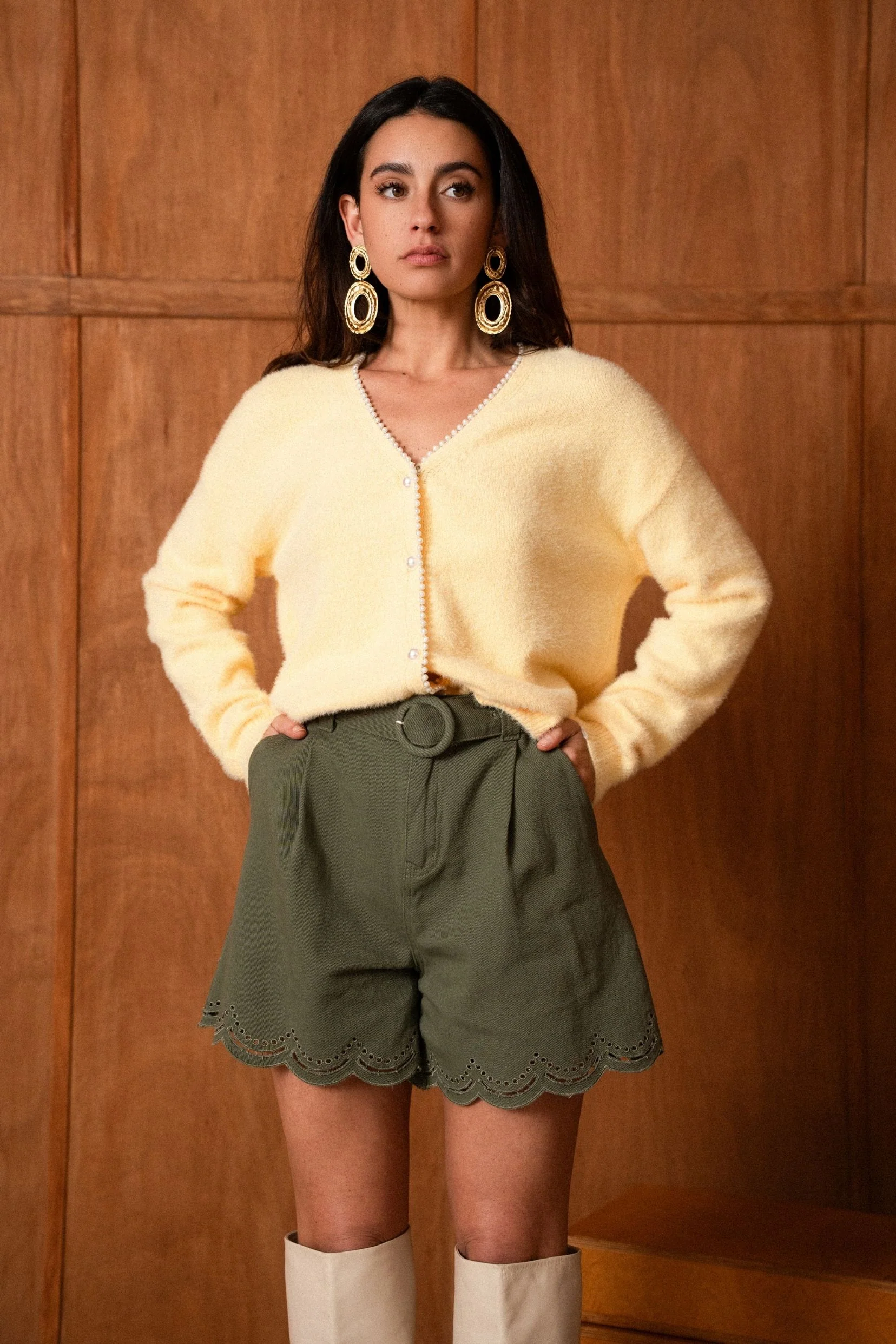 Ursule illumine le vestiaire avec sa teinte jaune douce et solaire. Sa maille légère au toucher moelleux enveloppe la silhouette sans jamais l’alourdir, tandis que ses finitions perlées le long de l’encolure et de la patte de boutonnage apportent cette touche précieuse qu’on aime tant.