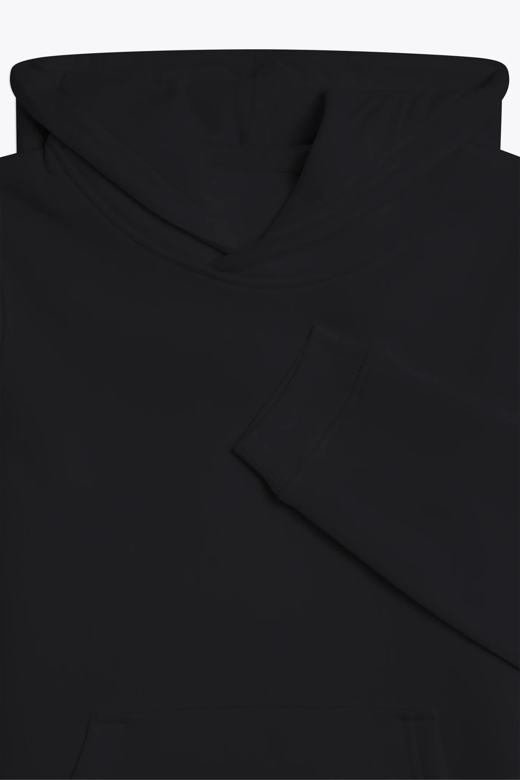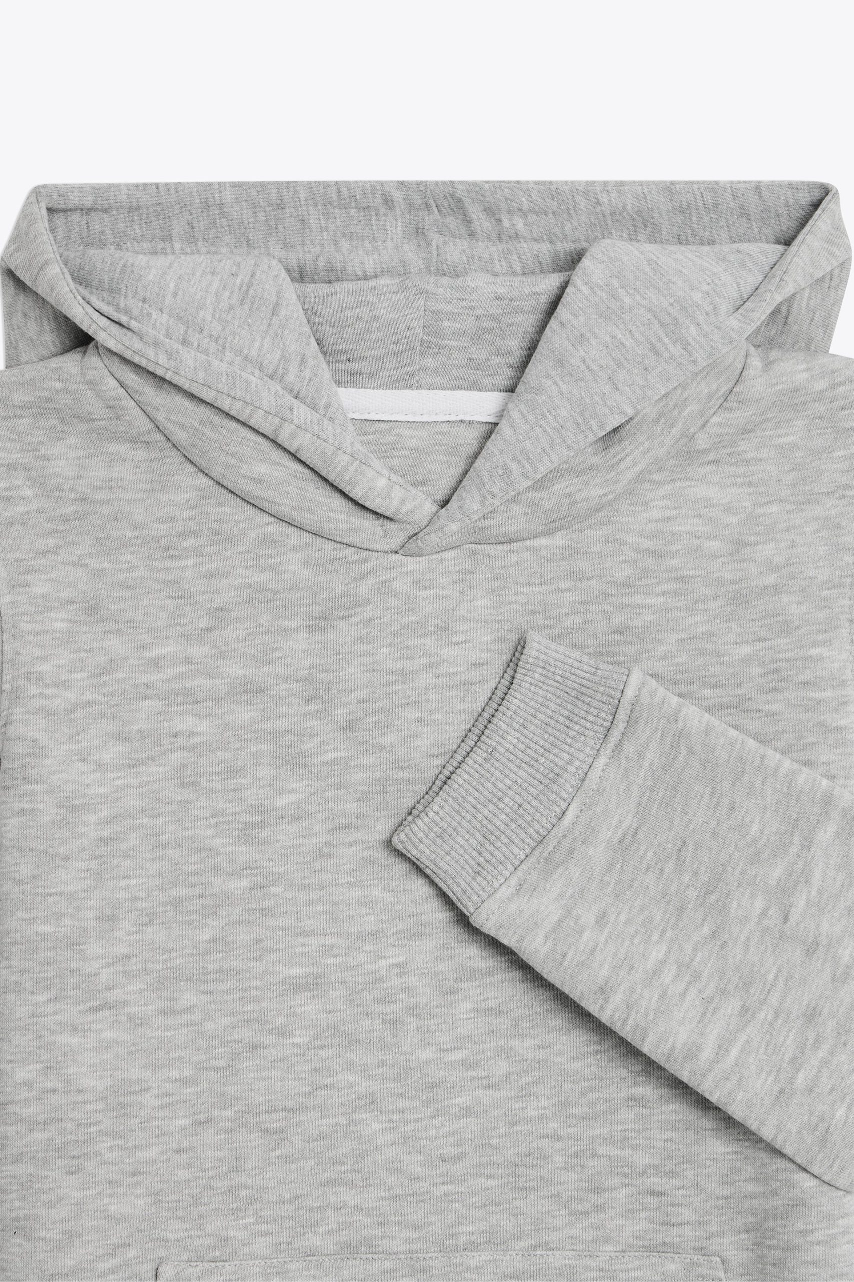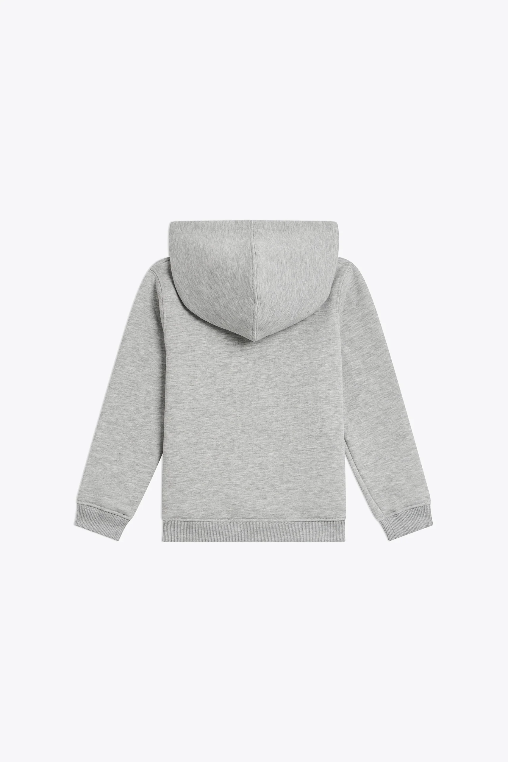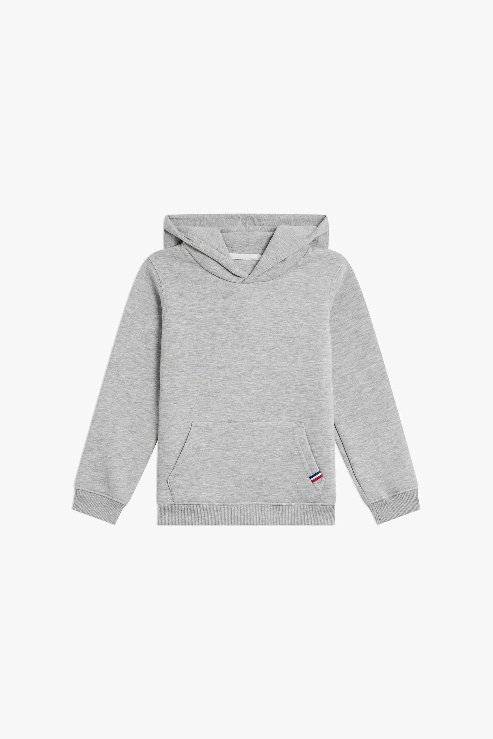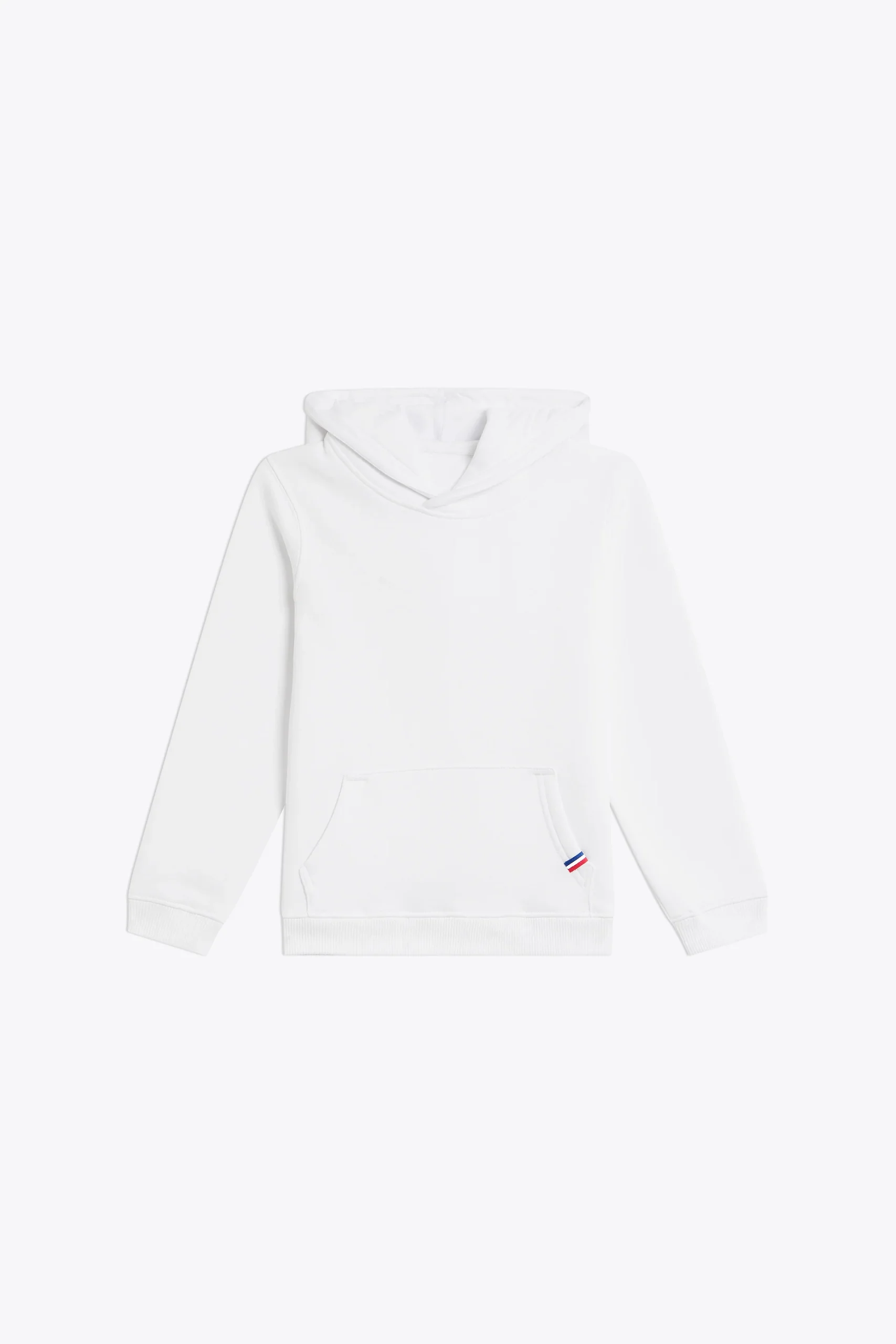 Coupe standard, coupé cousu, capuche sans cordon, bas des manches et du buste en bord cote 2×2, poche ventrale avec détail tricolore pincé poche gauche.