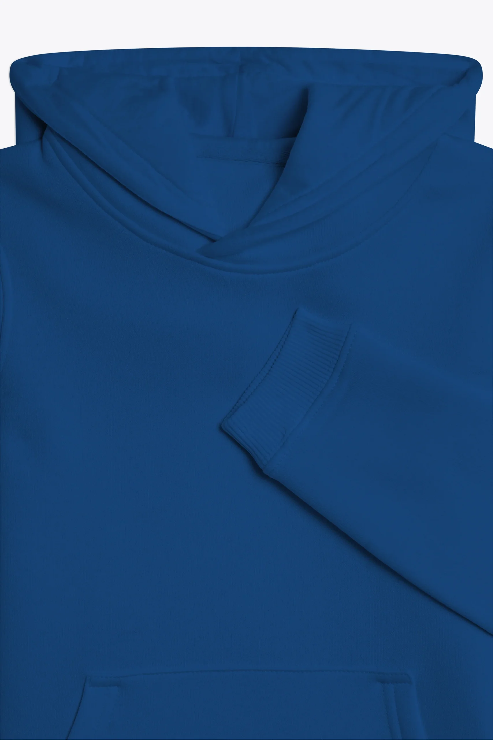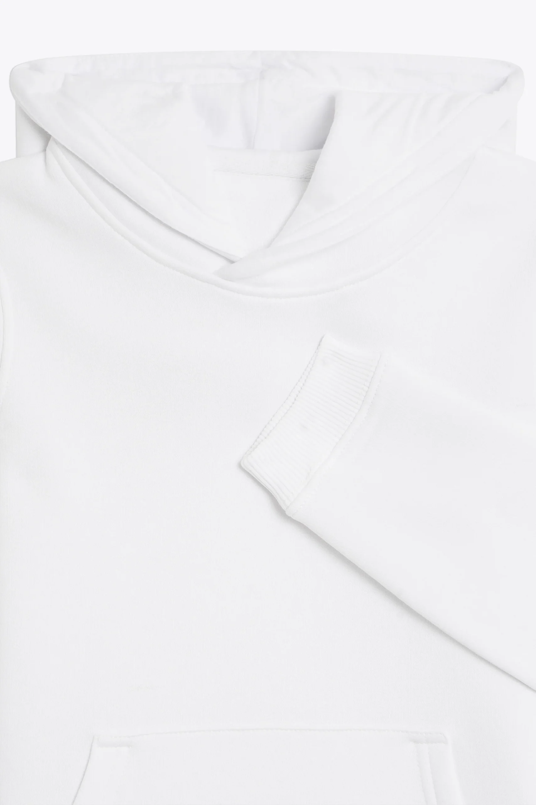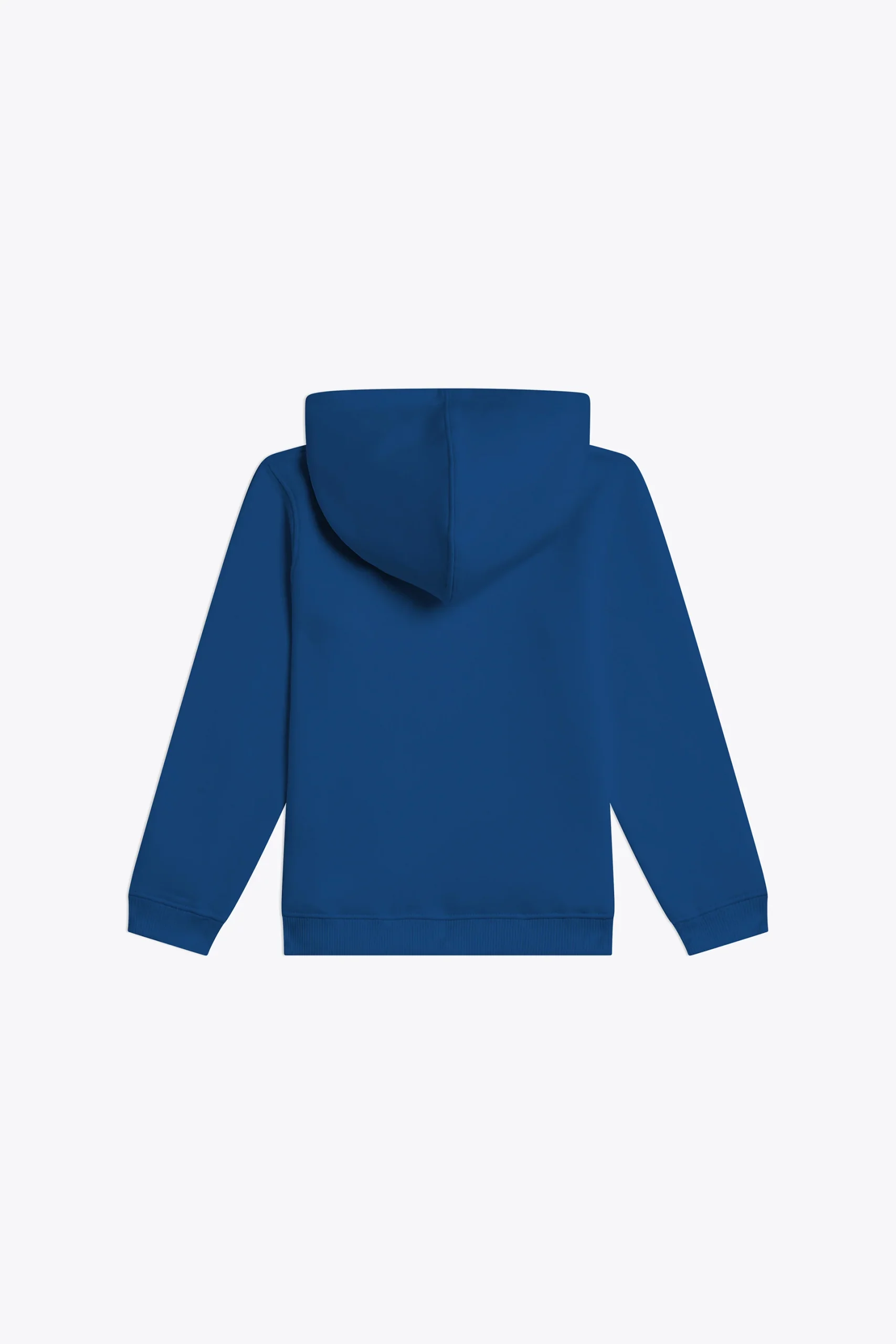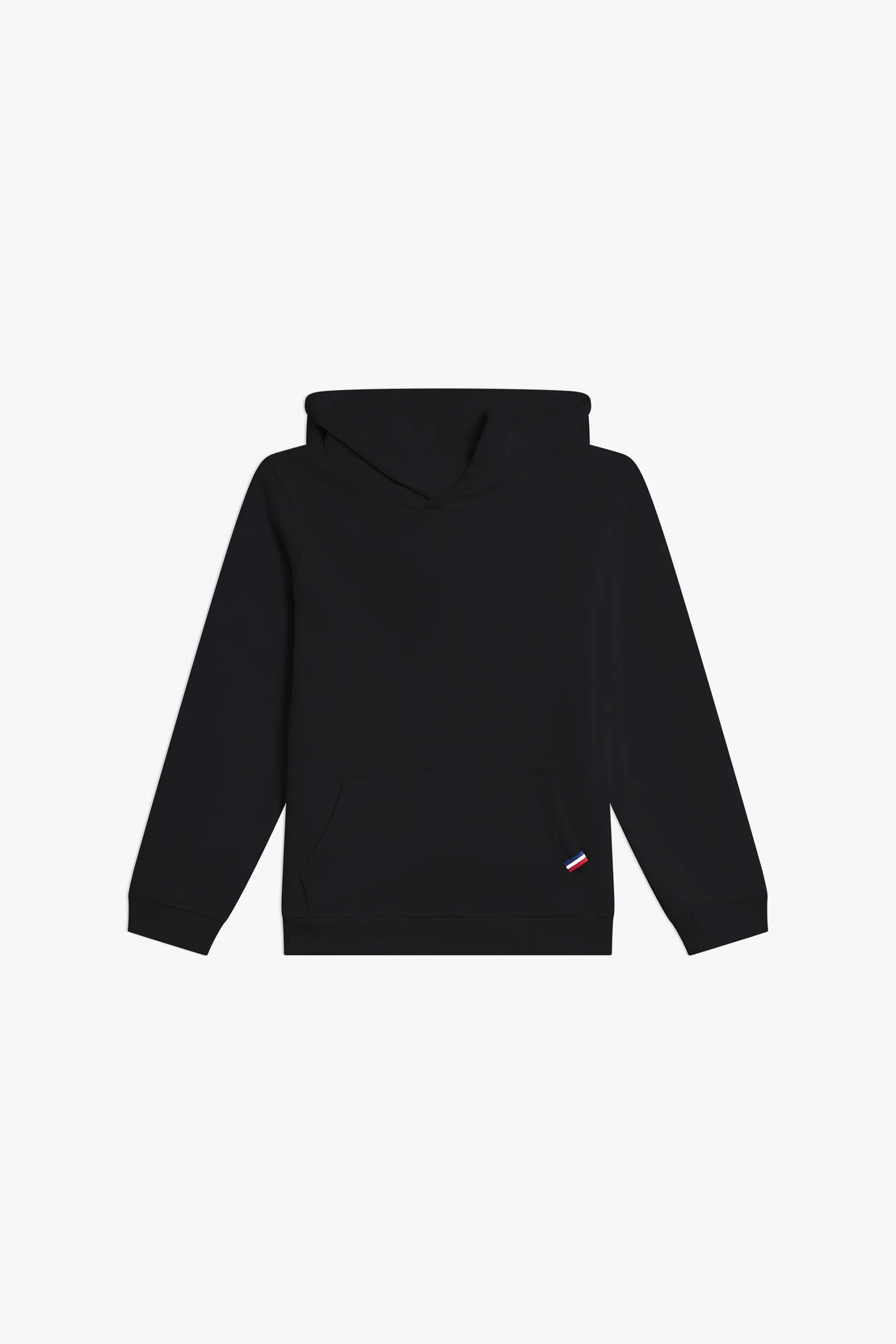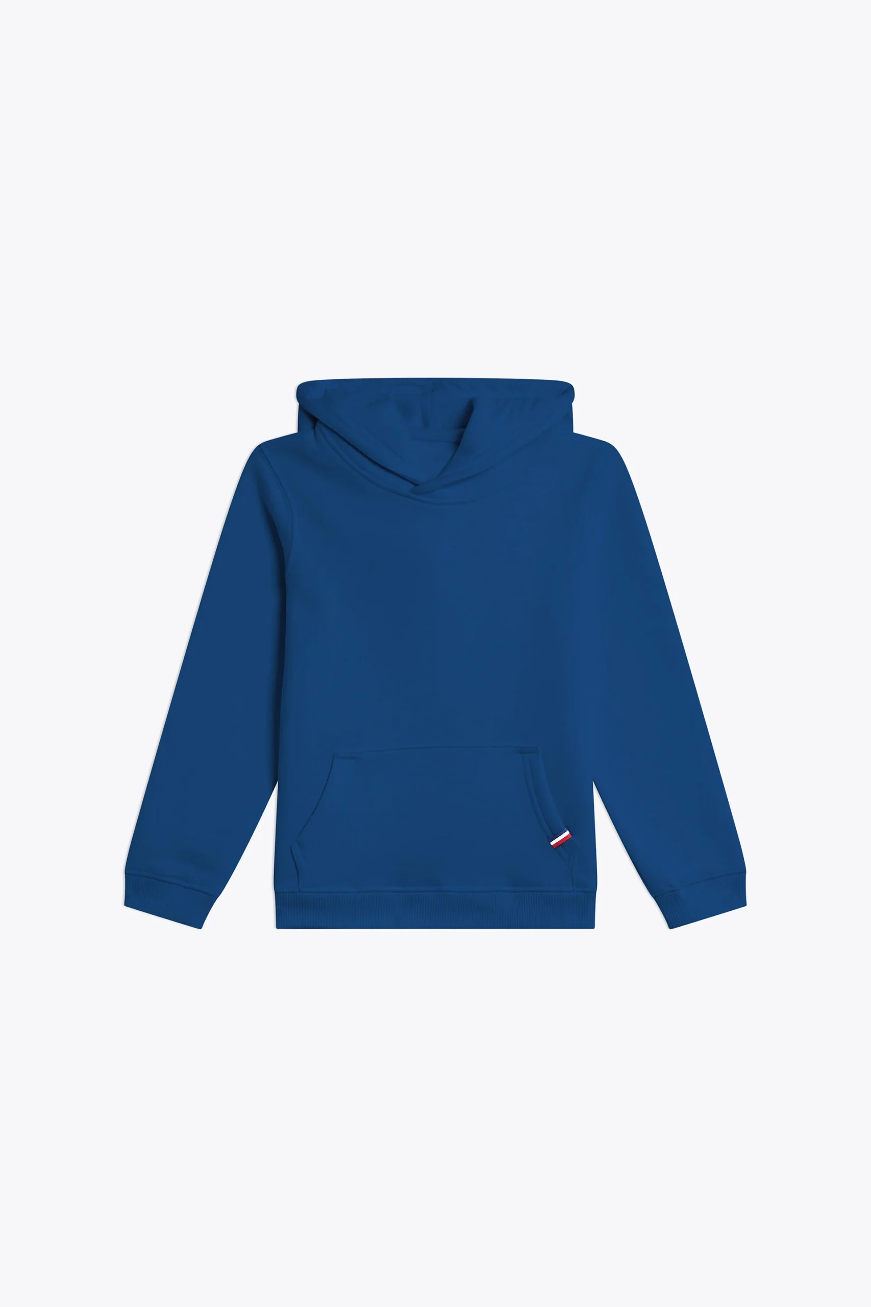 Coupe standard, coupé cousu, capuche sans cordon, bas des manches et du buste en bord cote 2×2, poche ventrale avec détail tricolore pincé poche gauche