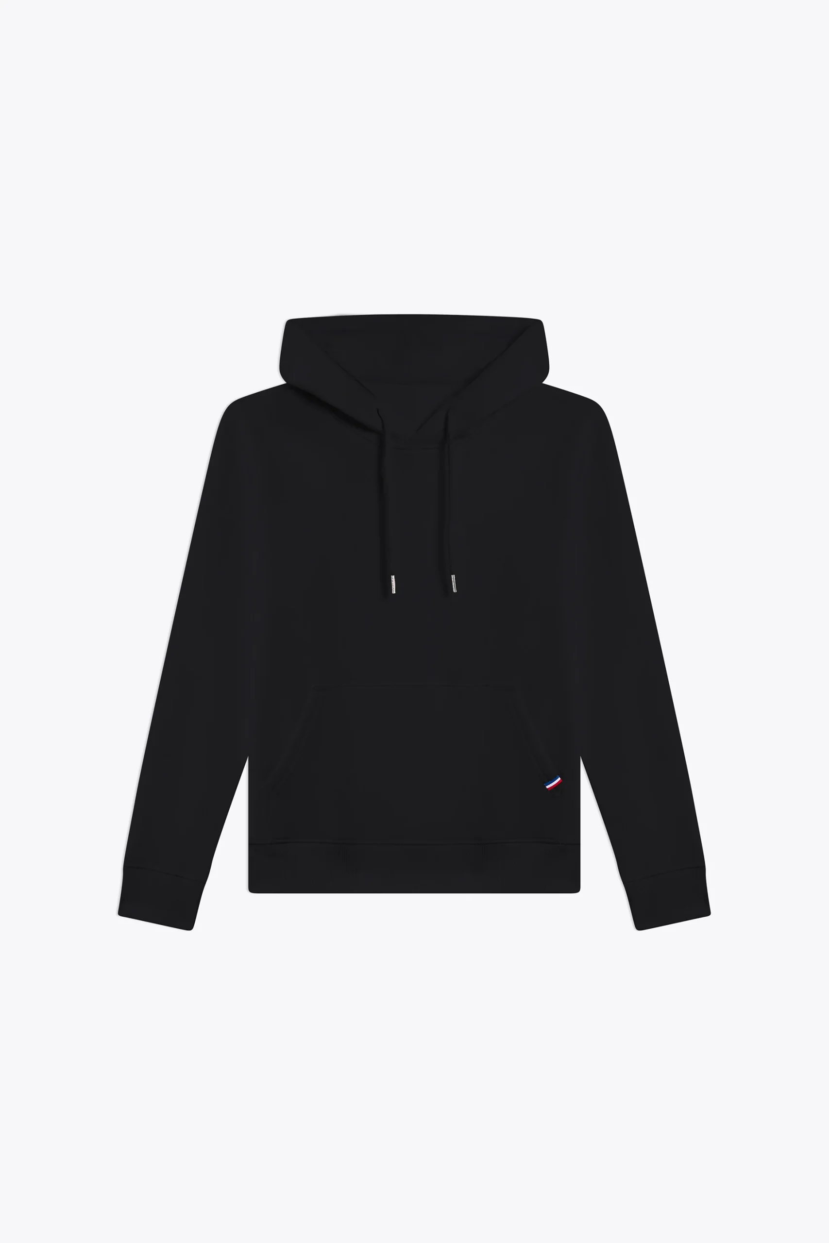 Coupe standard, coupé cousu, capuche avec cordon embout métallique, bas des manches et du buste en bord cote 2×2, poche ventrale avec détail tricolore pincé poche gauche.