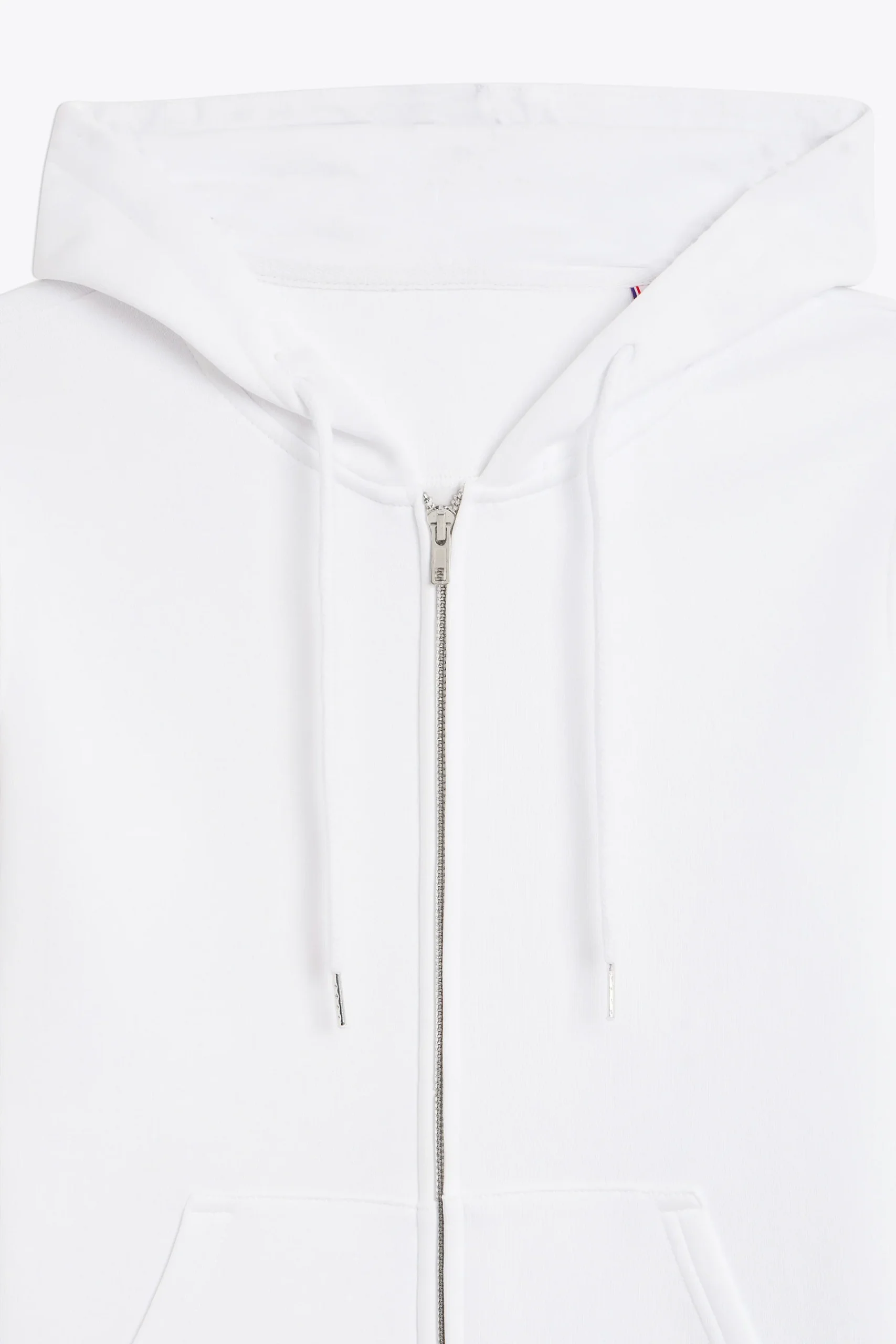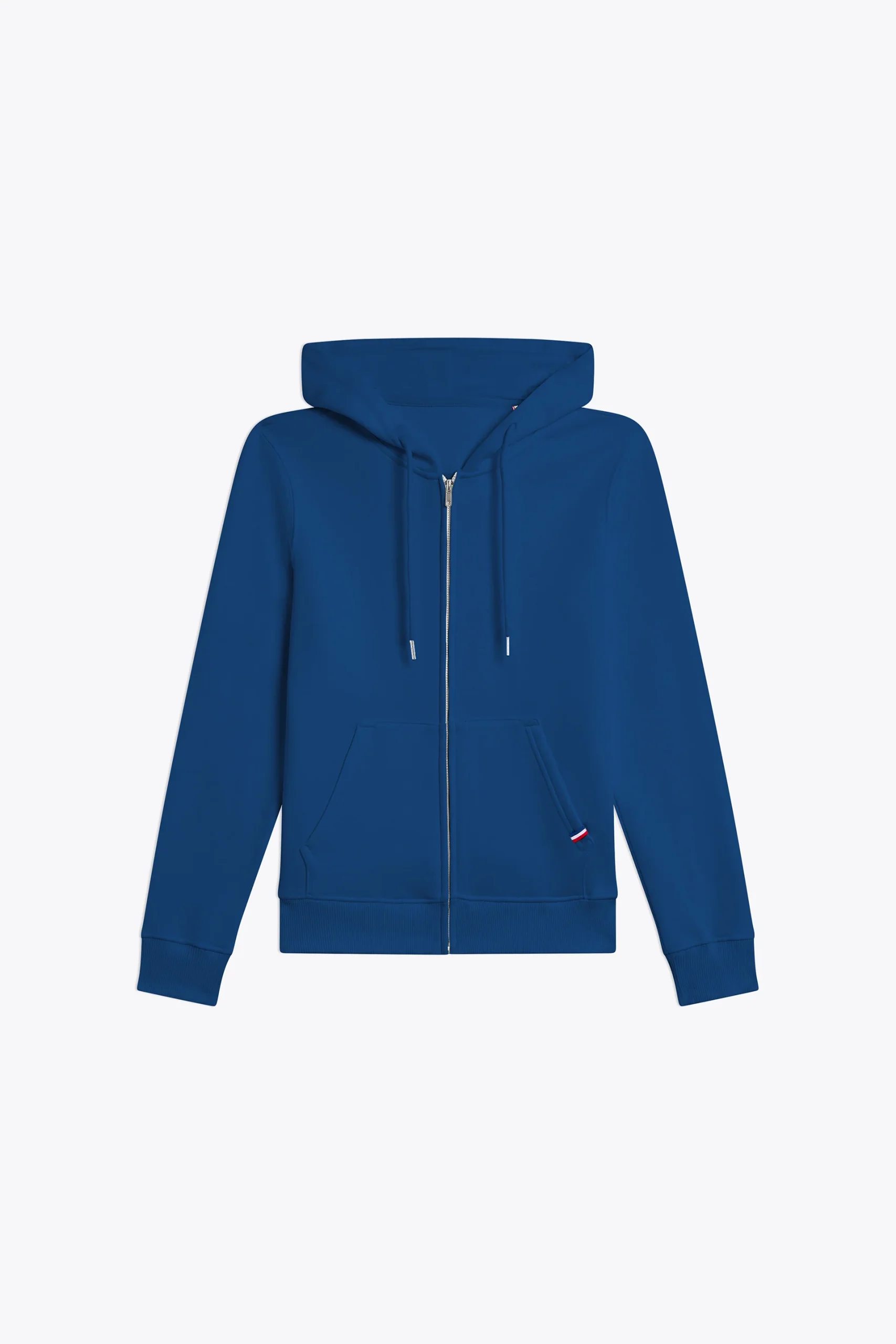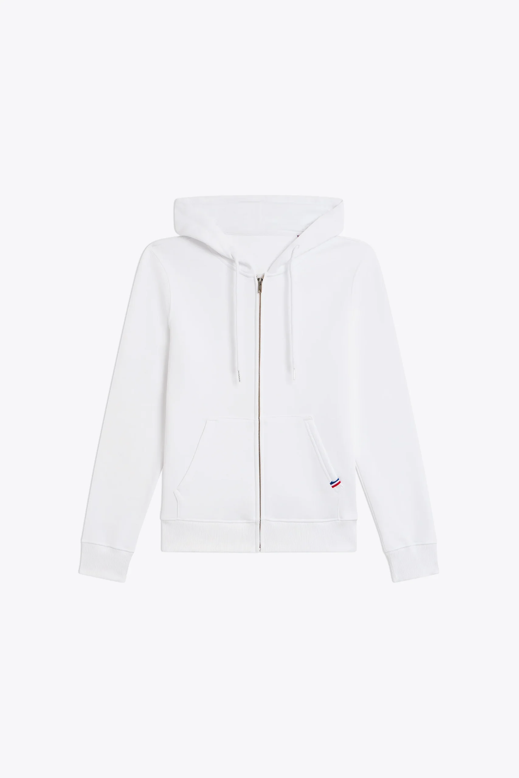 Coupe standard, coupé cousu, fermeture à glissière devant, capuche avec cordon embout métallique, bas des manches et du buste en bord cote 2×2, poche ventrale avec détail tricolore pincé poche gauche.