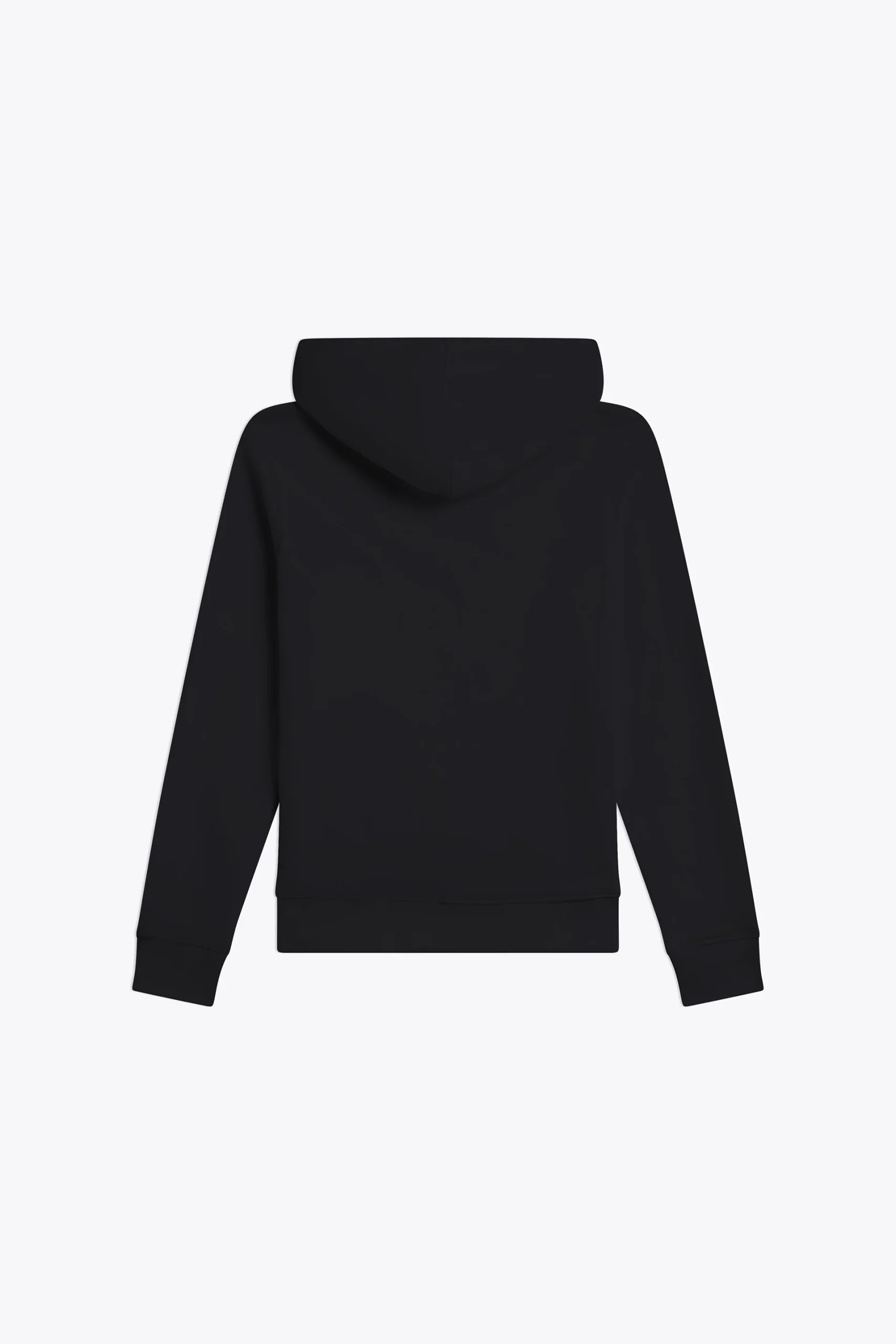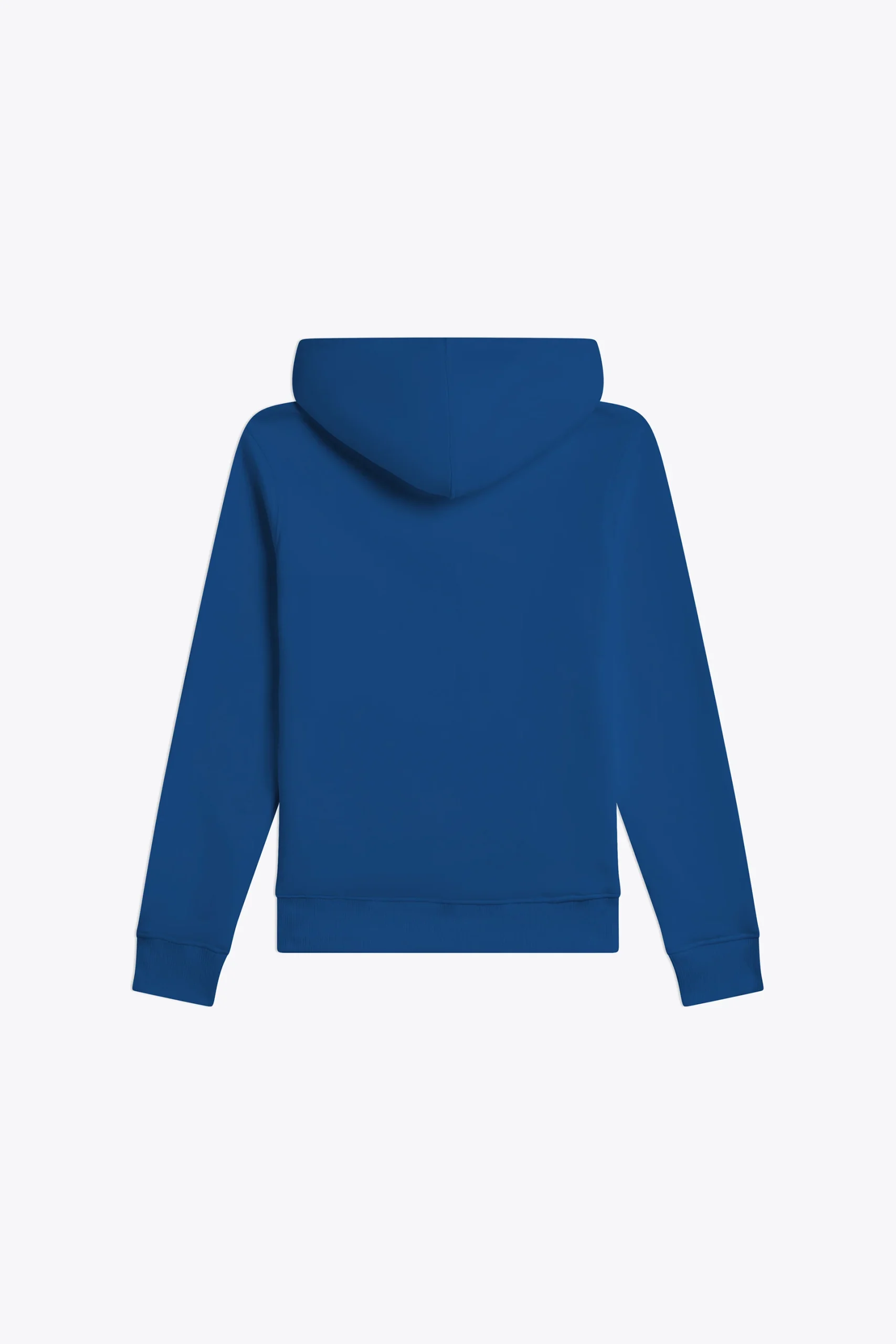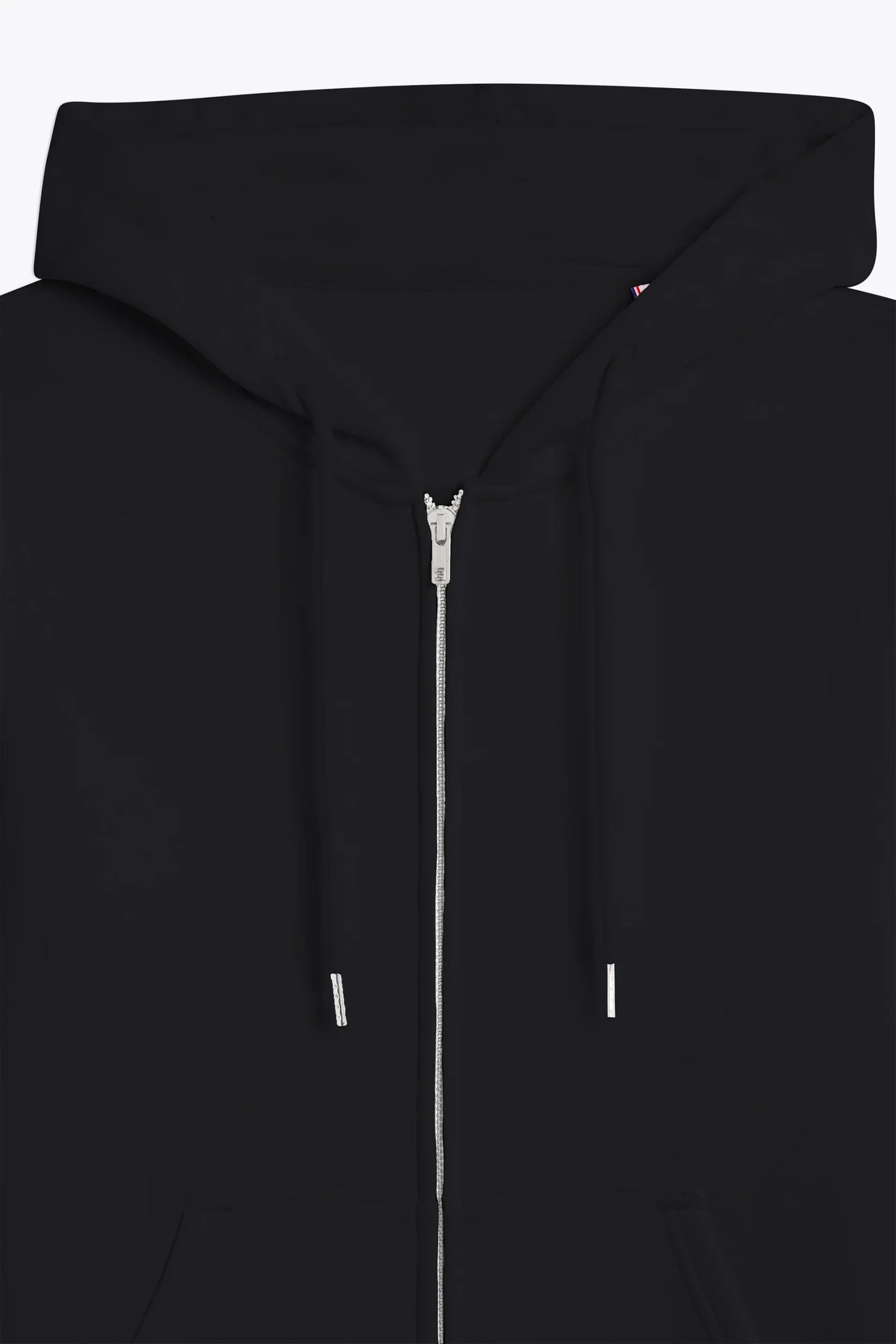 Coupe standard, coupé cousu, fermeture à glissière devant, capuche avec cordon embout métallique, bas des manches et du buste en bord cote 2×2, poche ventrale avec détail tricolore pincé poche gauche.