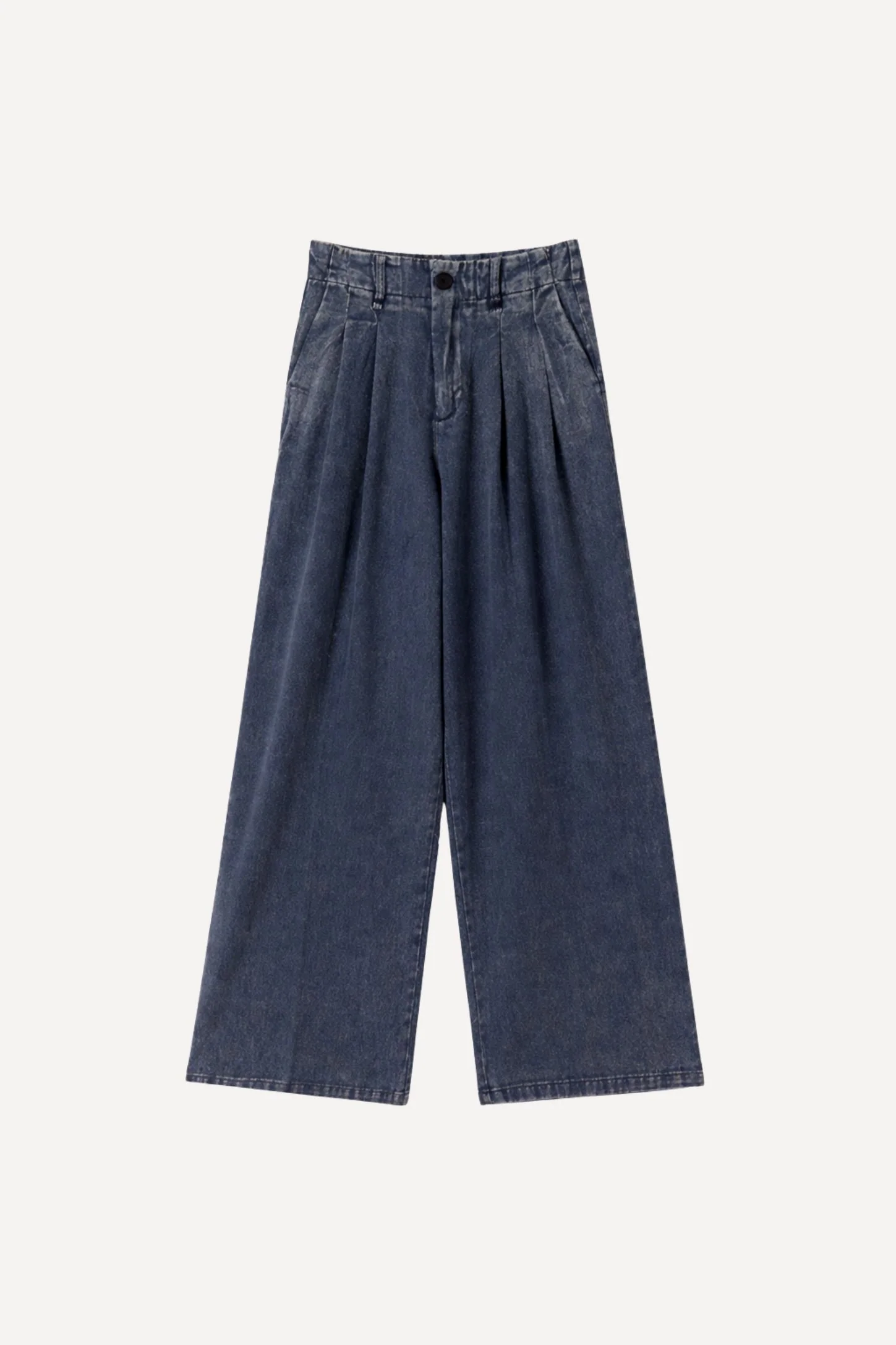 Sa coupe large et taille haute allonge la silhouette, tandis que ses plis marqués structurent le tombé pour un rendu à la fois décontracté et raffiné. Inspiré du tailoring, mais travaillé dans un denim brut, il conjugue confort et caractère.
