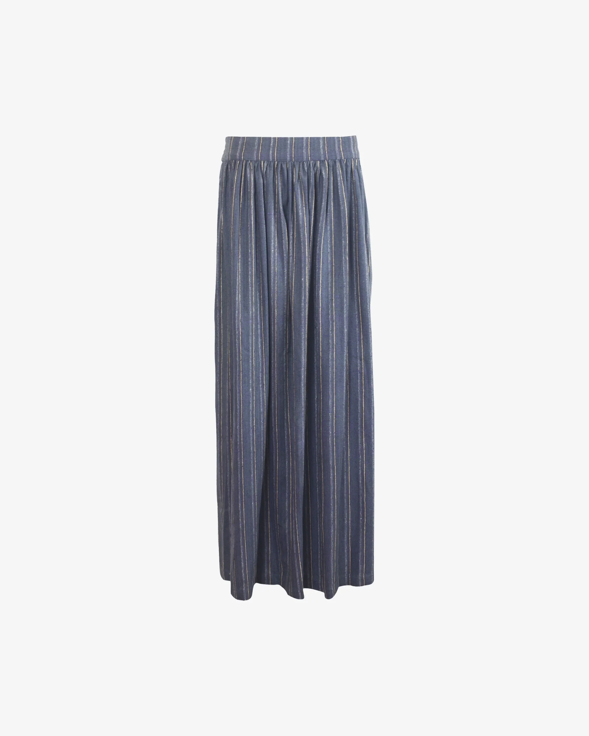 Cette jupe longue de couleur bleu acier se distingue par son élégance fluide et son tissu orné de fines rayures verticales dorées qui apportent une brillance subtile. Sa silhouette évasée est structurée par une taille haute élastiquée et délicatement froncée, offrant un volume généreux et un mouvement aérien à chaque pas.