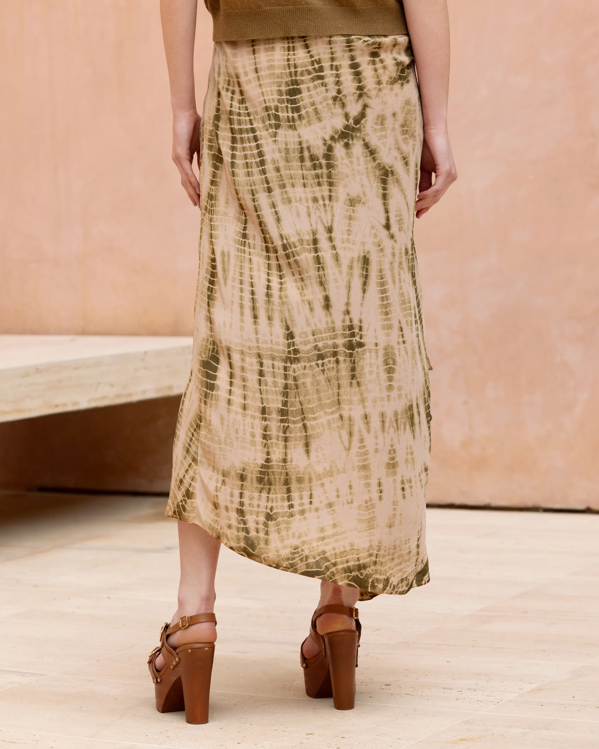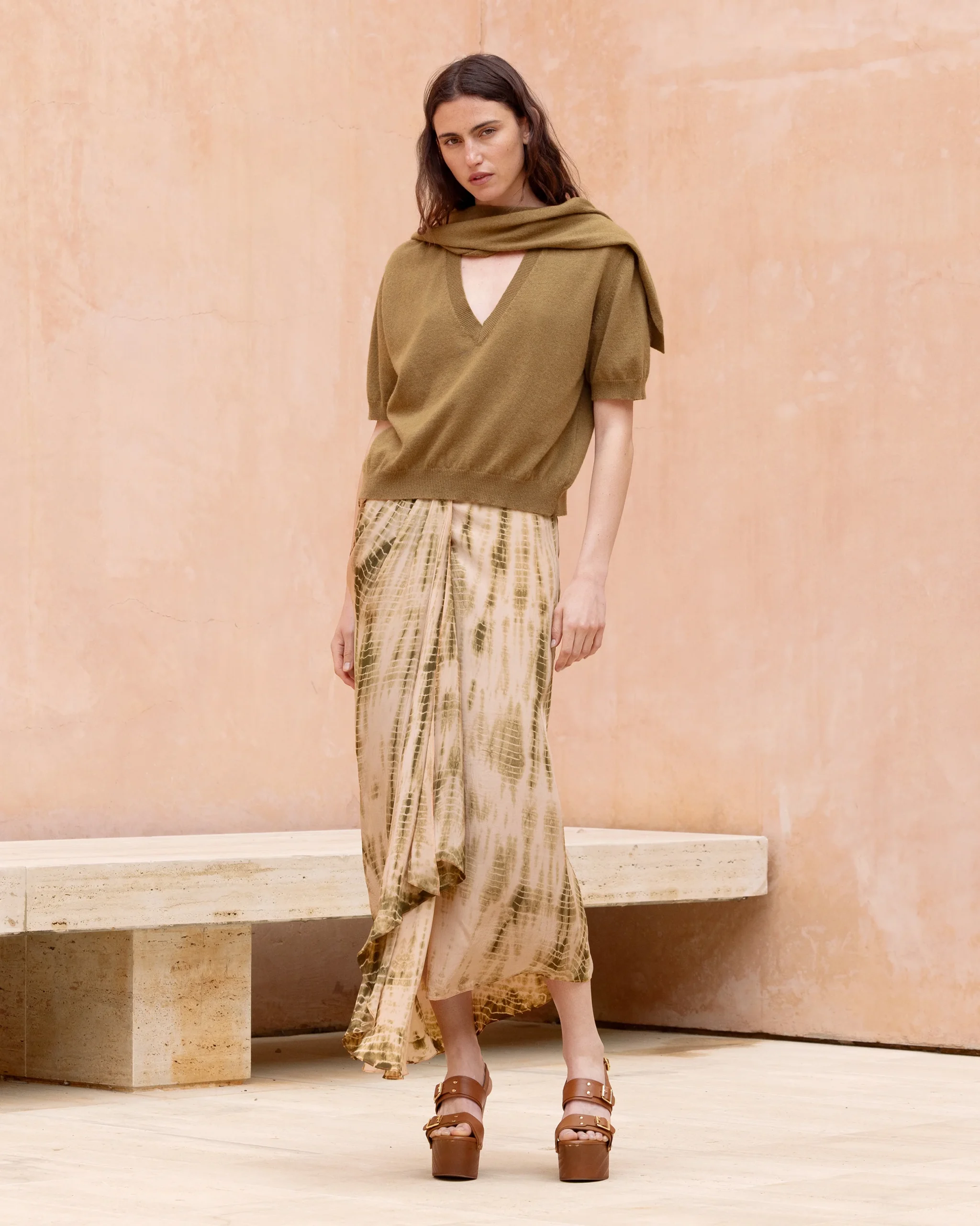 Cette jupe paréo légère et aérienne est pensée comme un drapé naturel autour de la silhouette. Le tissu, fluide et délicat, révèle un tie & dye kaki sur un fond rose poudré, pour une allure à la fois douce et contrastée. Le drapé sur le devant crée un joli mouvement, tandis qu’une fermeture zippée discrète sur le côté assure un maintien parfait. Une pièce élégante à l’esprit nomade, facile à associer pour un look libre et raffiné.