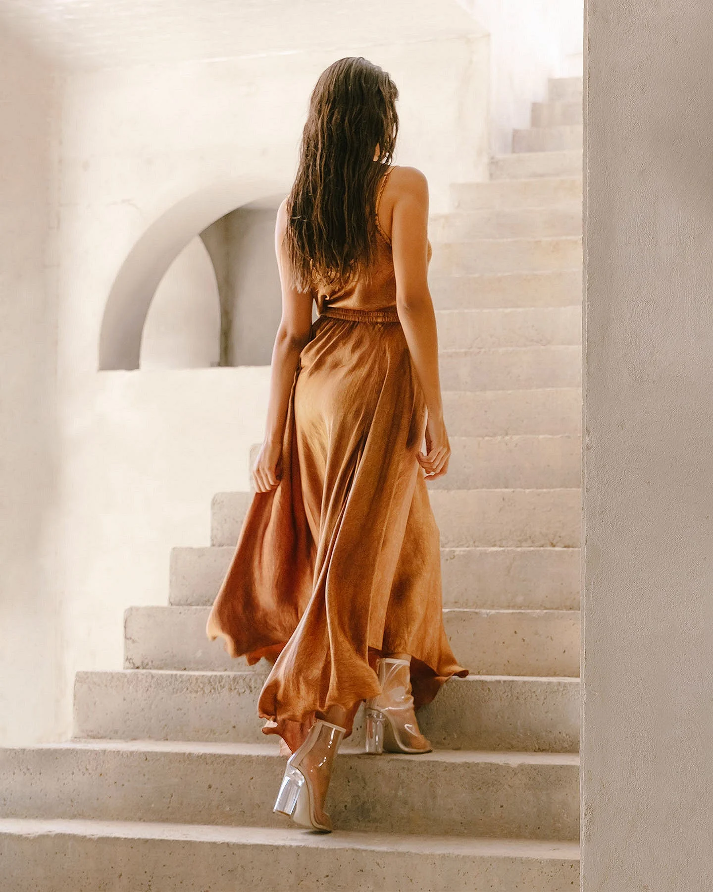 Notre jupe dans les tons bruns resplendit grâce à la fluidité de son tissu en satin de viscose lavée et ondoie à chaque pas. Son bas asymétrique plus court sur l’avant laisse entrevoir les chevilles pour plus de féminité. Sa taille parcourue d’un élastique permet un ajustement parfait.