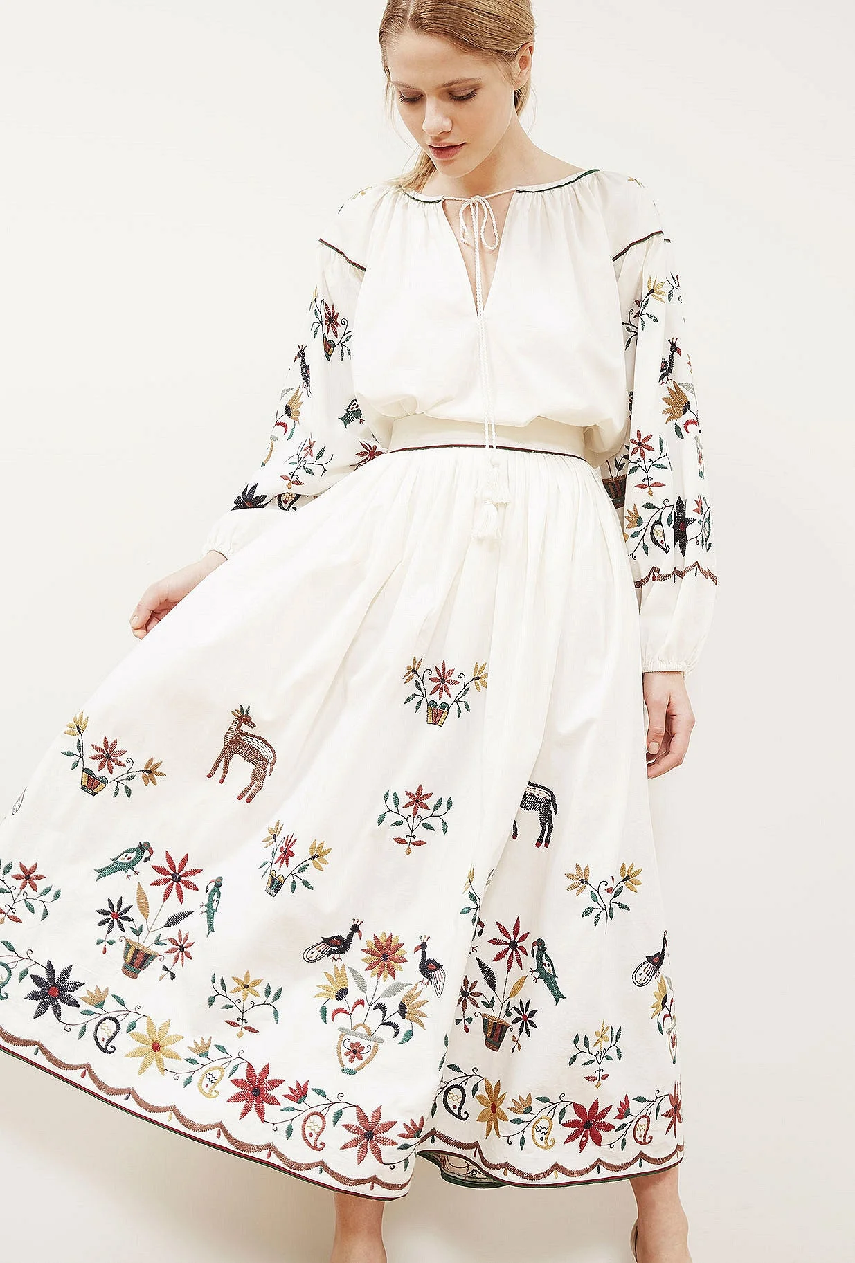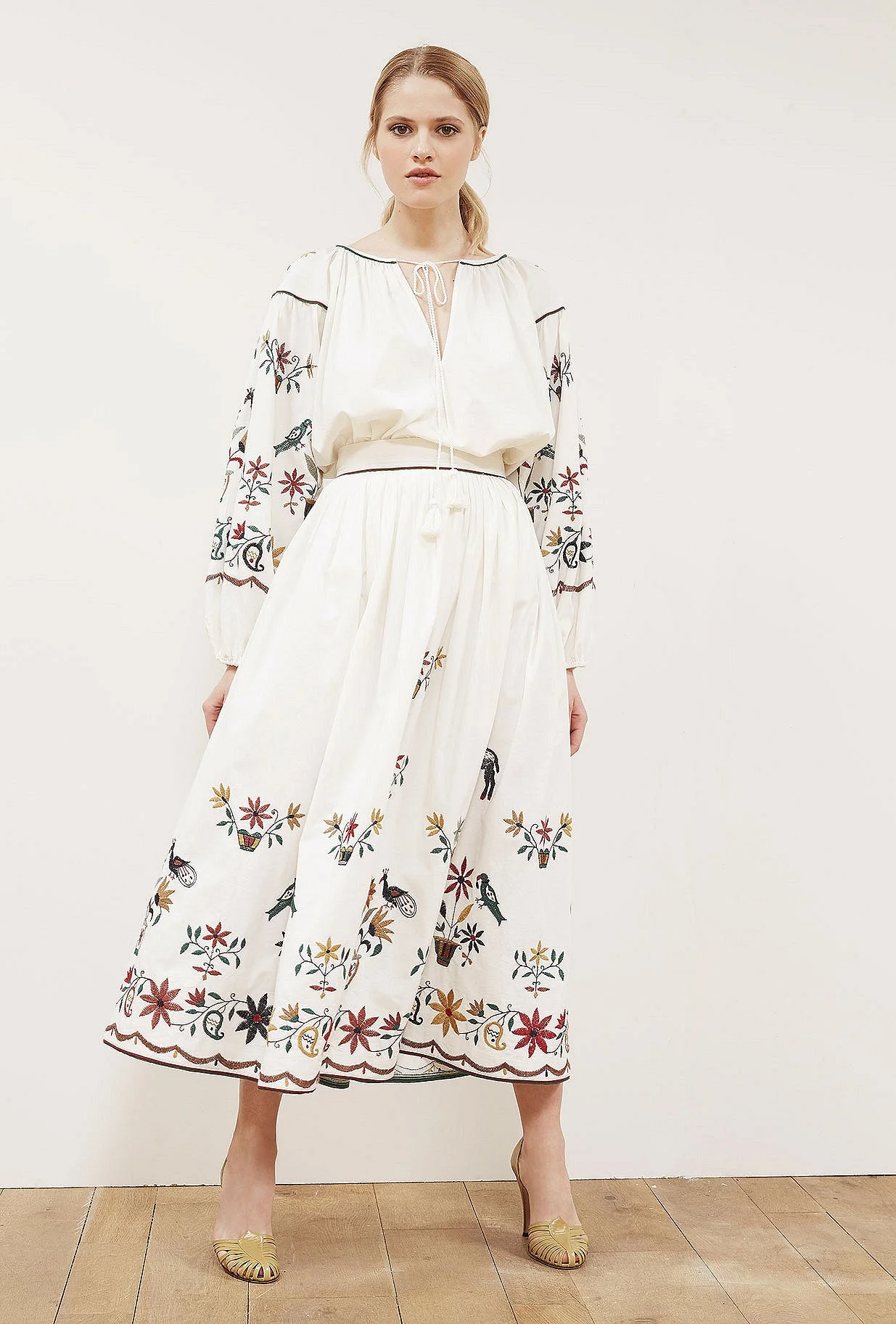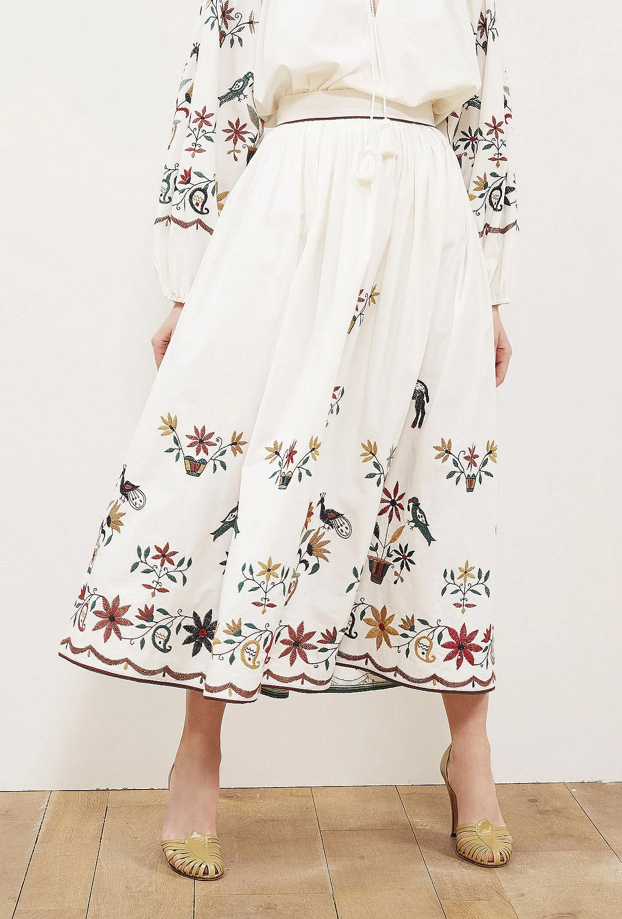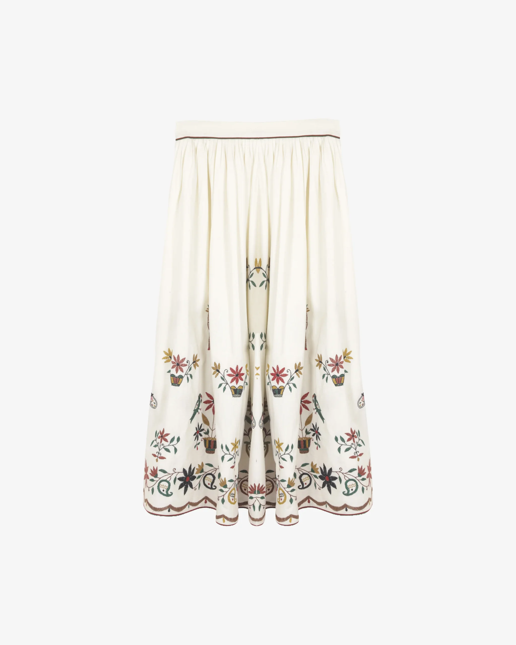 La jupe Gretel dégage un esprit indéniablement bohème grâce à sa silhouette voluptuese et fluide. Elle est faite d’un mélange de coton blanc ivoire et présente des broderies florales sur la longueur de l’ourlet.